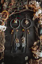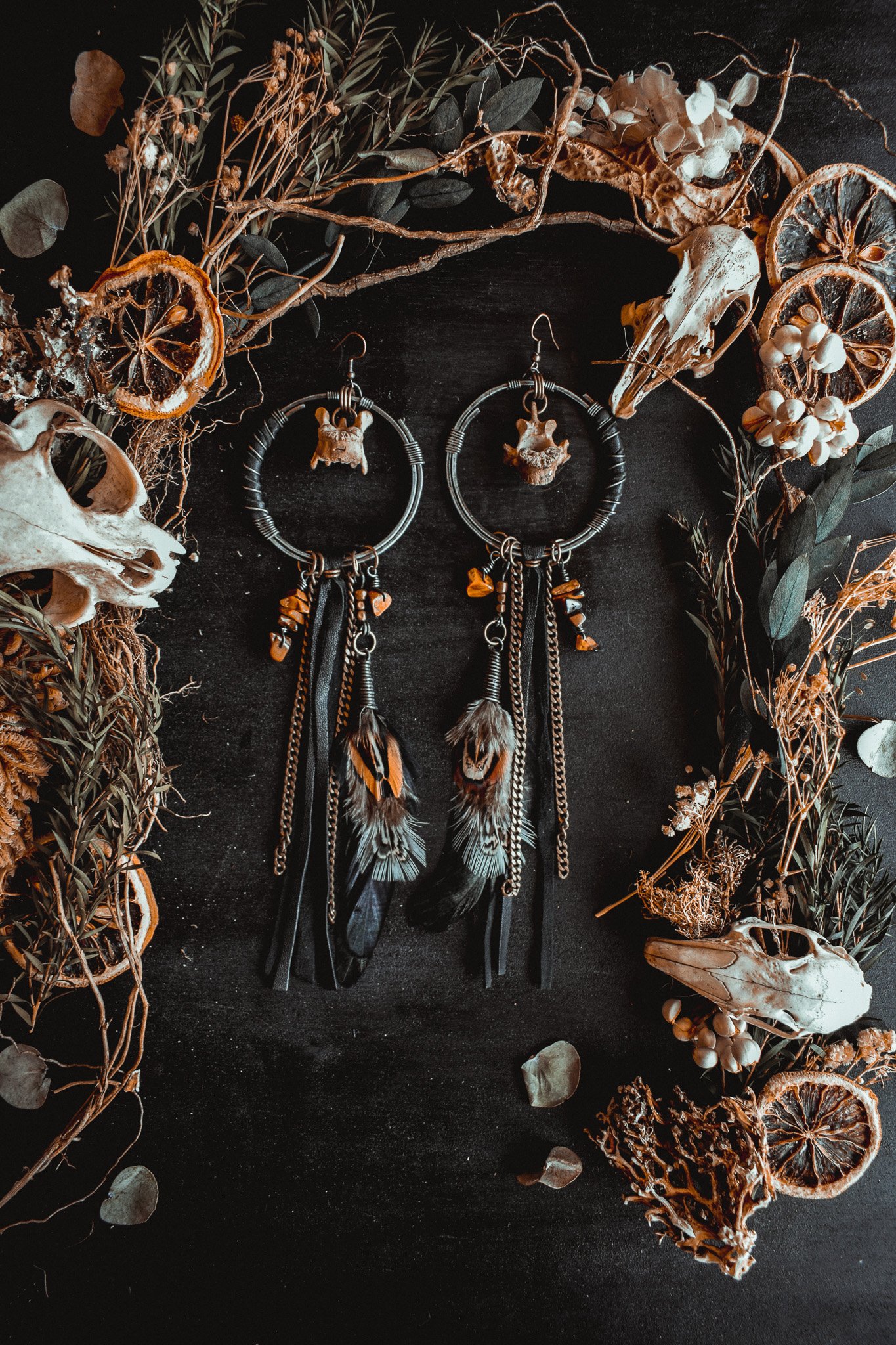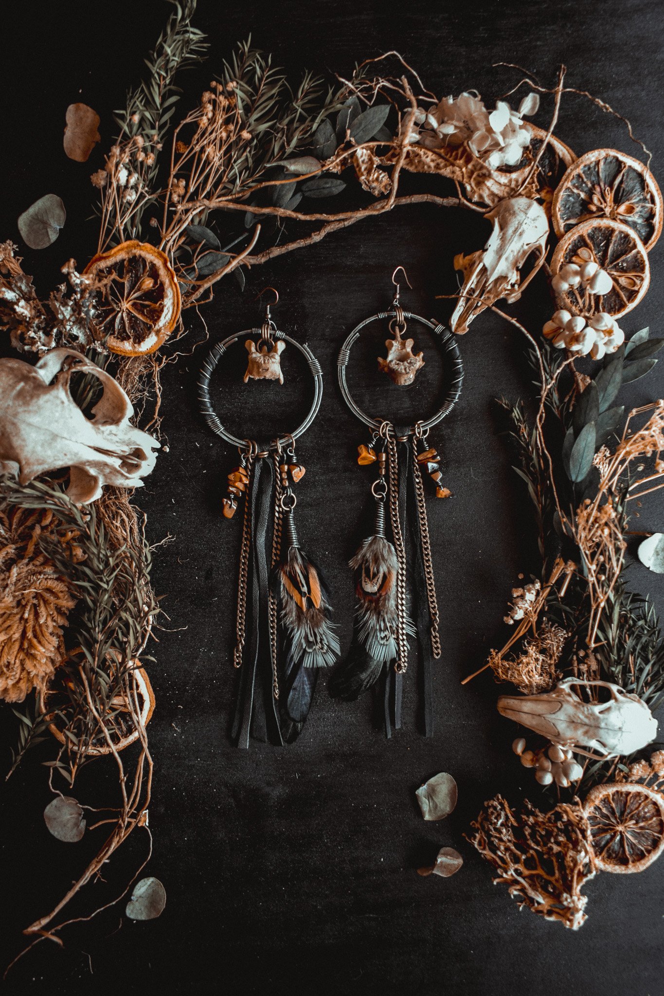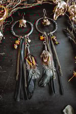 A pair of earrings created with hammered wire, salvaged beads, salvaged bones, leather and secondhand feathers.