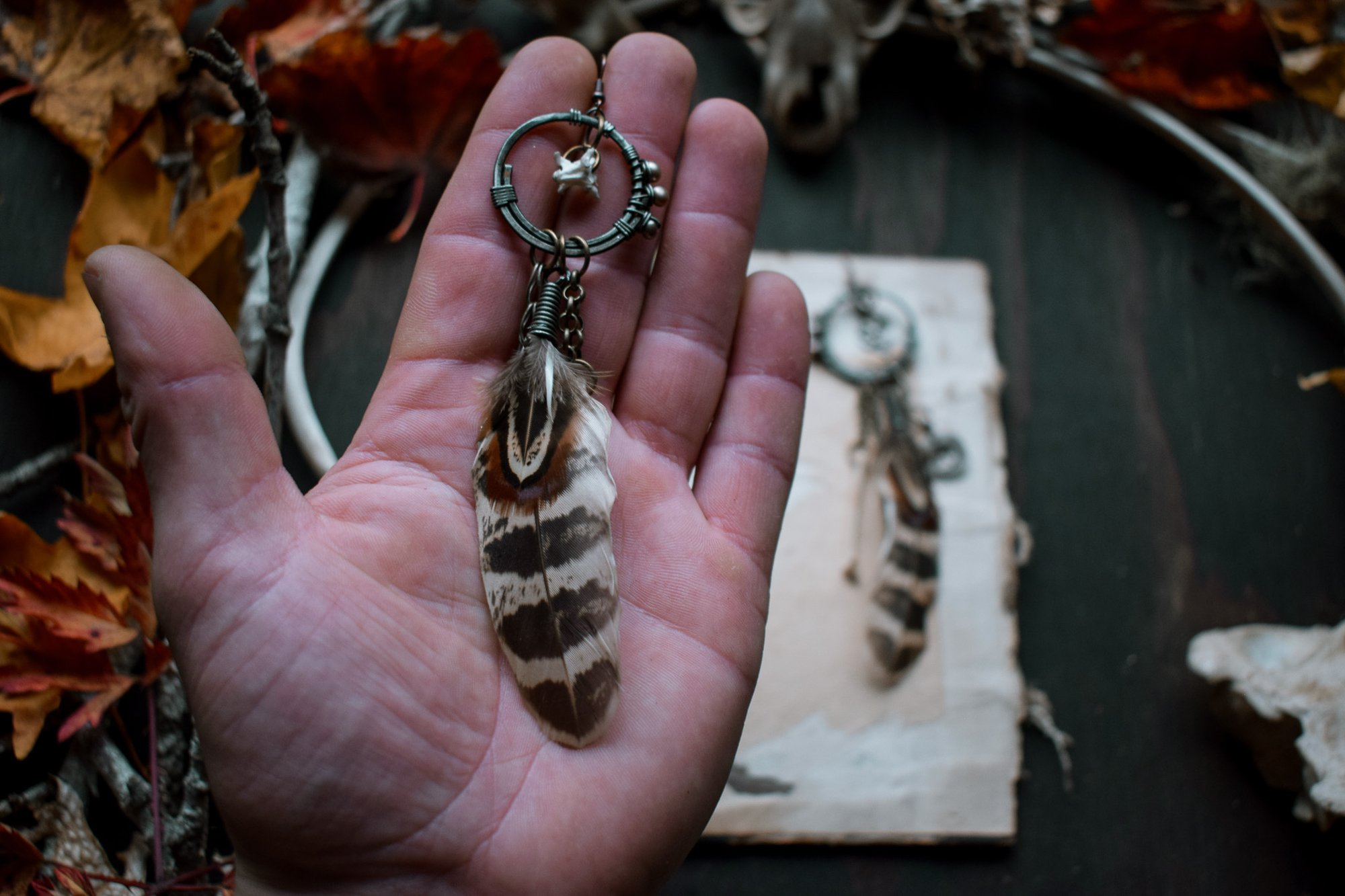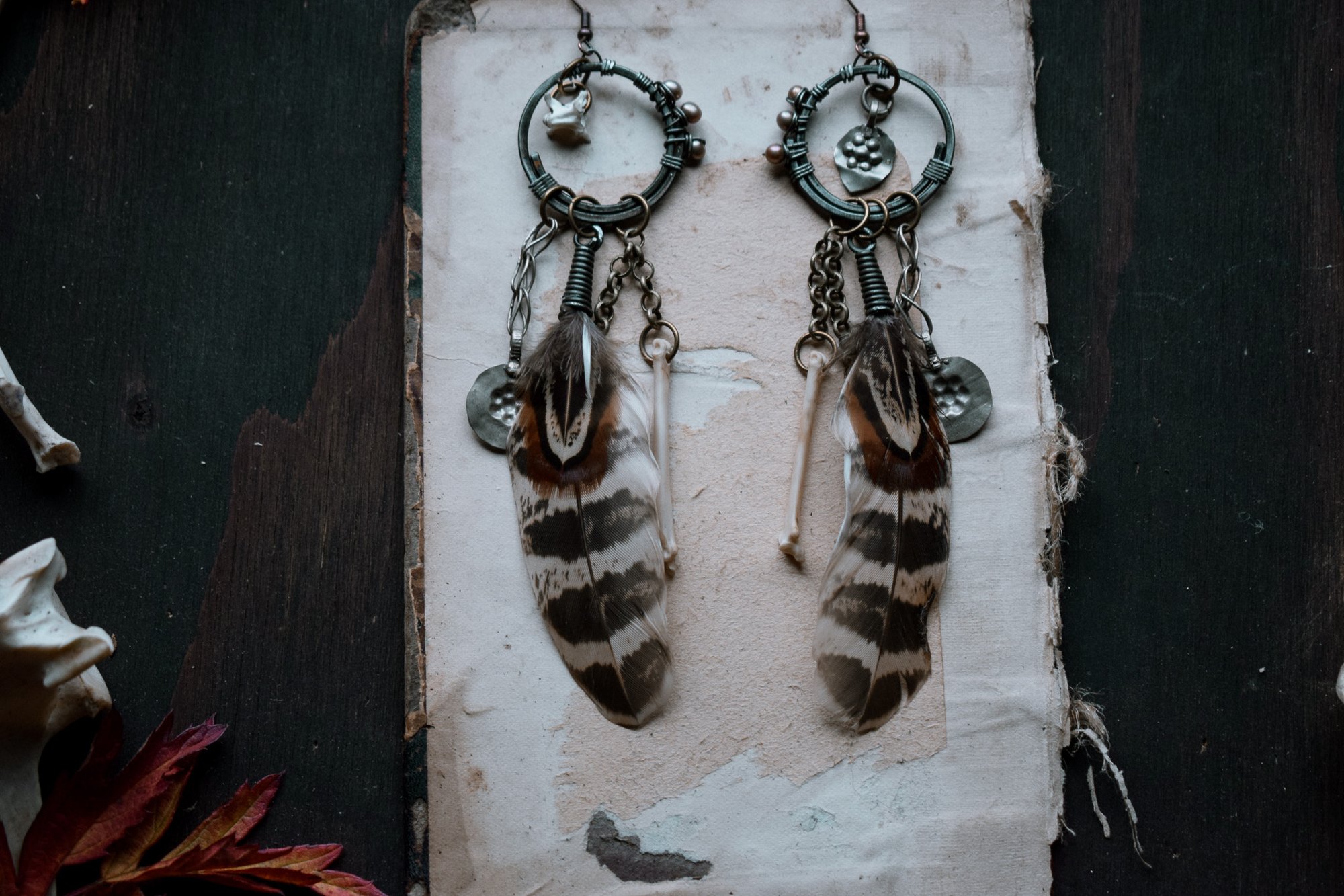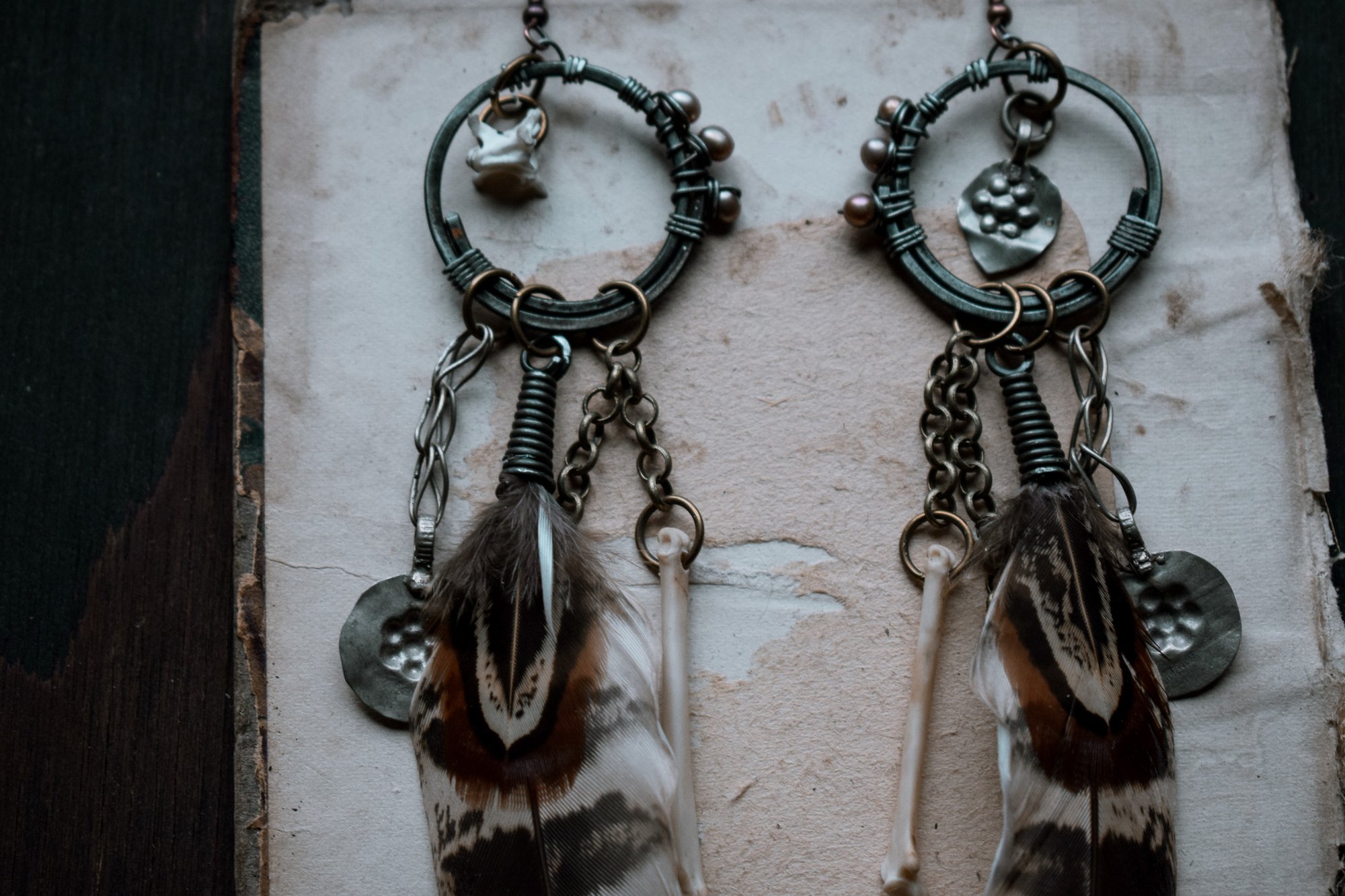 handmade bone and feather assemblage earrings
