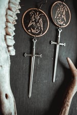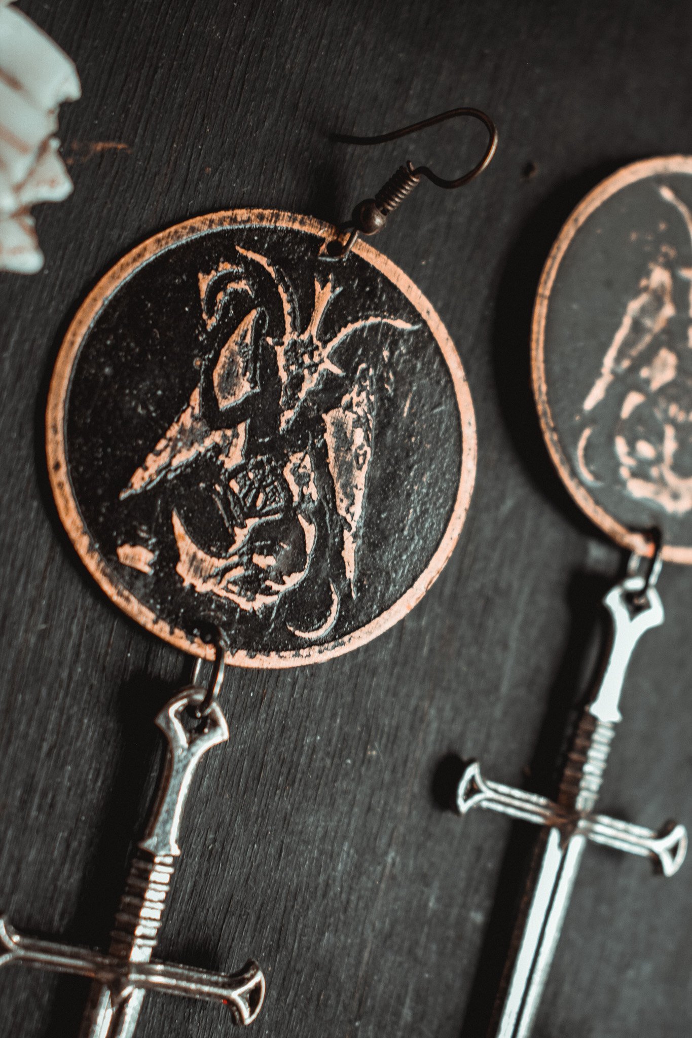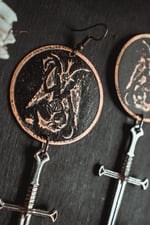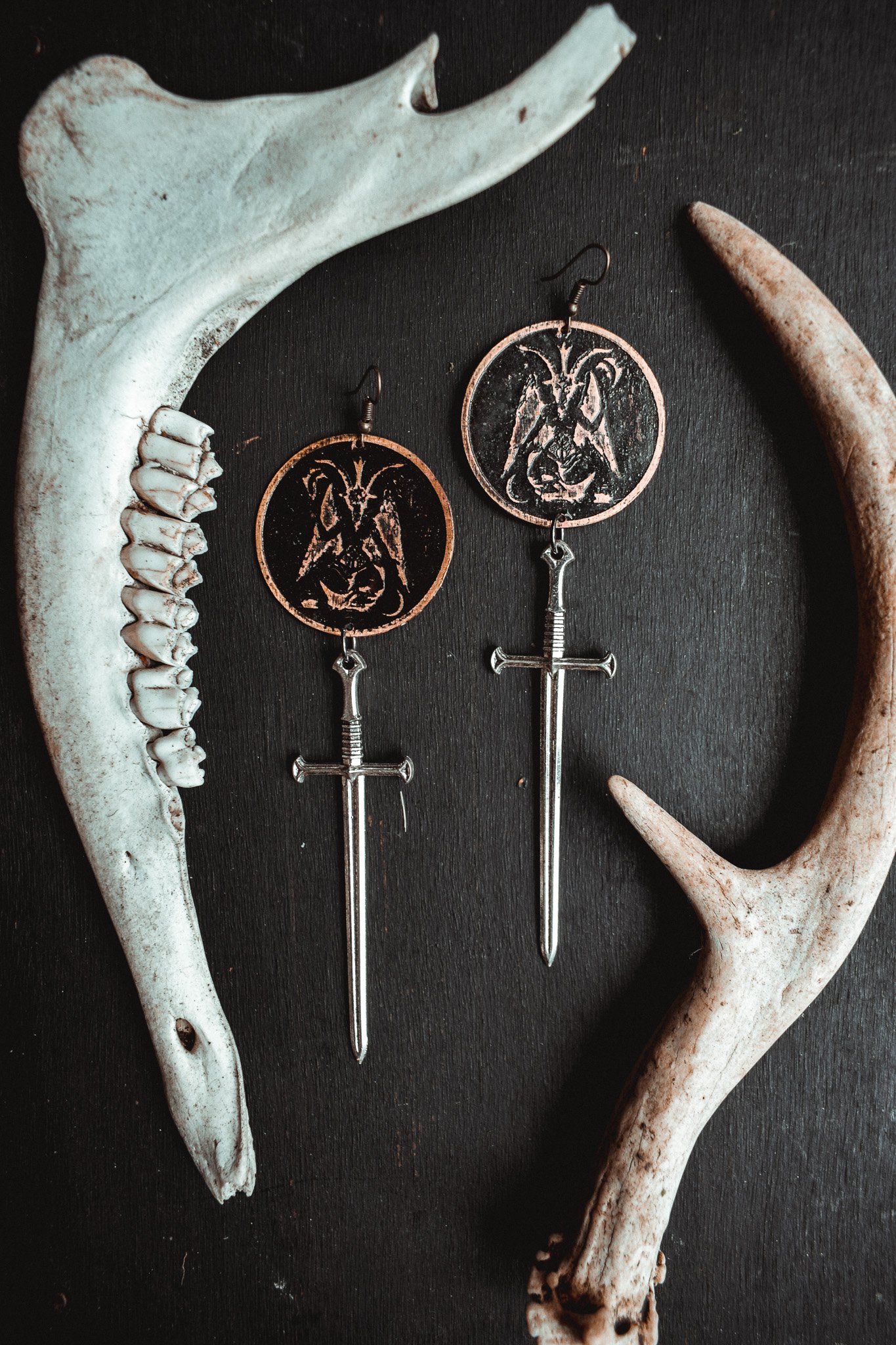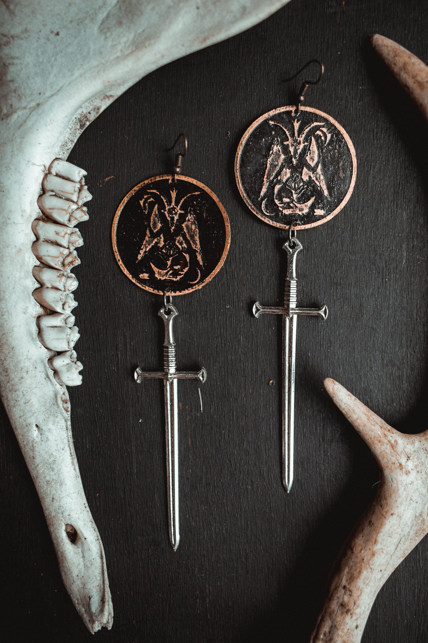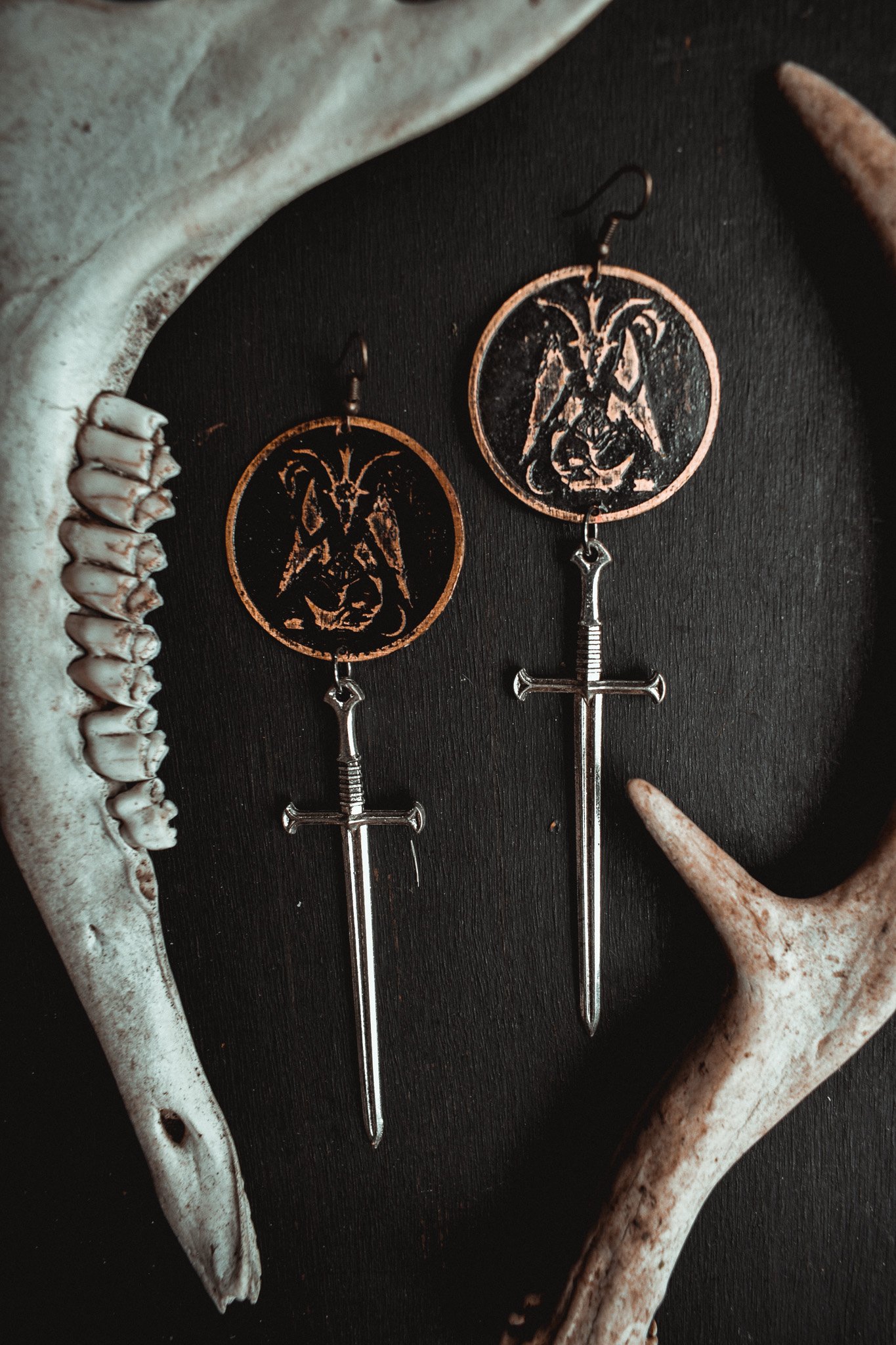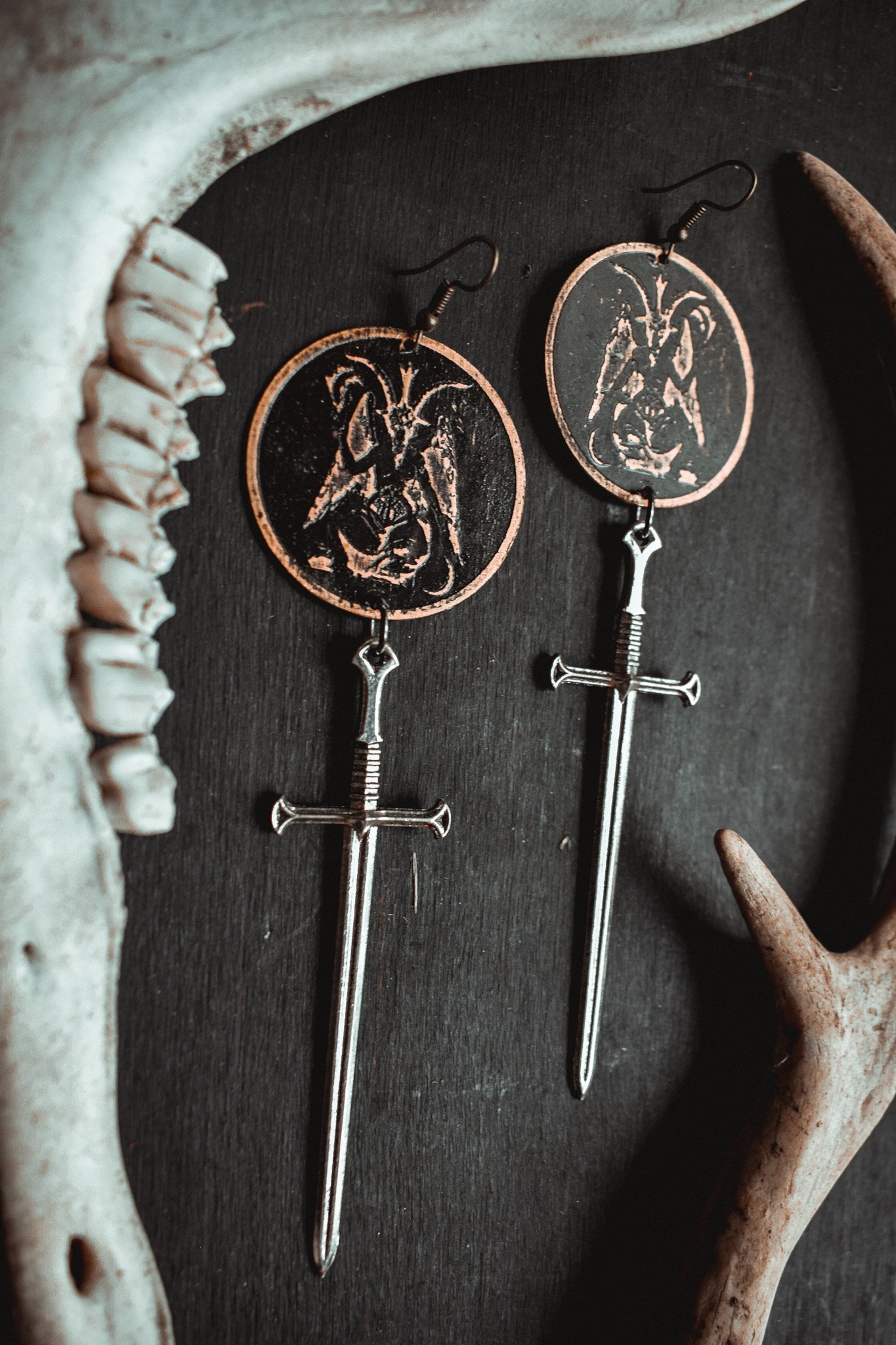 A pair of earrings created with hand crafted etched Baphomet charms adorned with sword charms.