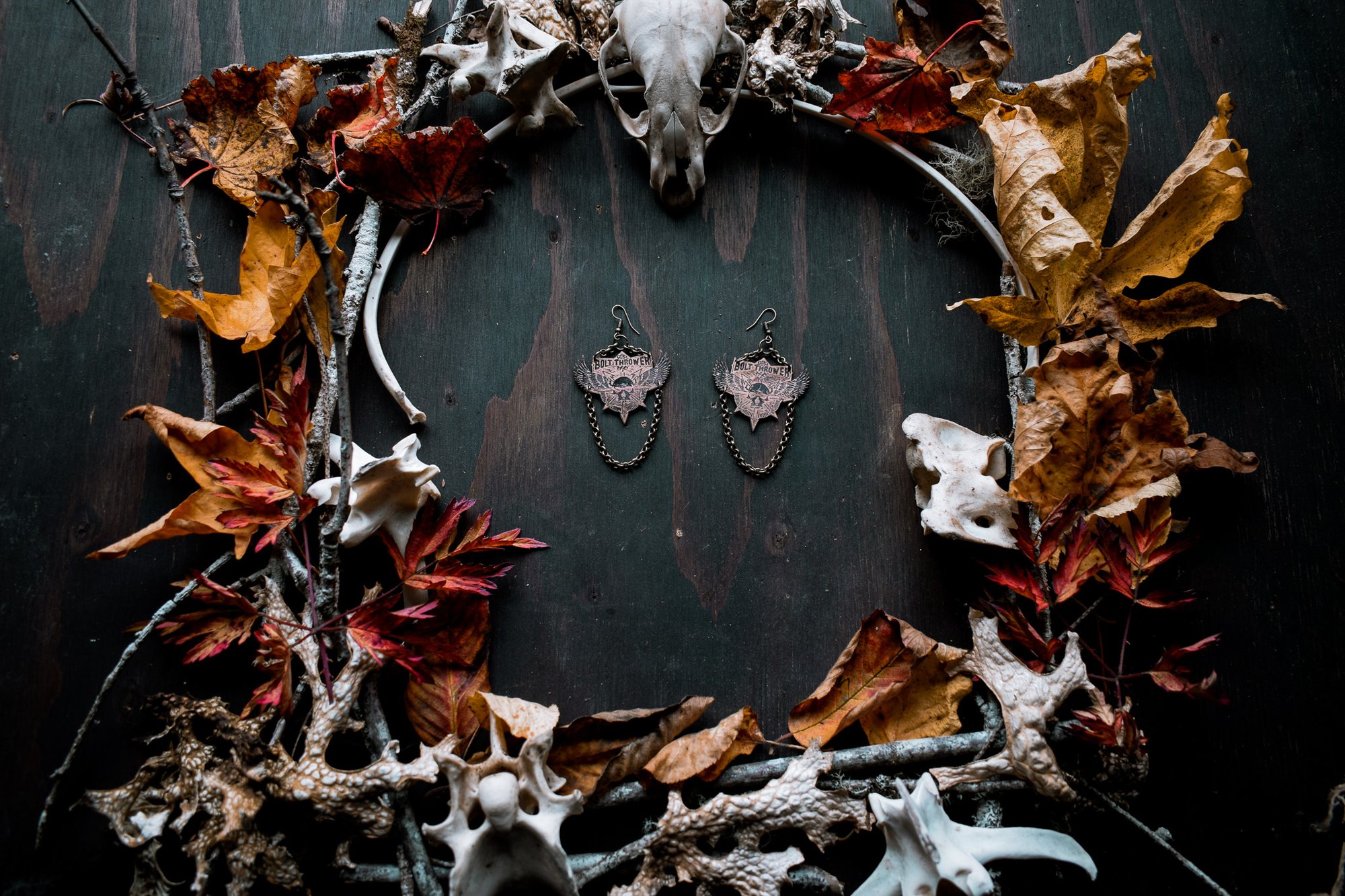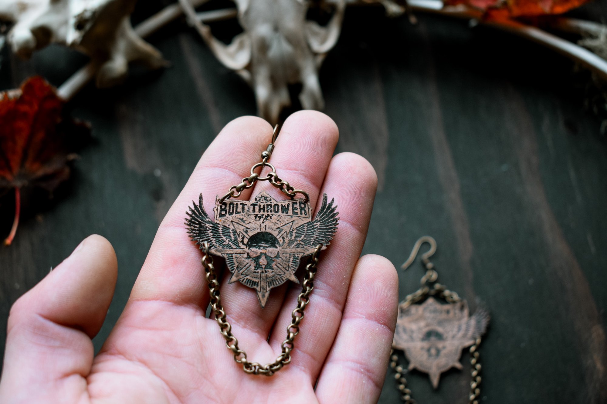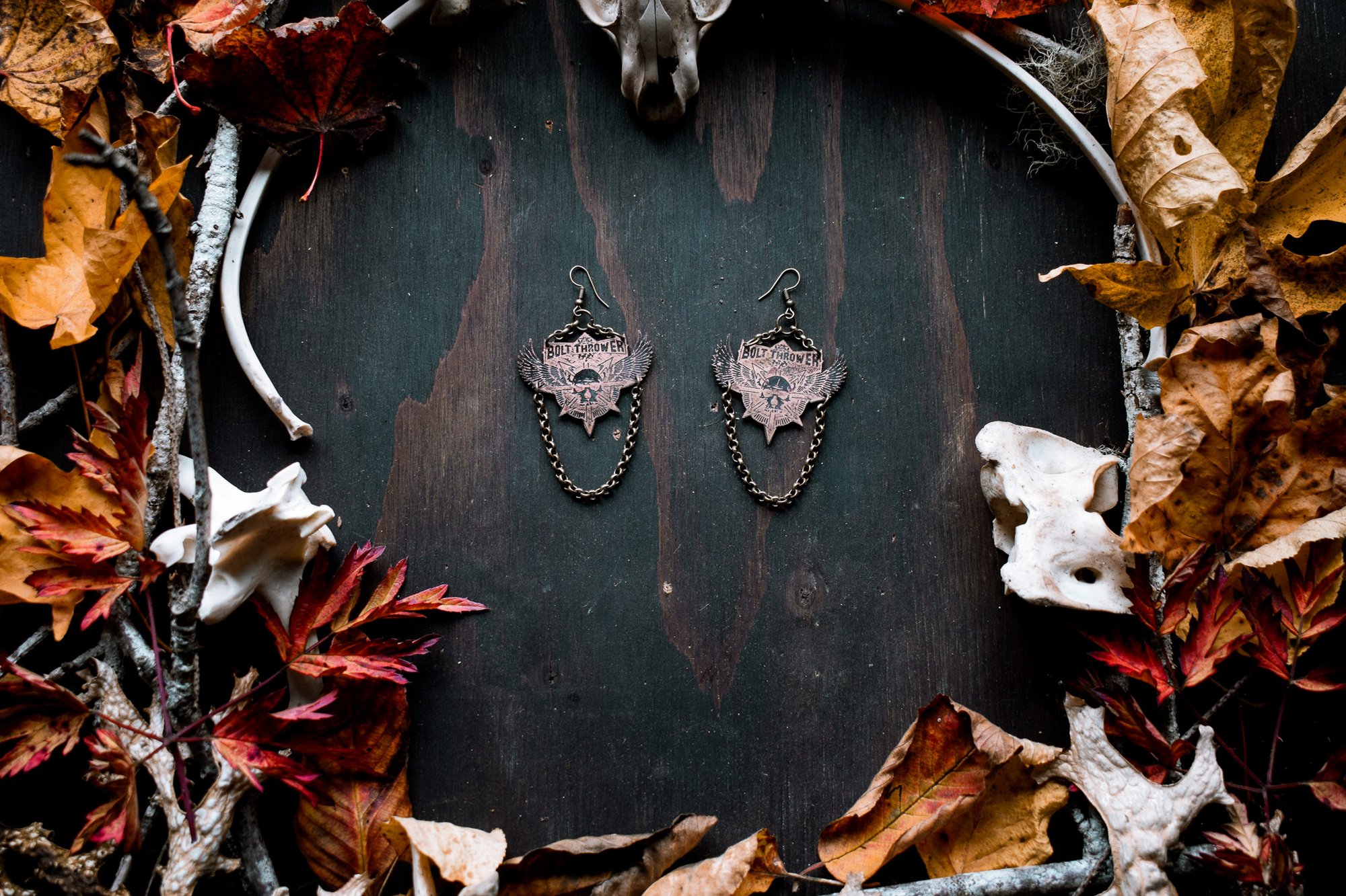 Bolt Thrower etched brass earrings