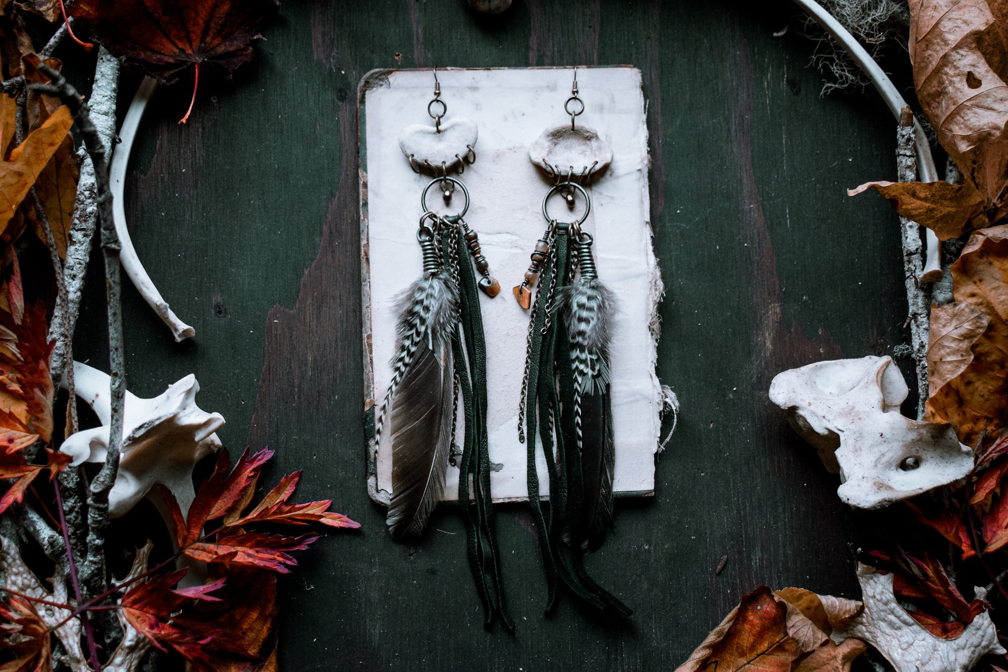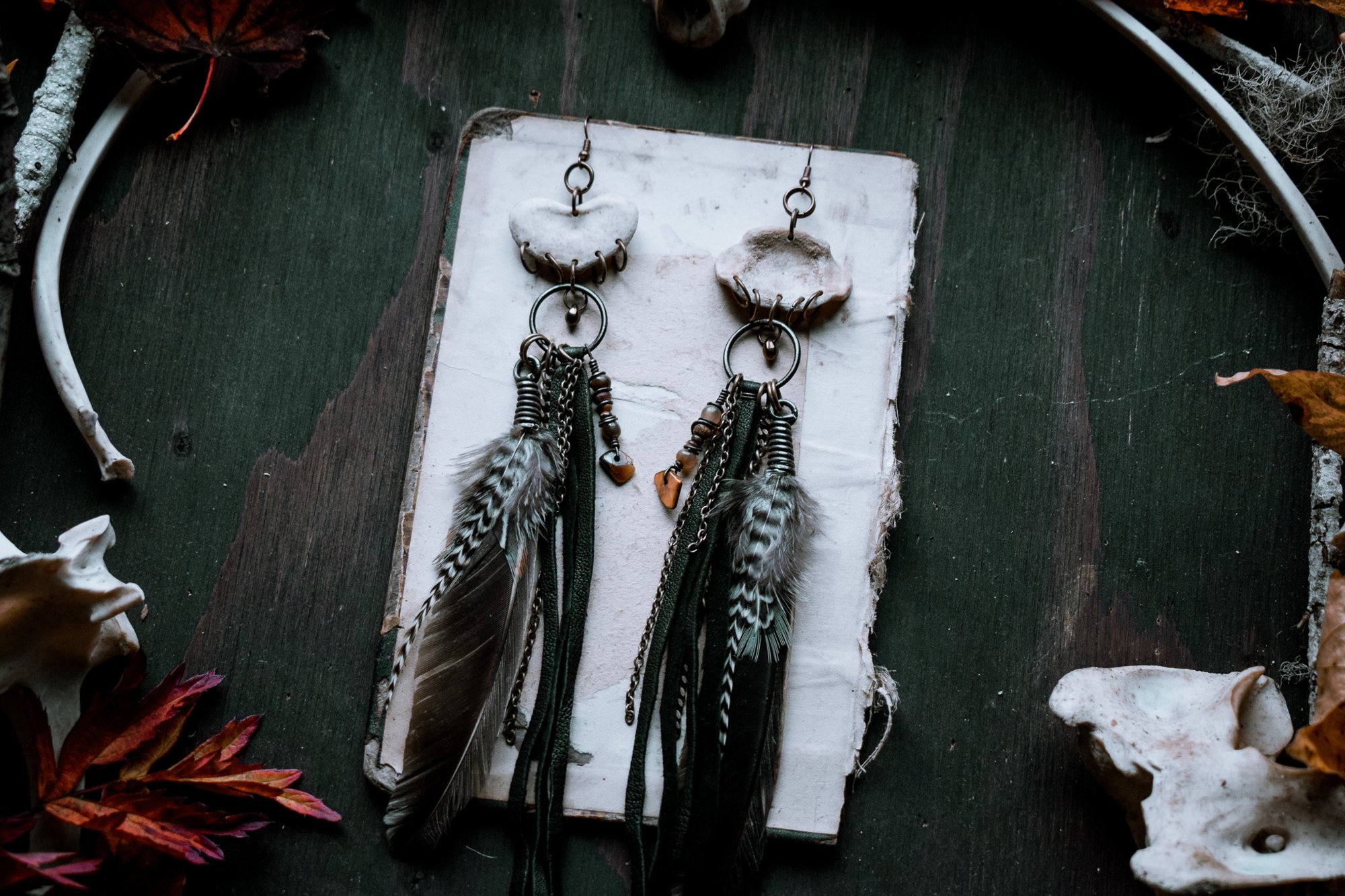 handmade bone, feather, leather fringe and bead assemblage earrings
