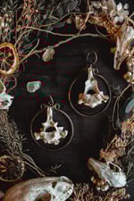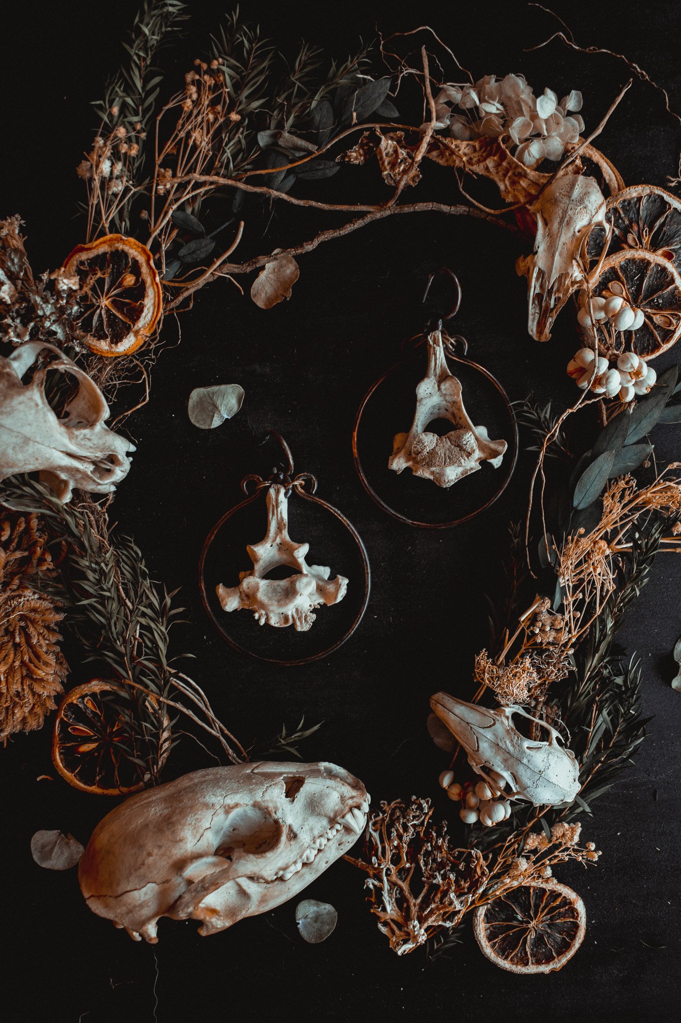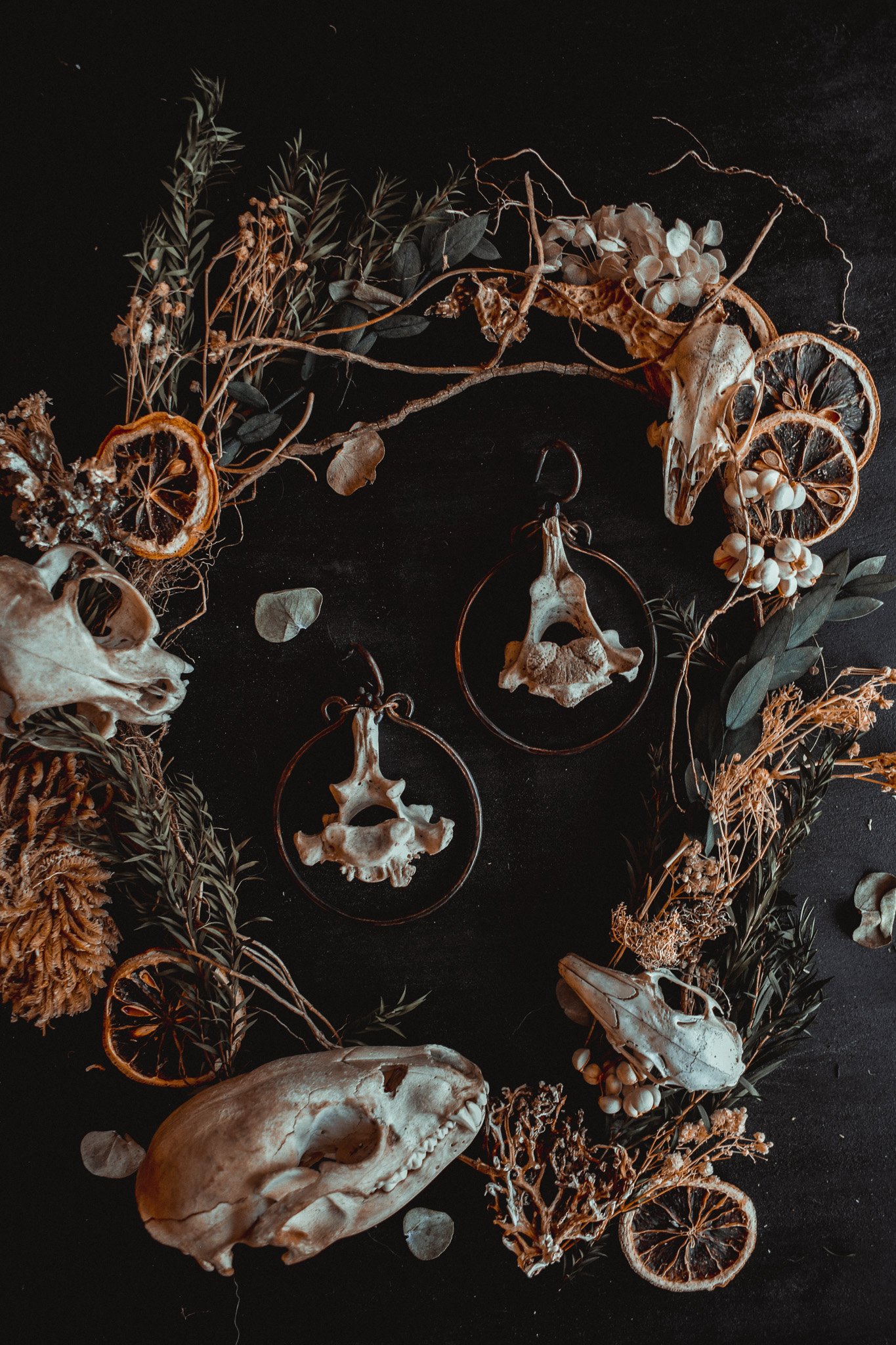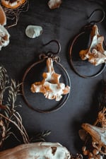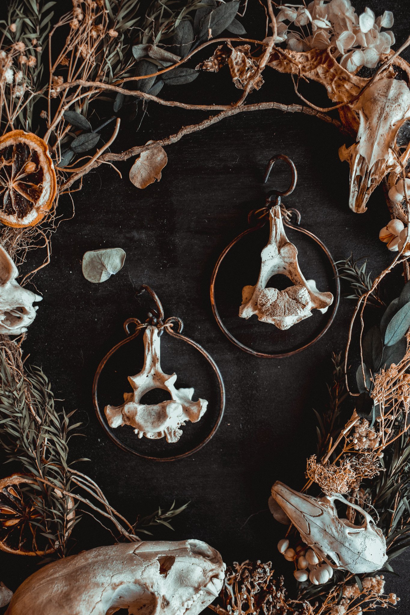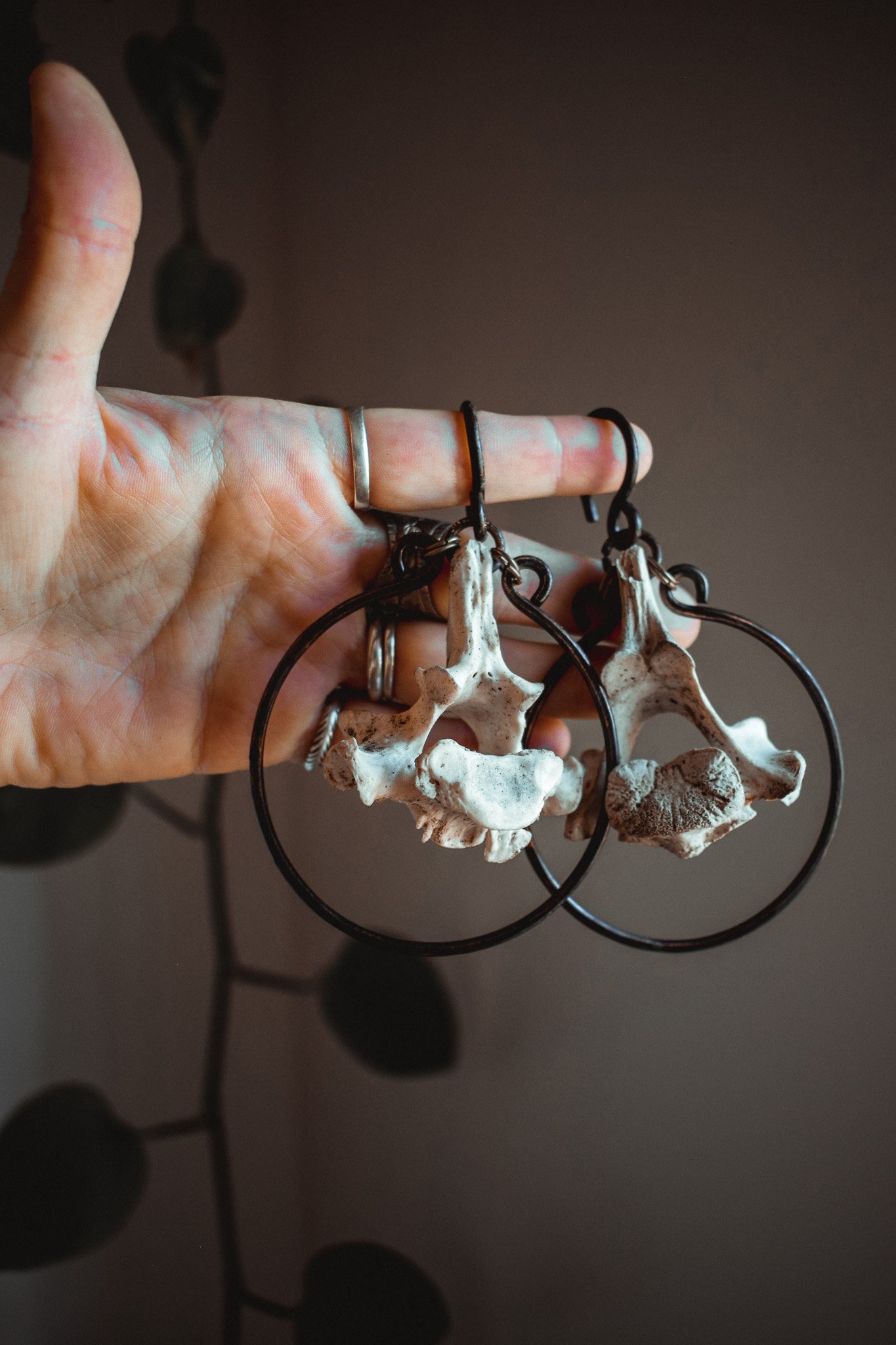 A pair of large ear hangers created with dark copper wire and salvaged vertebra bone.