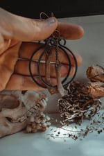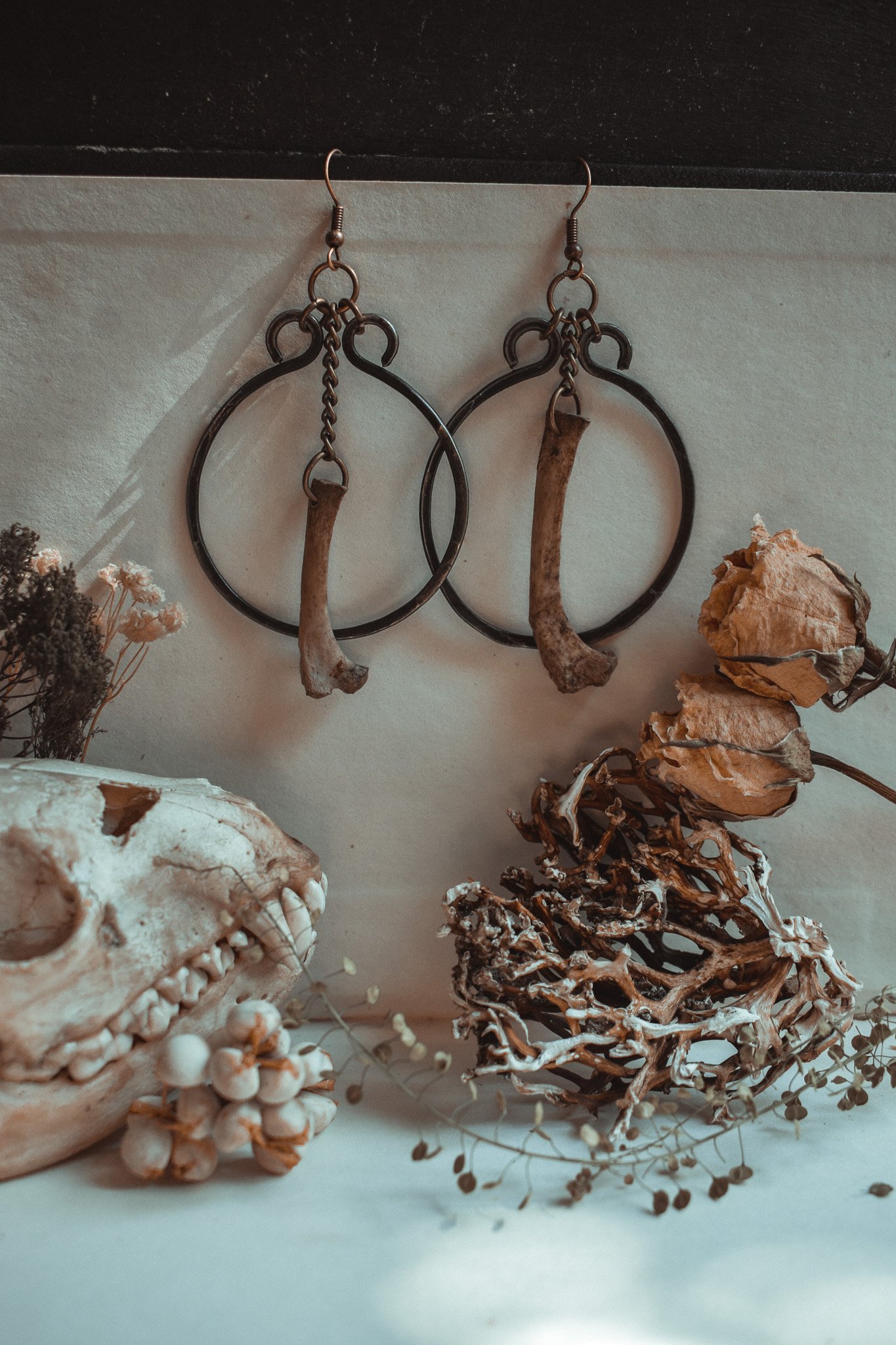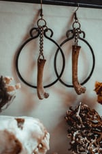 A pair of simple bone hoops created with hammered wire and salvaged raccoon bones.