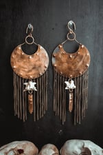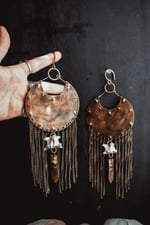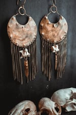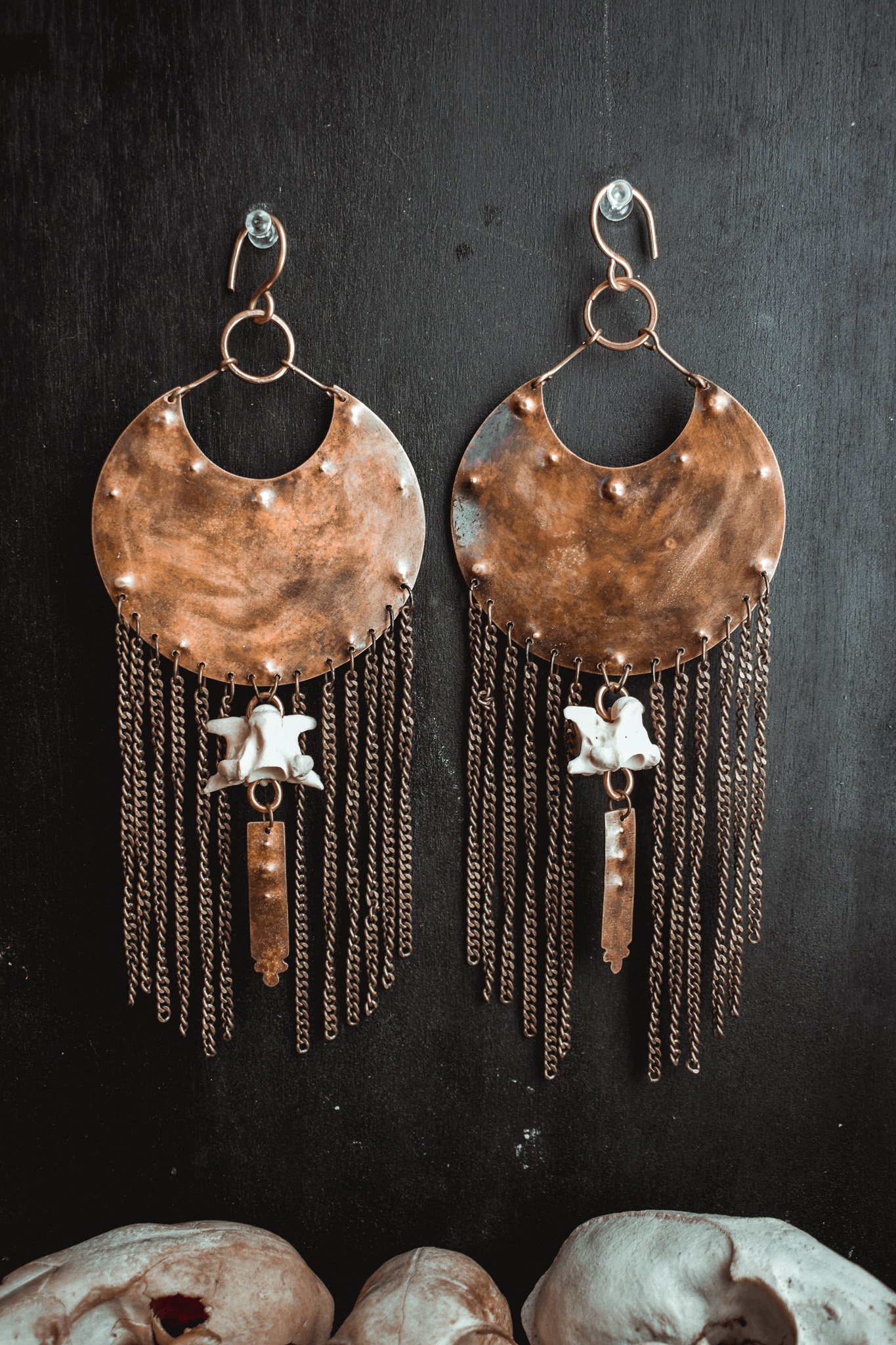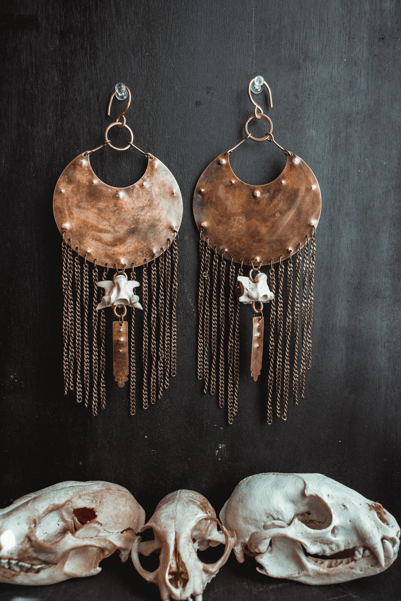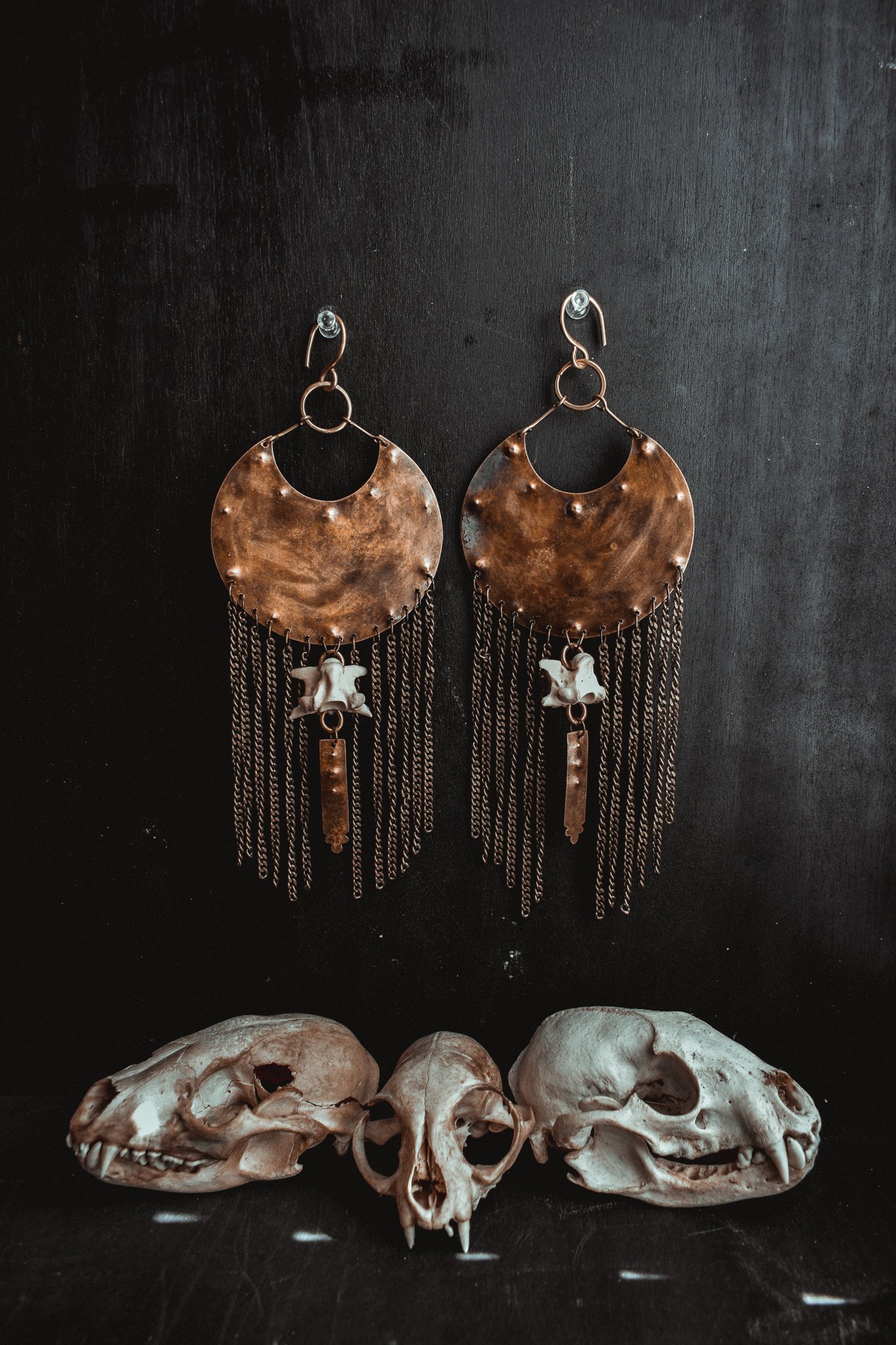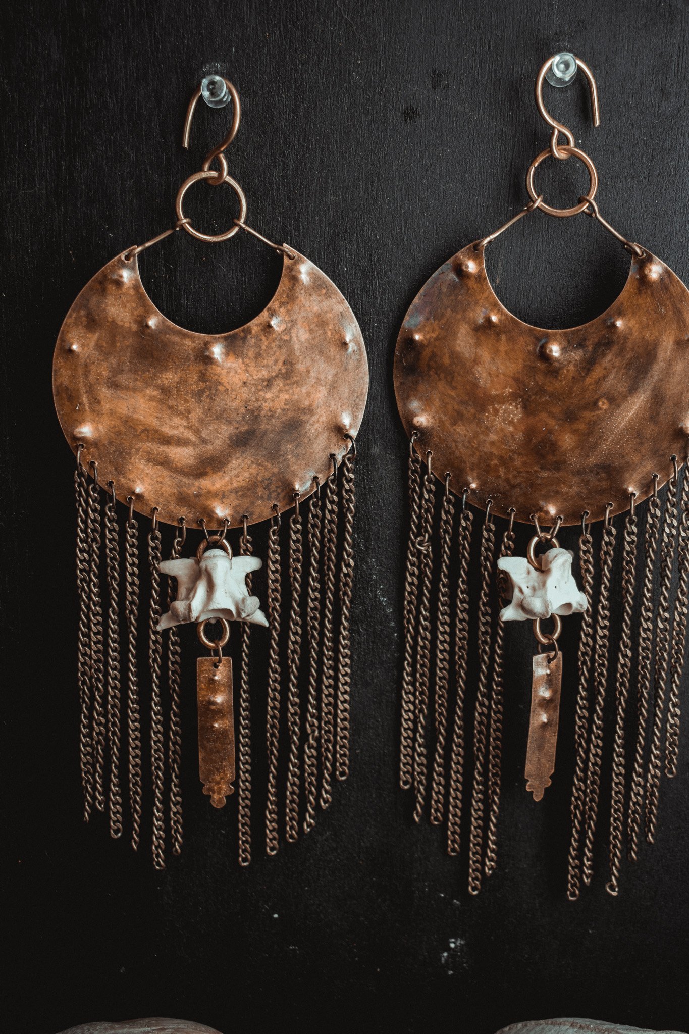 A pair of ear hangers created with hand cut bass charms adorned in layers of brass chains and large vertebra bone.