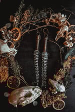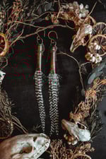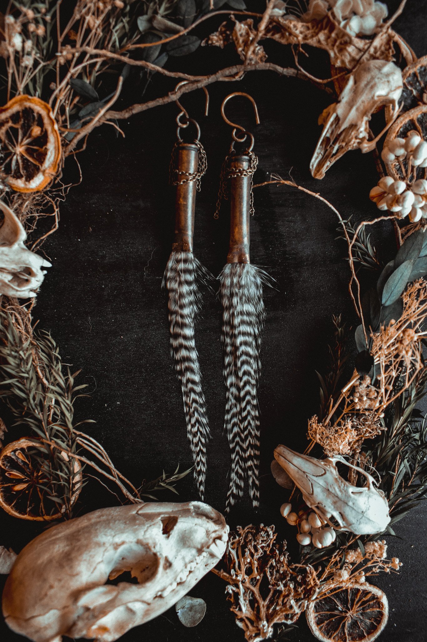Ear hangers created with long grizzly feathers and salvaged bullet shells.