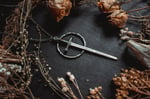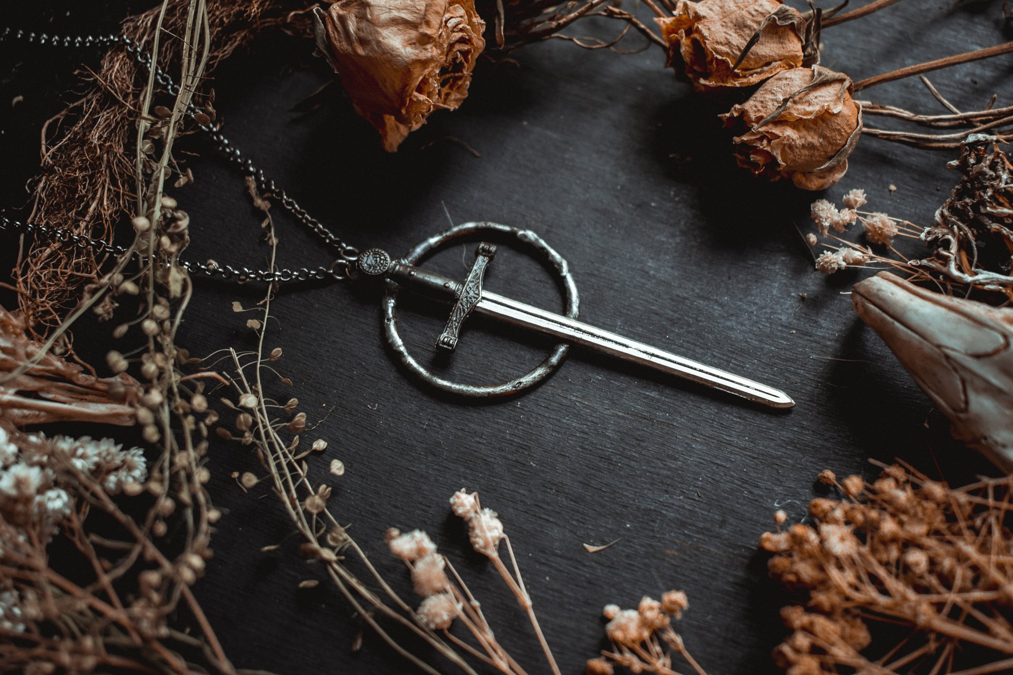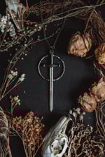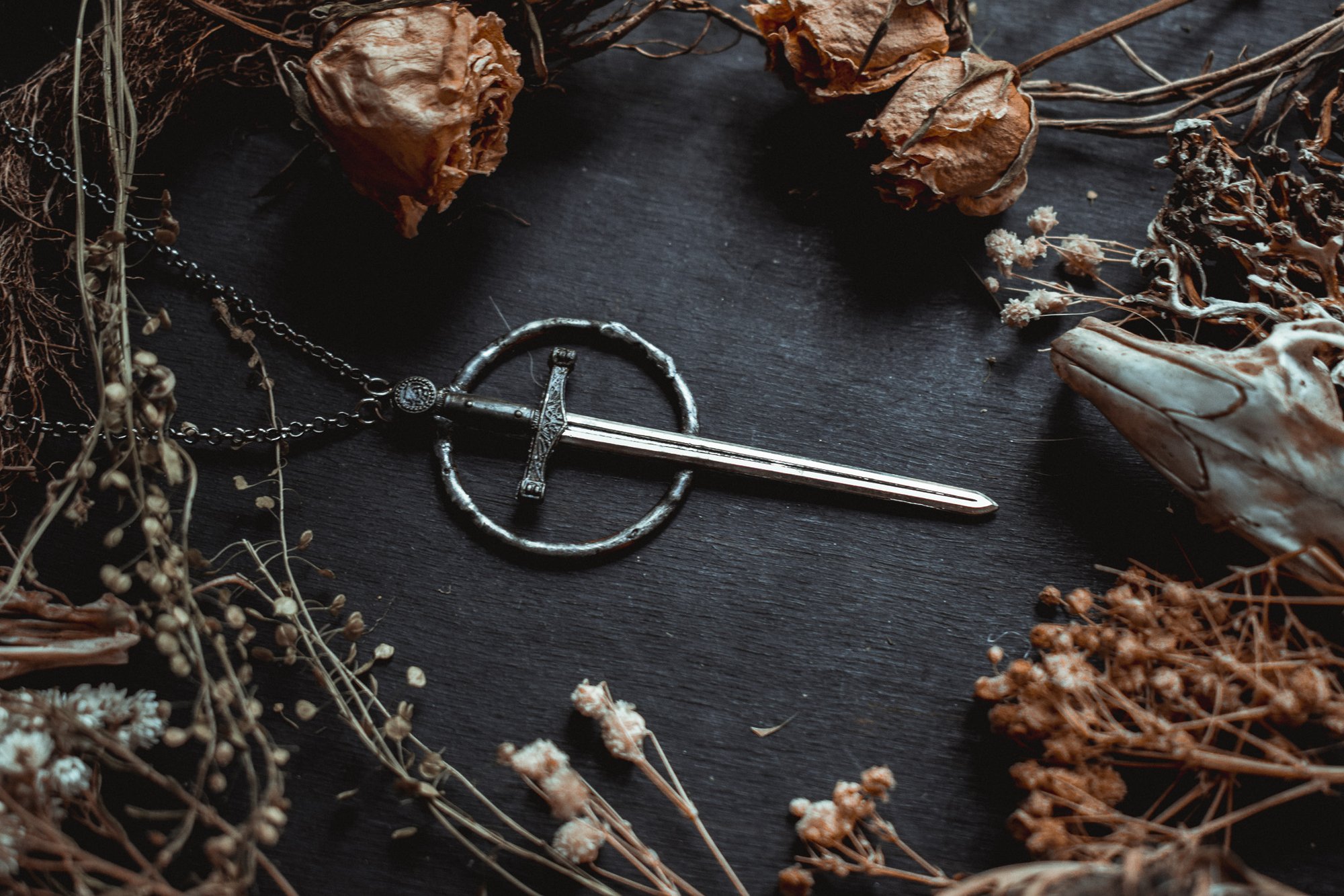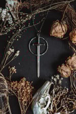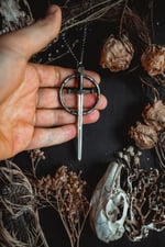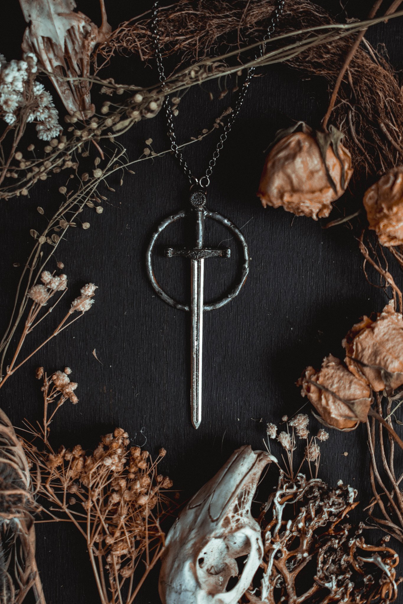 A necklace created with sword charm that has been mounted on a soldered copper ring.