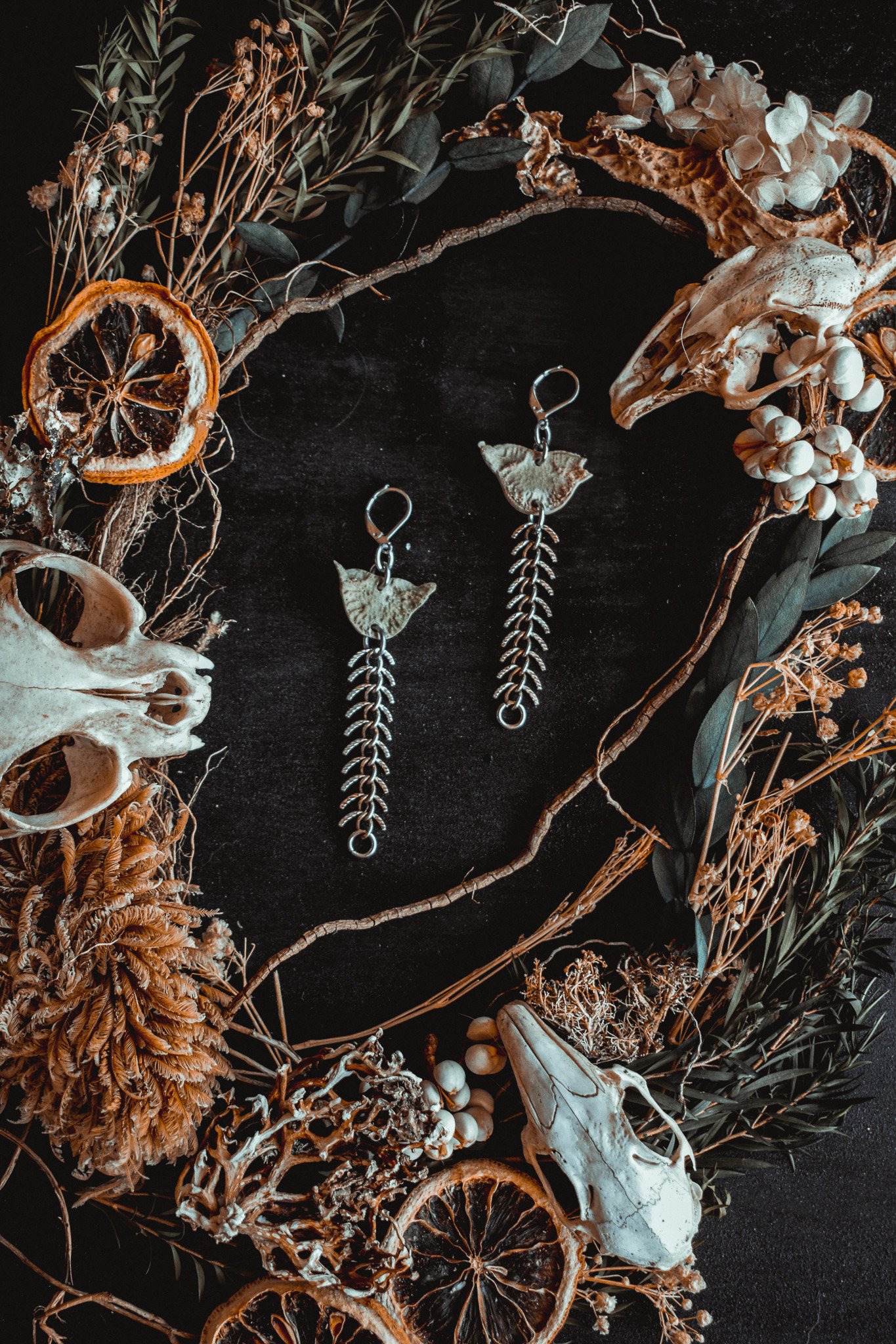 A pair of earrings created with fishbone chain and salvaged deer vertebra disks