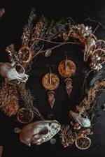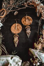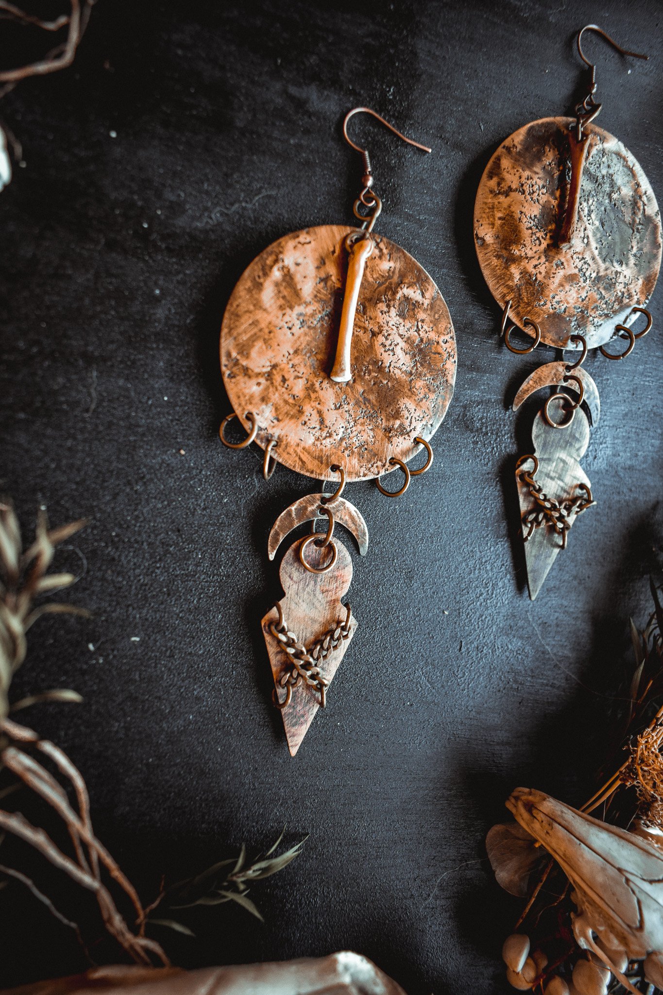 A pair of earrings created with hand cut brass that has been adorned in rustic patina, bone and chains