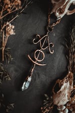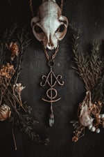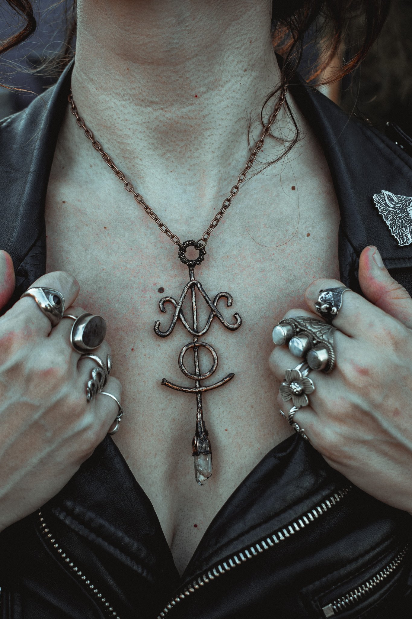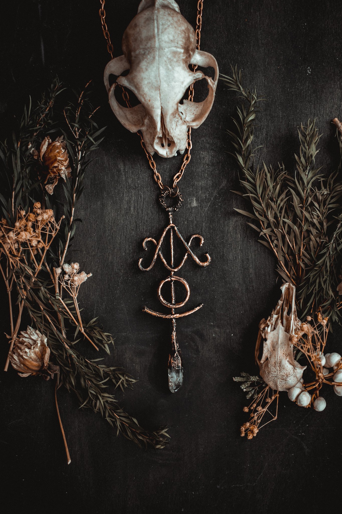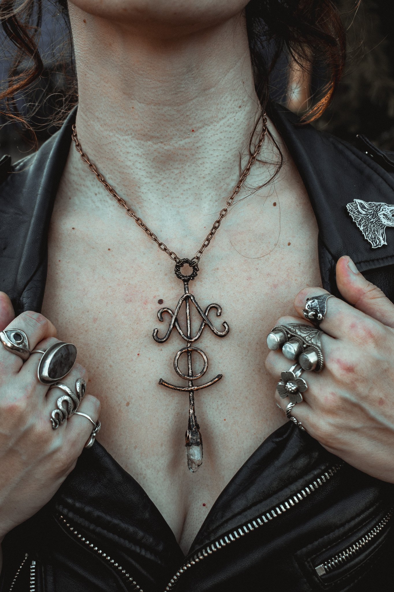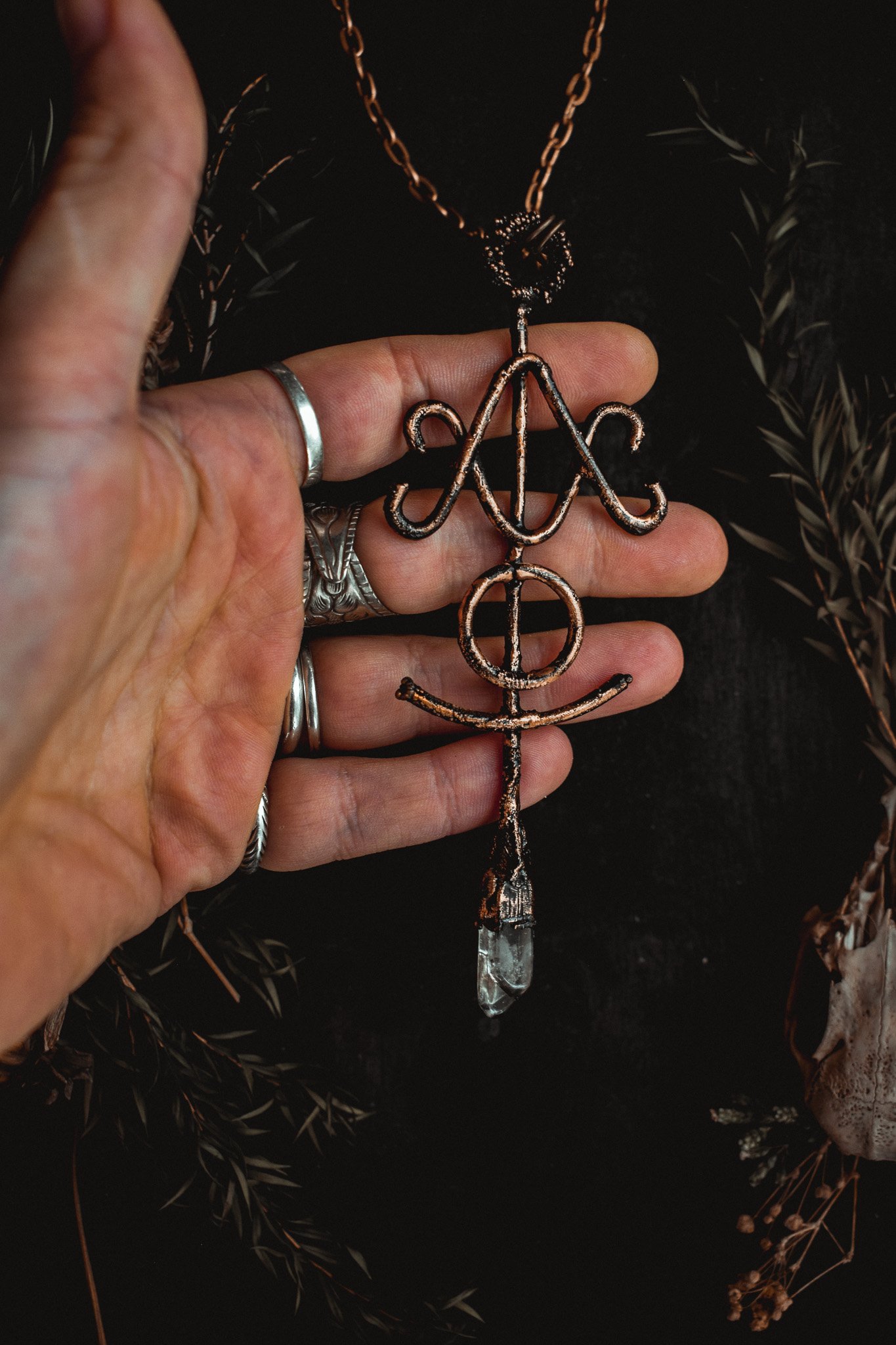 A necklace created with electroformed copper sigil adorned with a tumbled quartz crystal