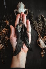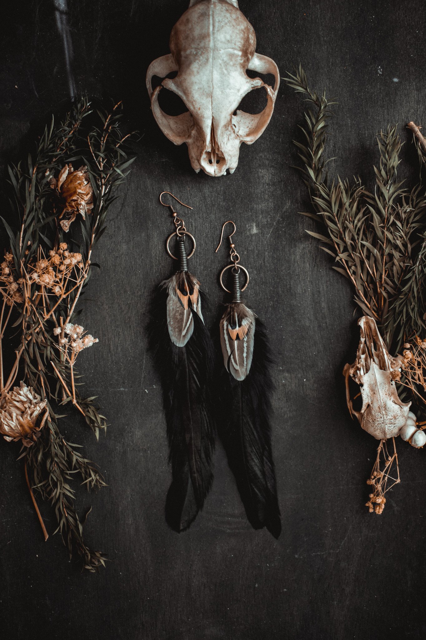 A pair of earrings created with secondhand rooster and pheasant feathers.