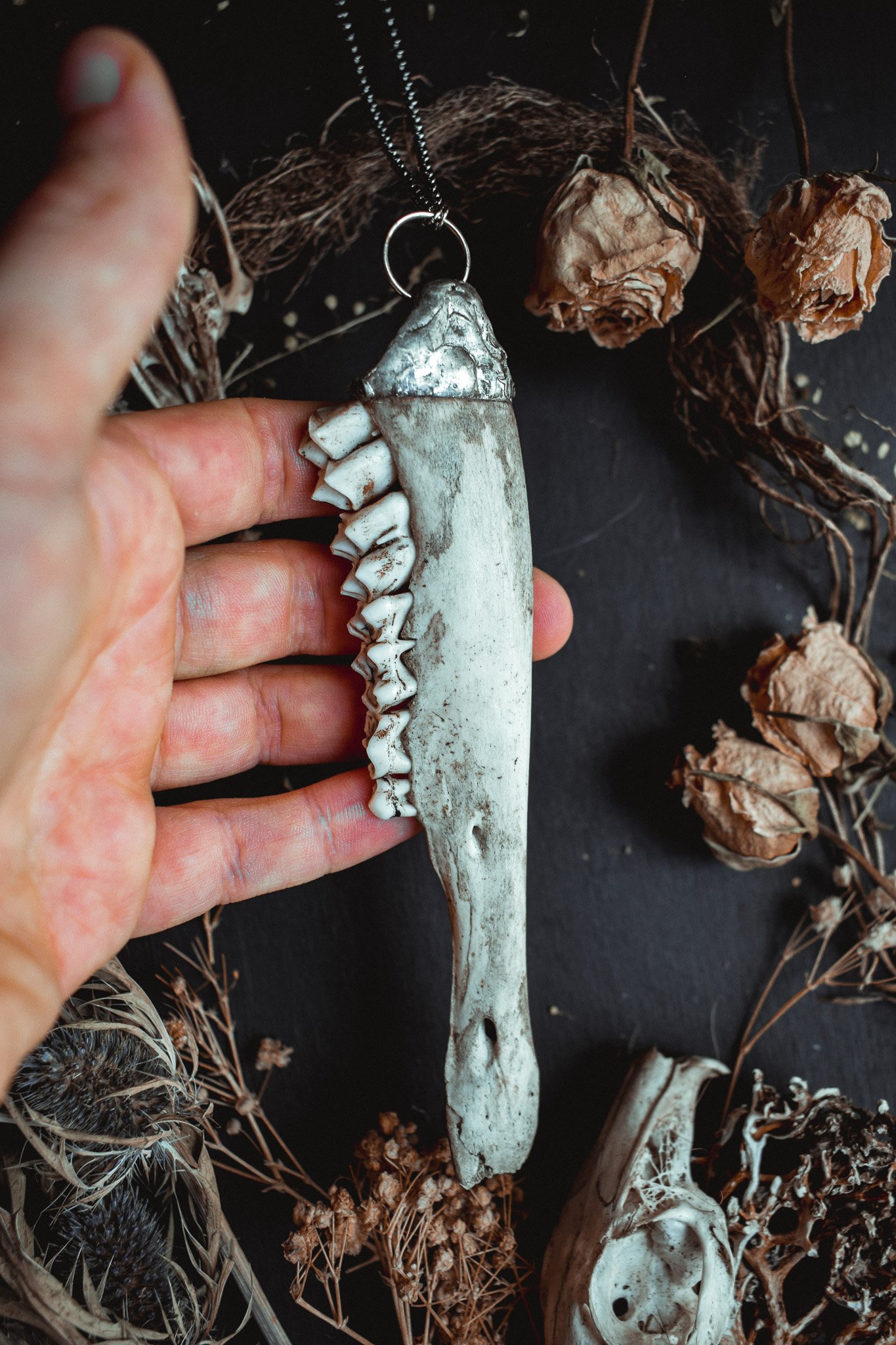A necklace created with a salvaged deer jaw that has been sawed and capped in silver