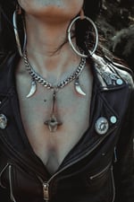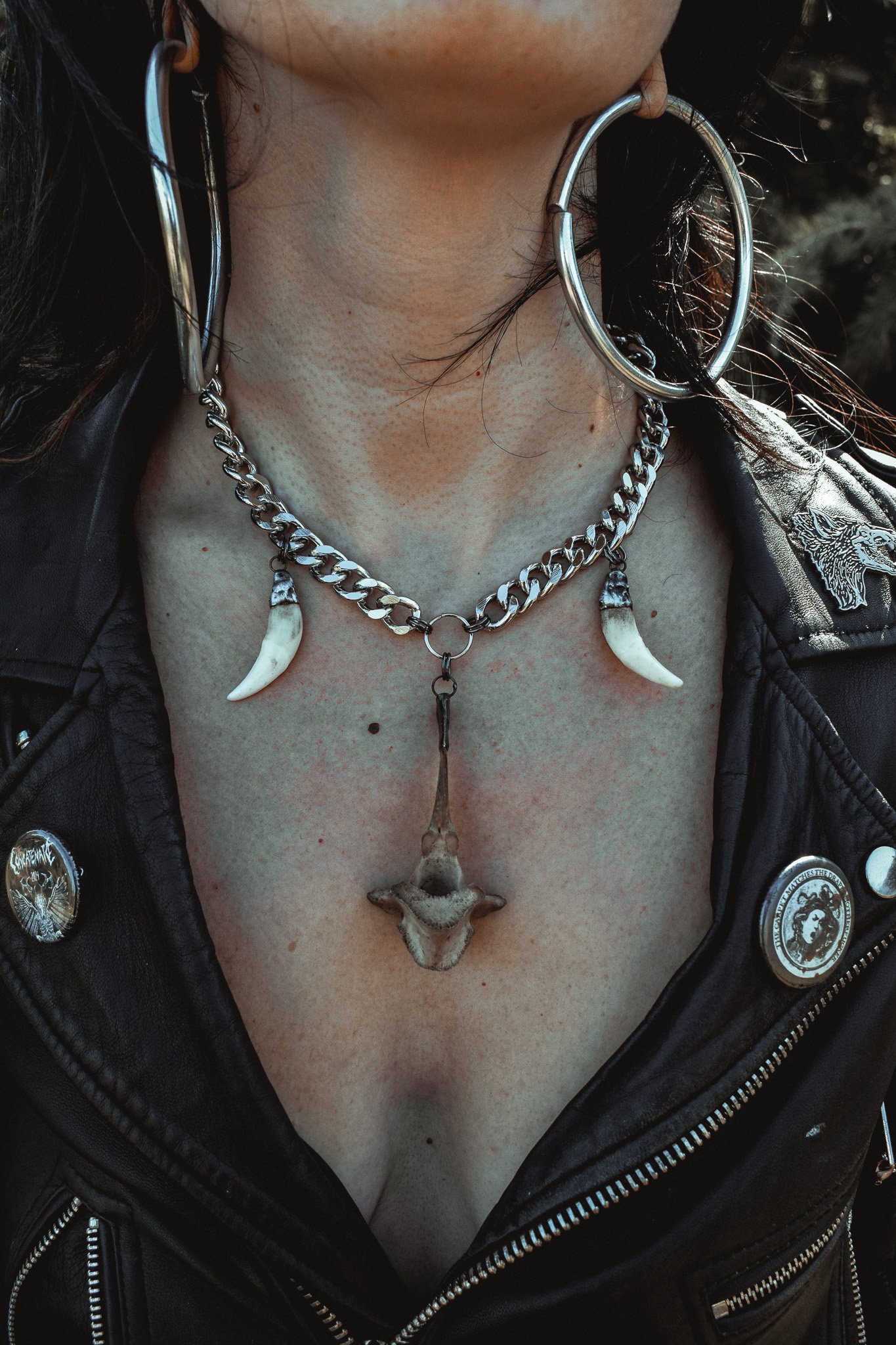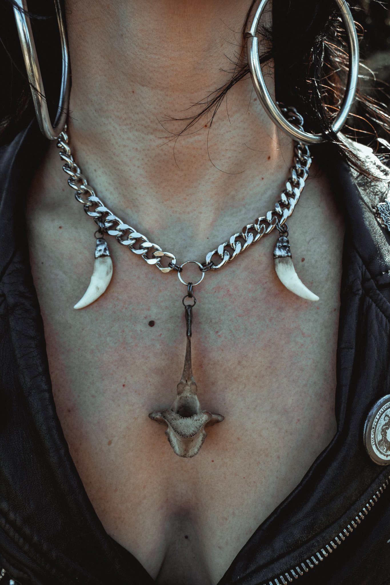 A necklace created with sturdy steel curb chain adorned with silver capped coyote teeth and deer vertebra.