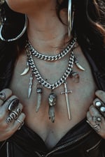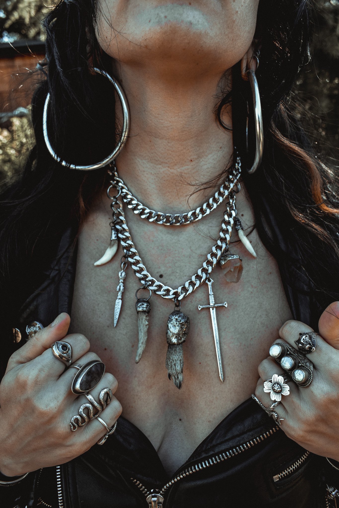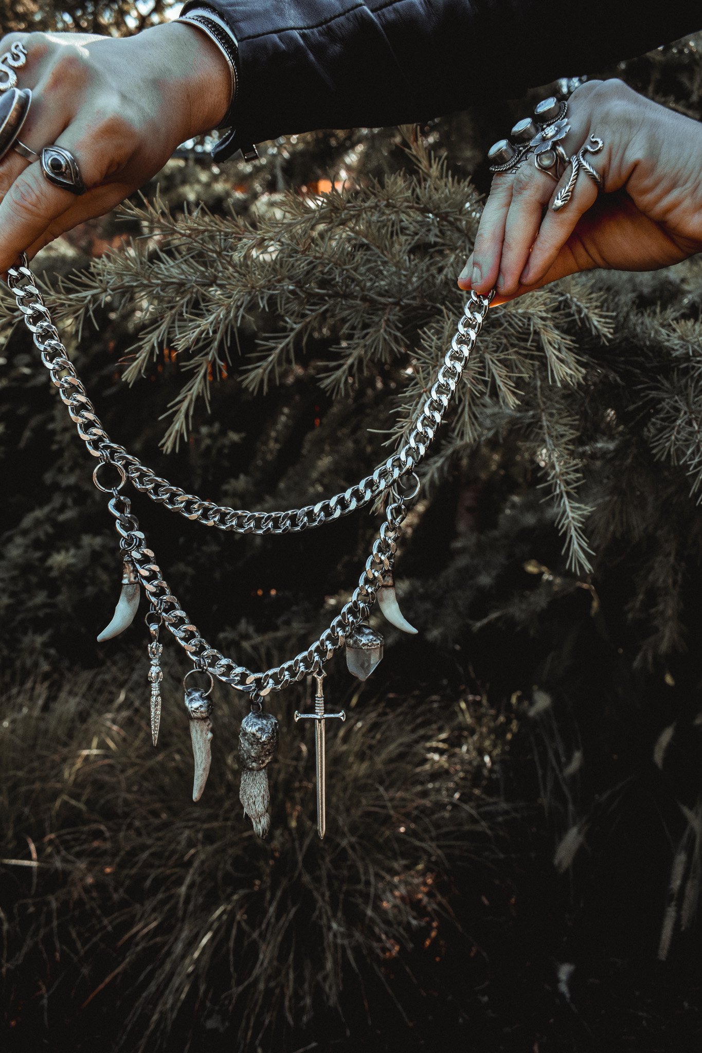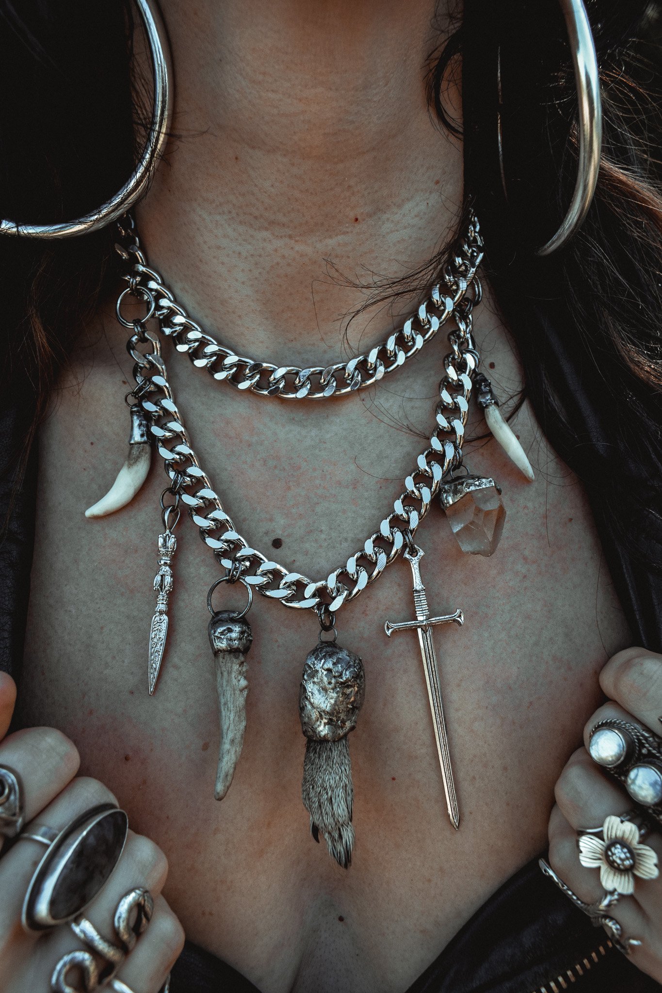 Large amulet created with thick steel curb chain adorned in silver capped bones, crystals, mummified squirrel paw and sword.