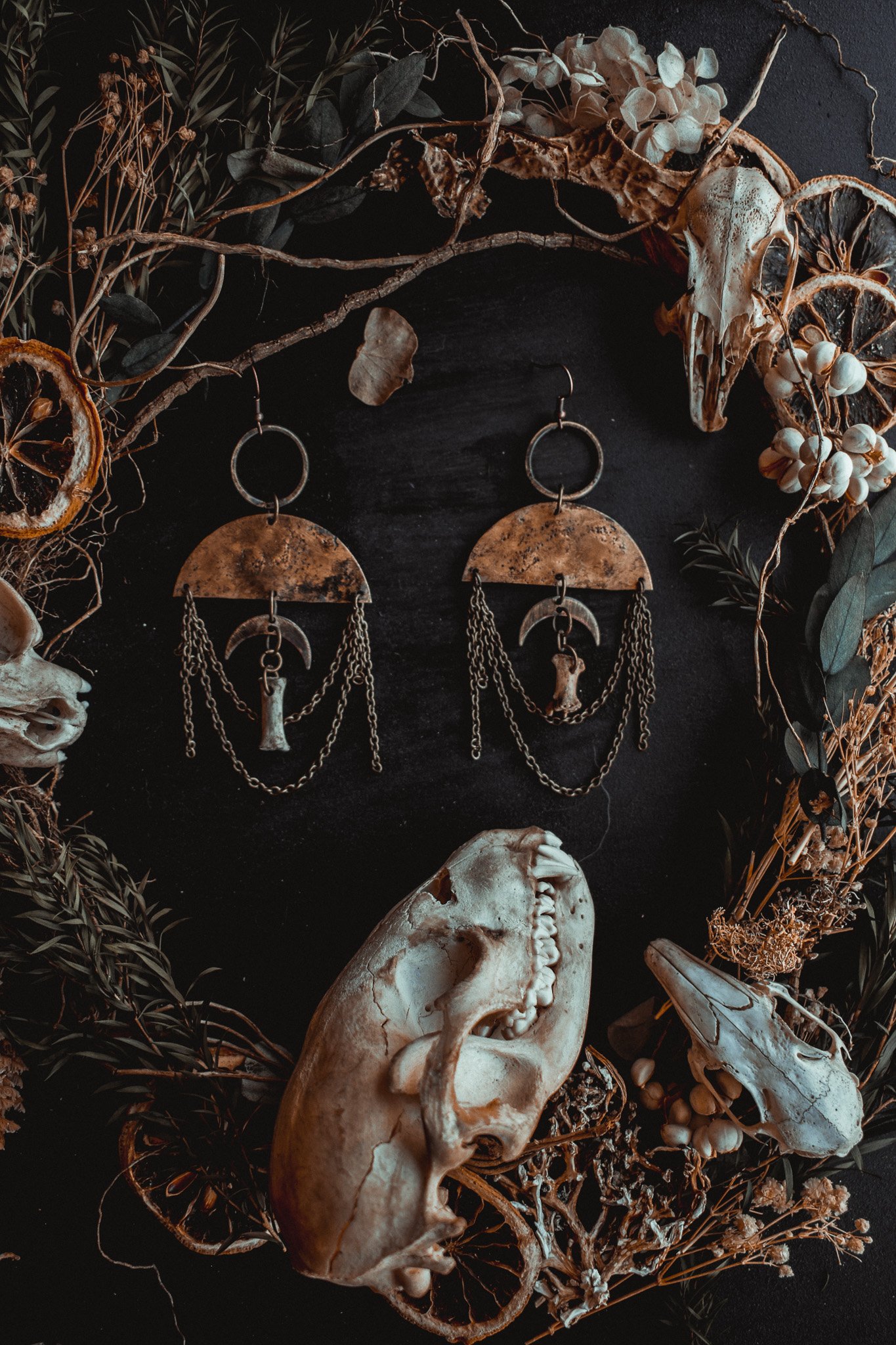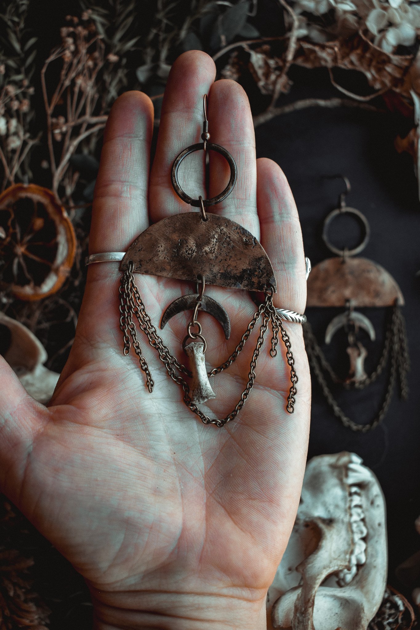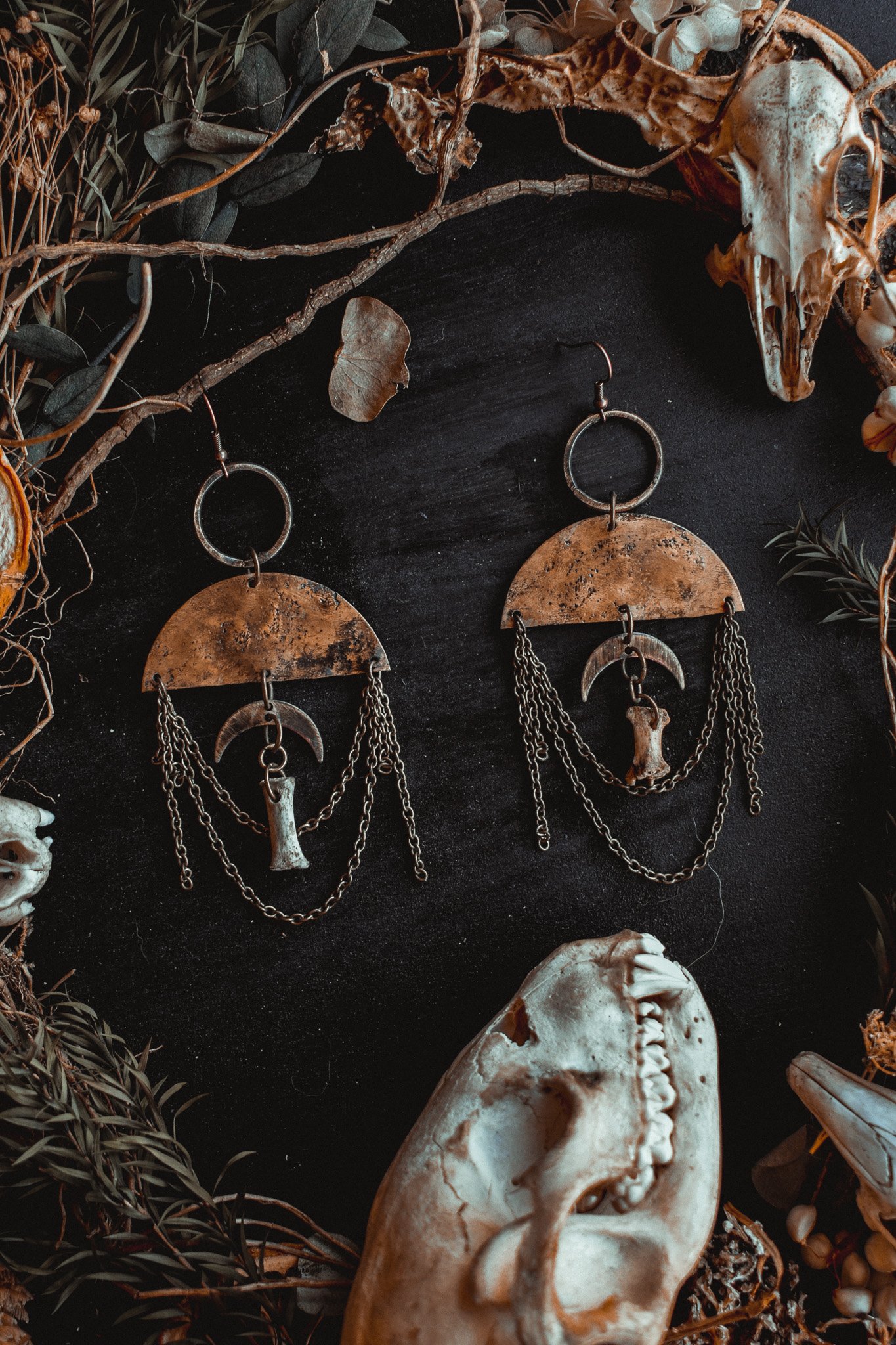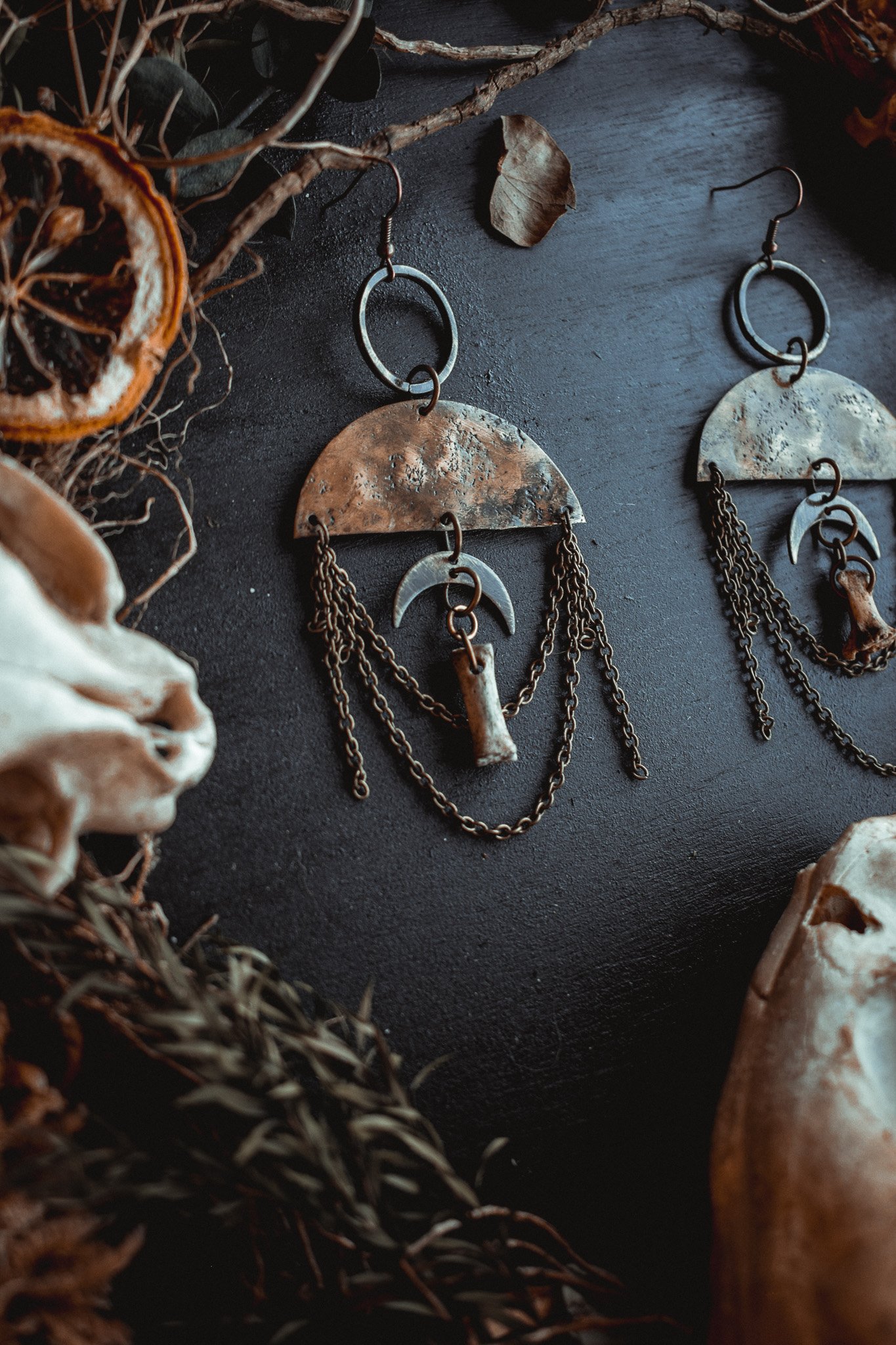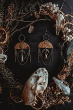 A pair of earrings created with handcrafted charms adorned in brass chains and bone