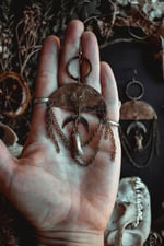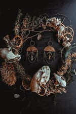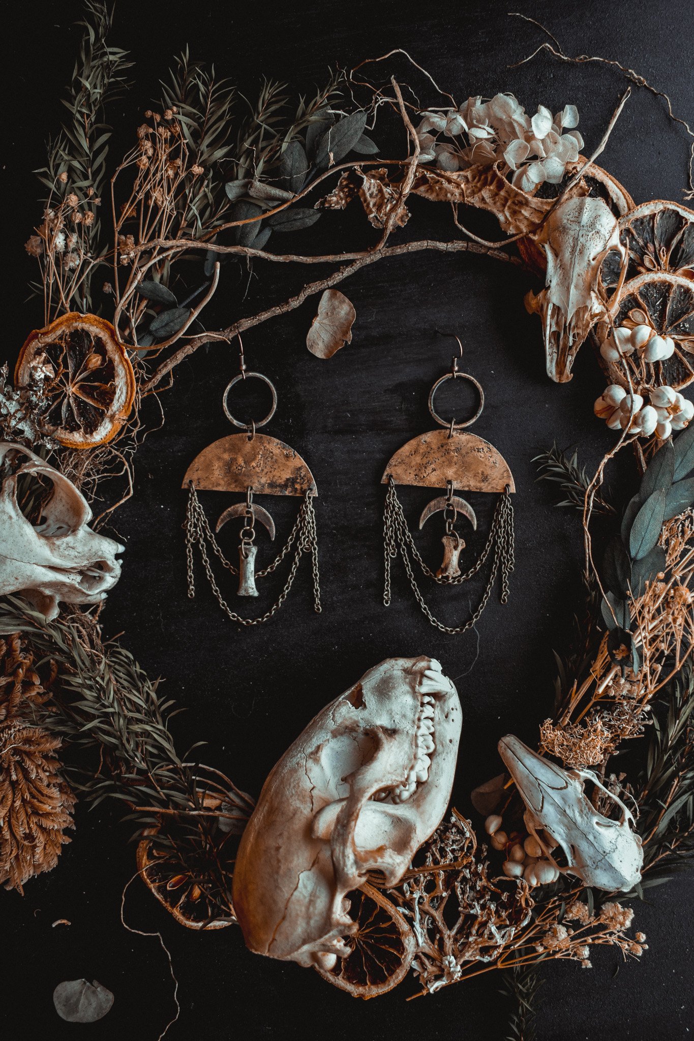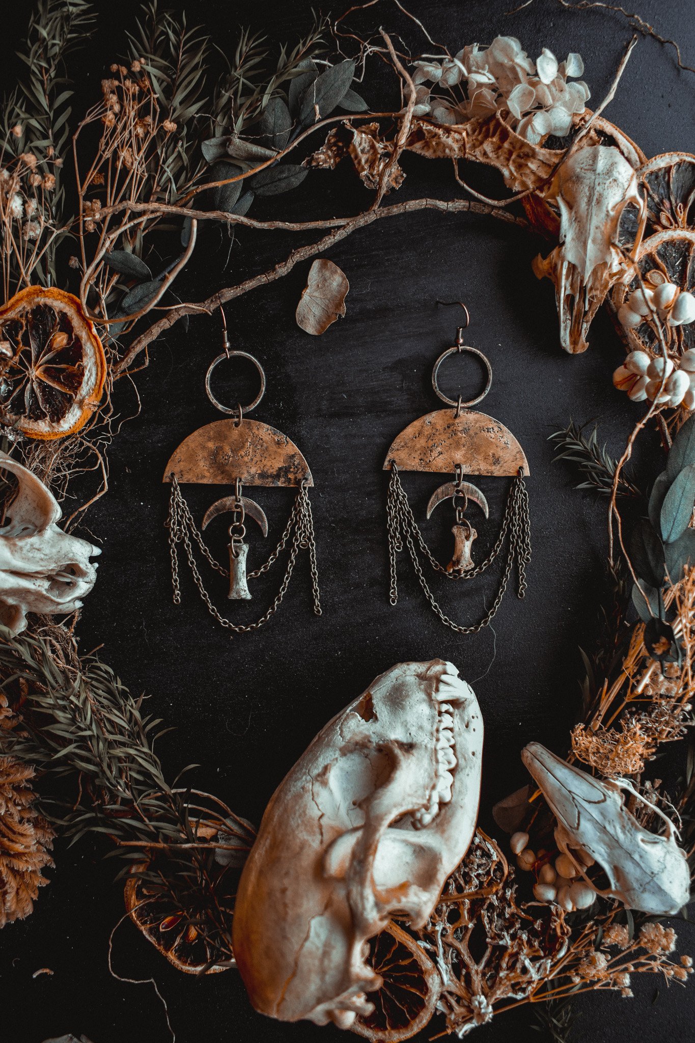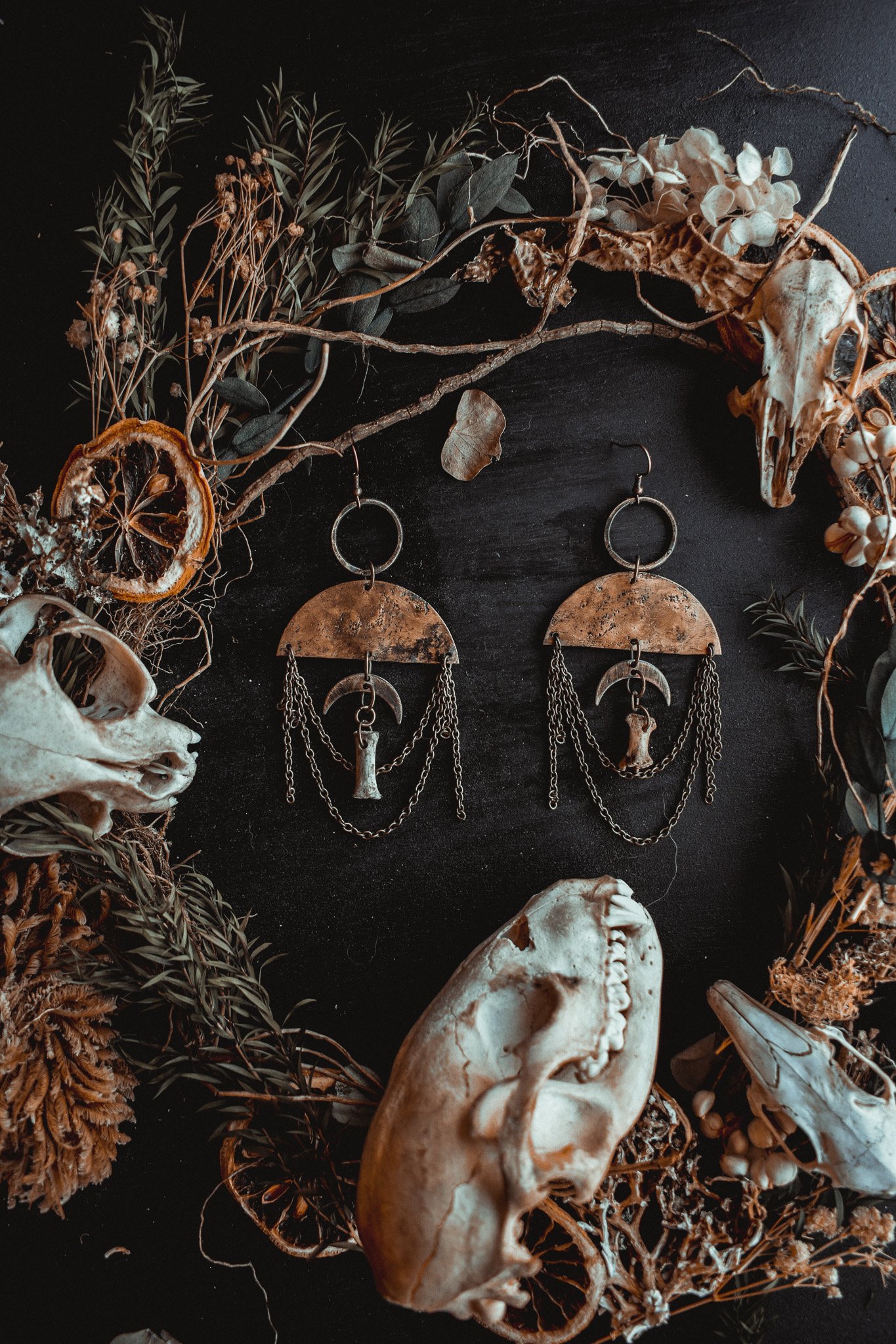 A pair of earrings created with handcrafted charms adorned in brass chains and bone