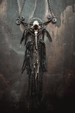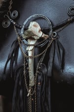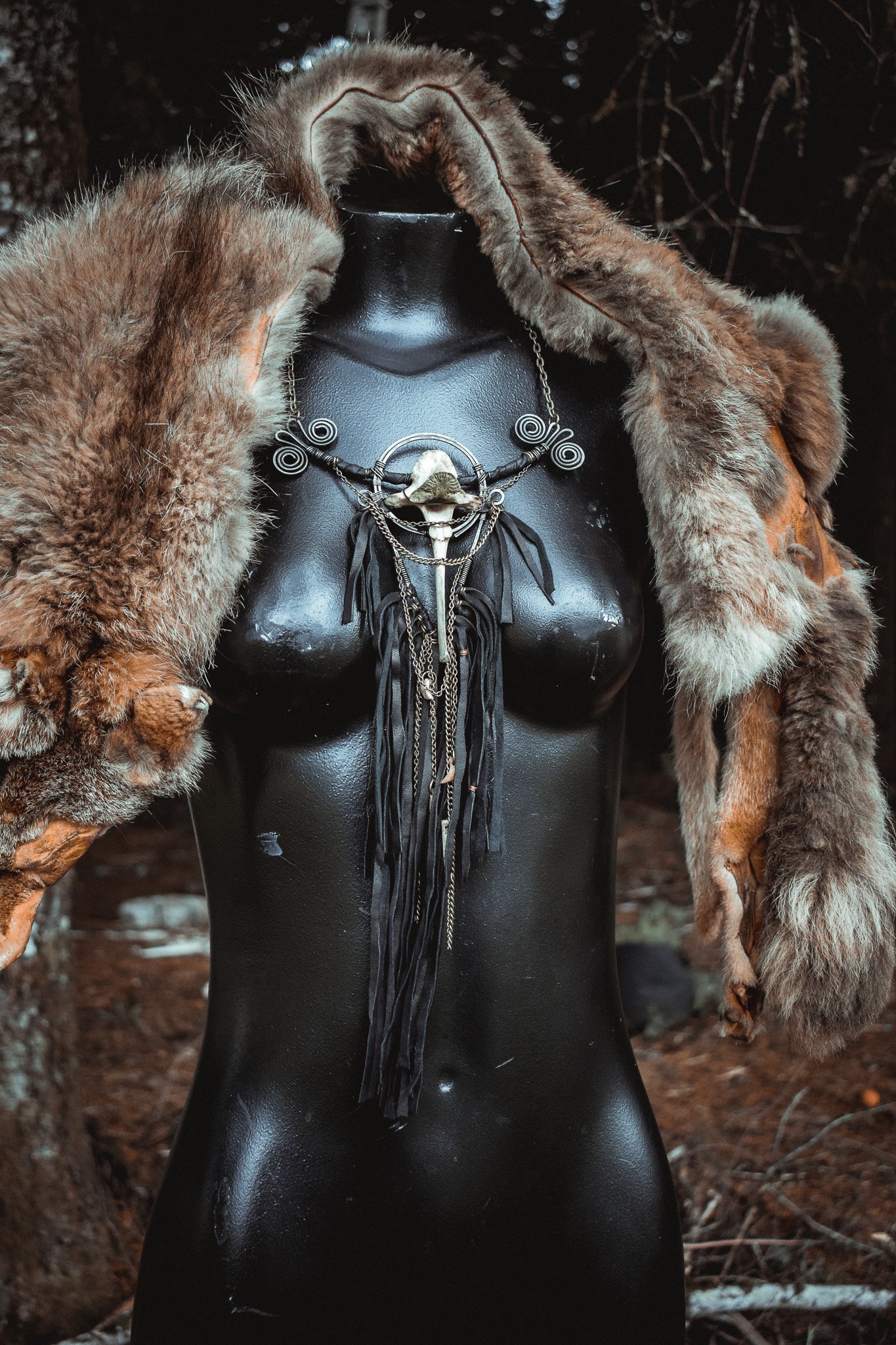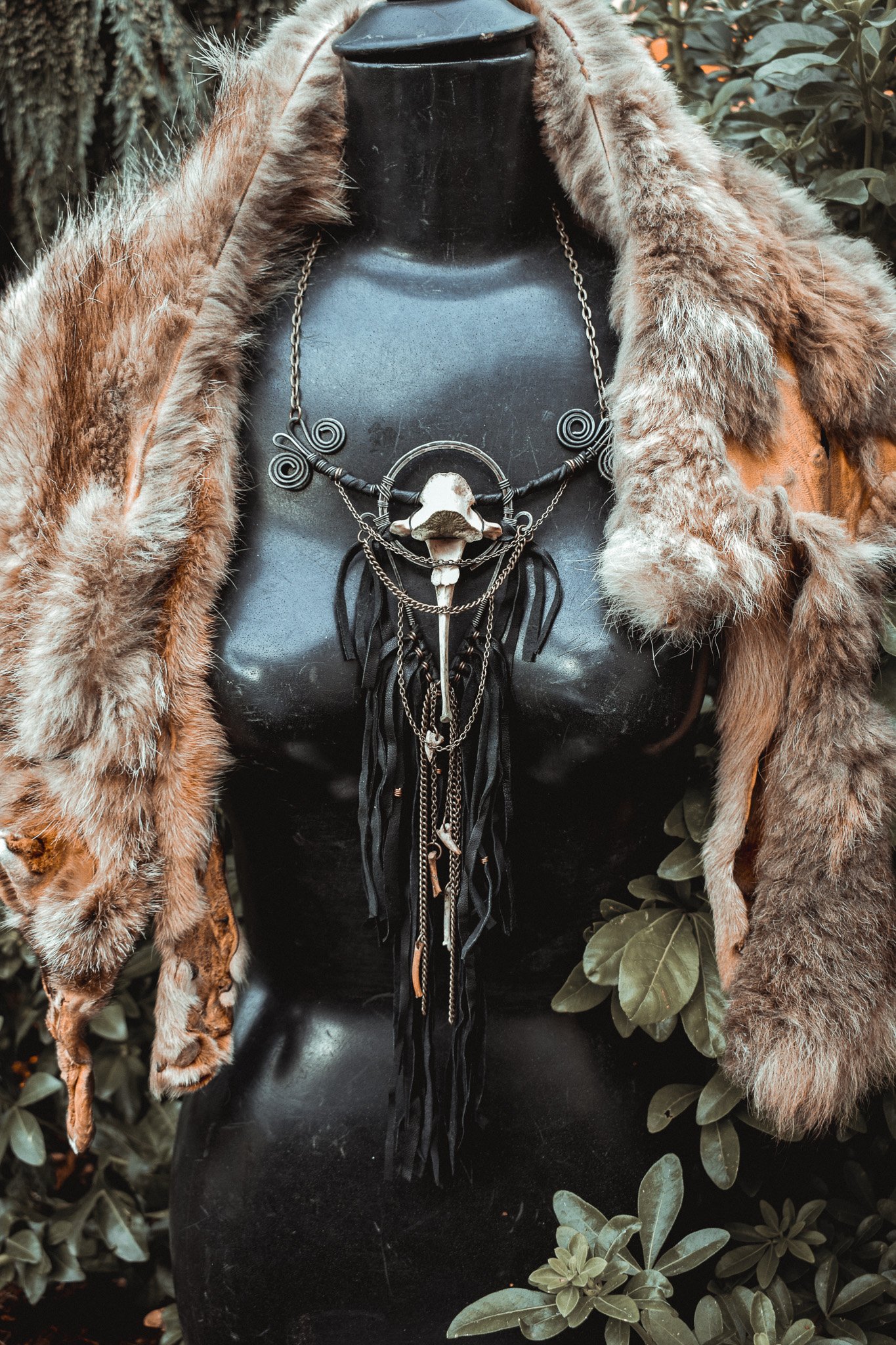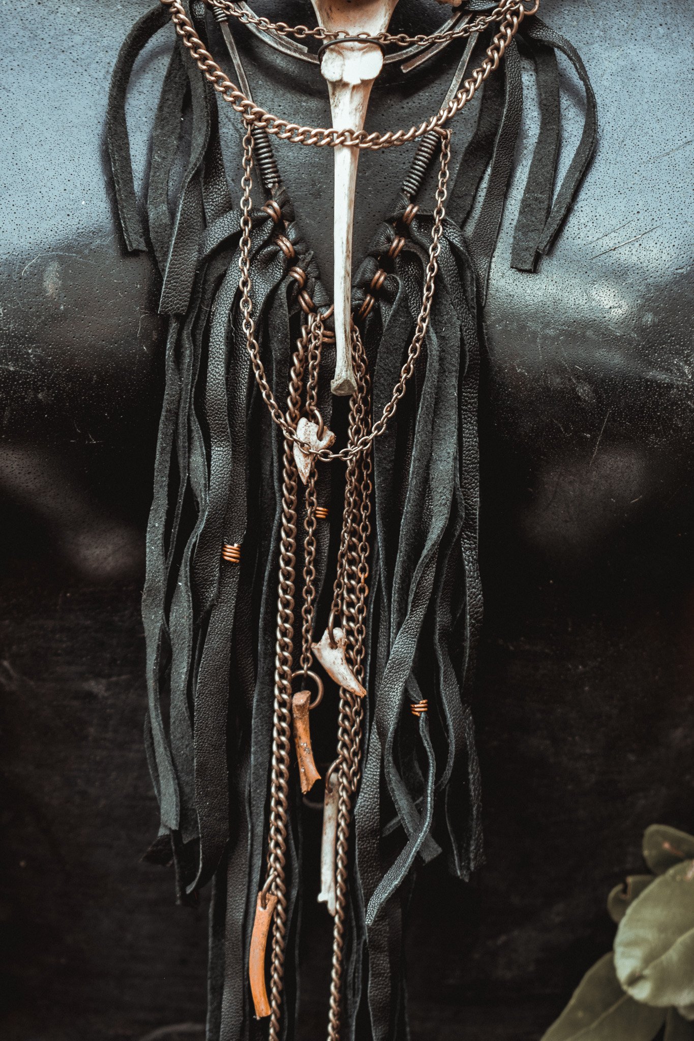 A large handcrafted necklace created with hand cut salvaged leather fringe, hammered steel wire, brass curb chains and large deer vertebra bone.