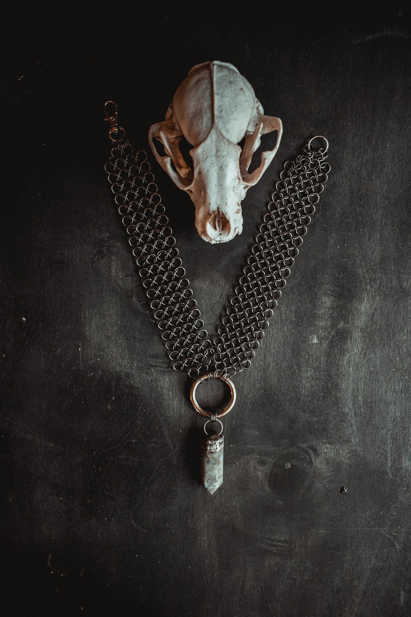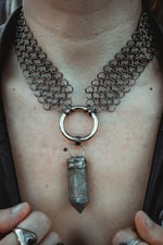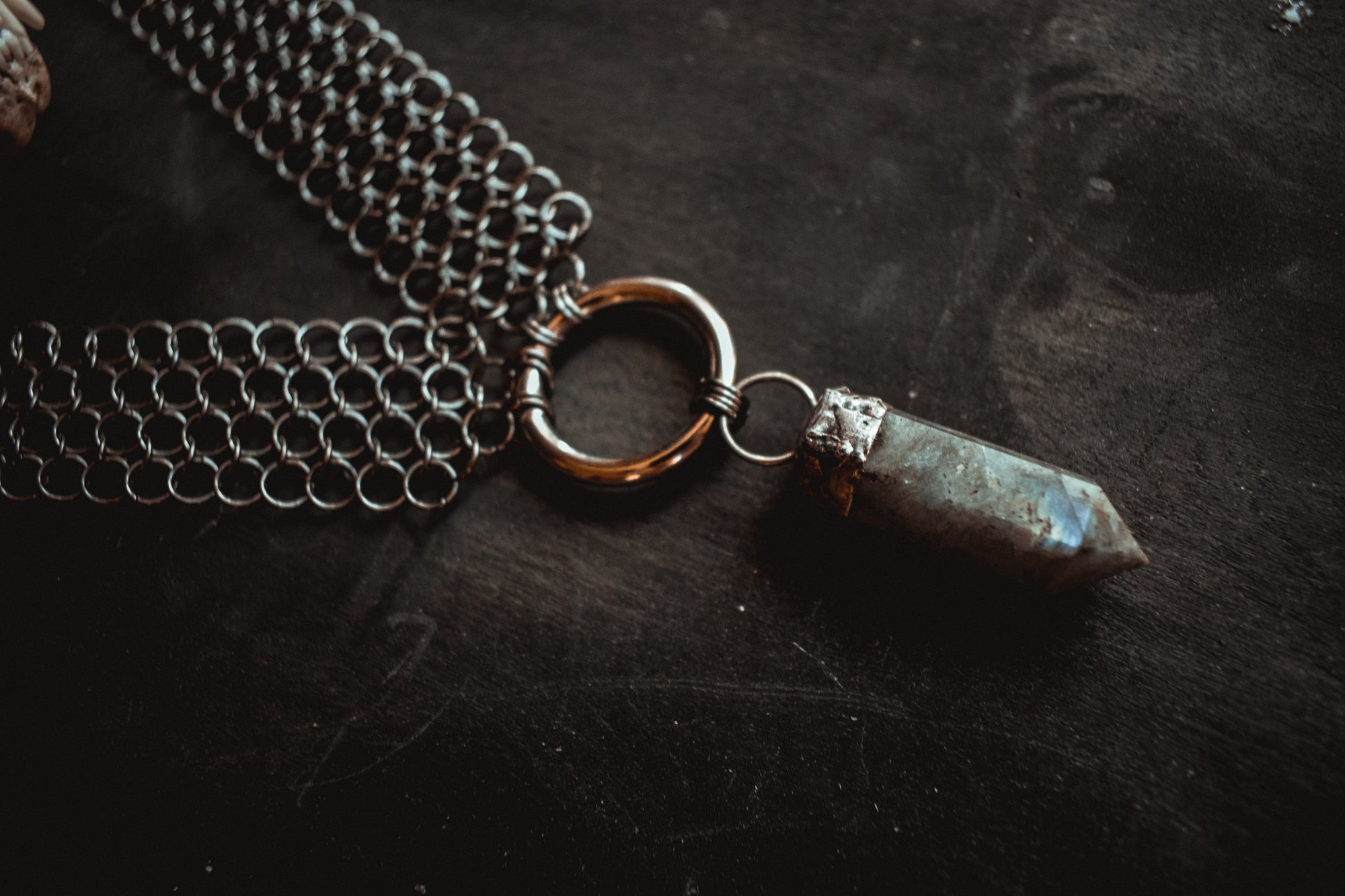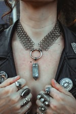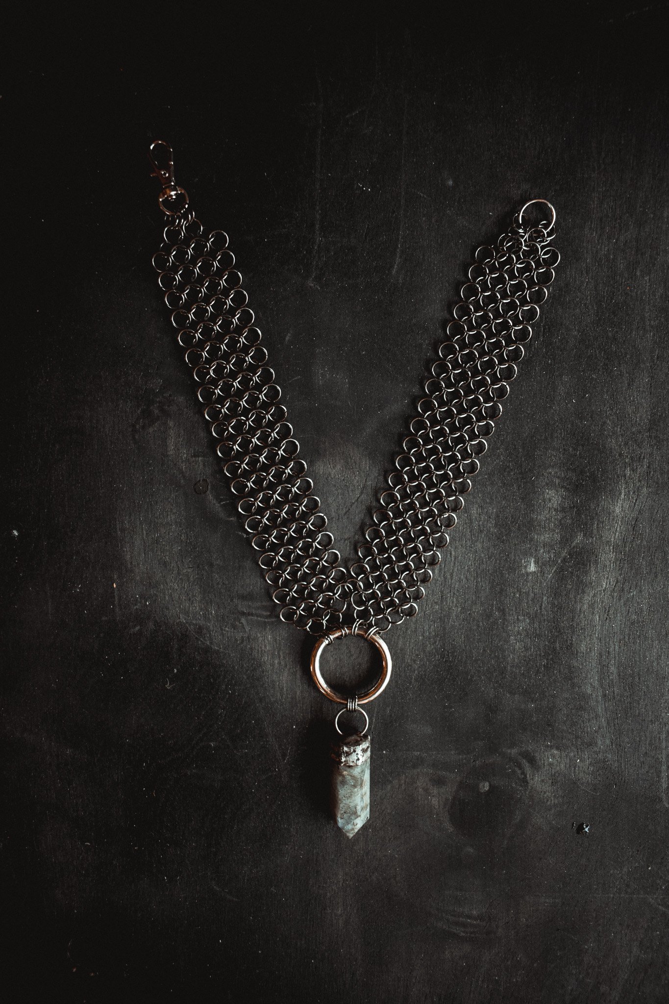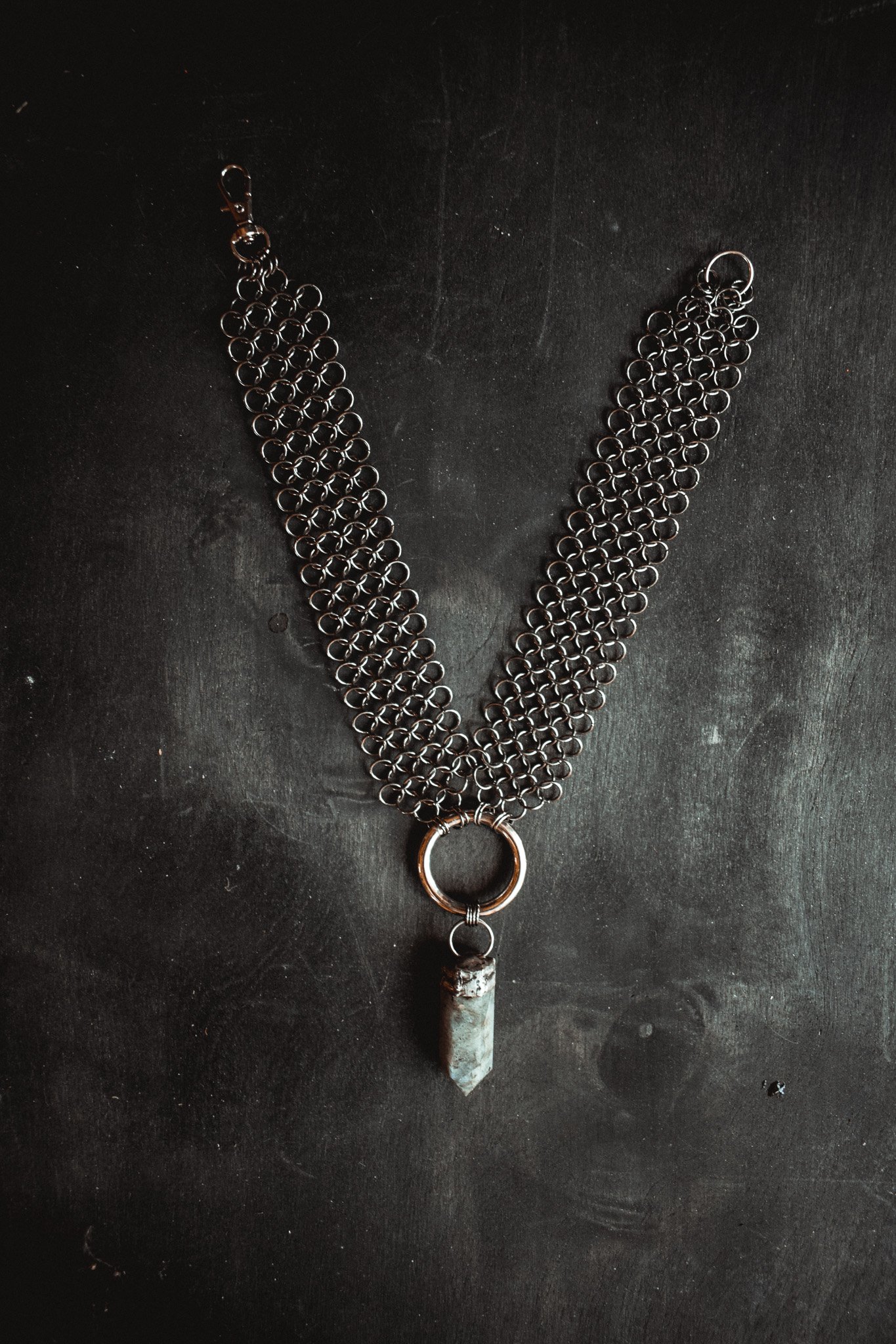 A handcrafted chainmail necklace created with handwoven chainmail and silver capped labradorite stone