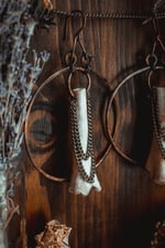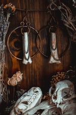 A pair of ear hangers created with hammered copper wire, salvaged bones and brass chain accents.