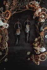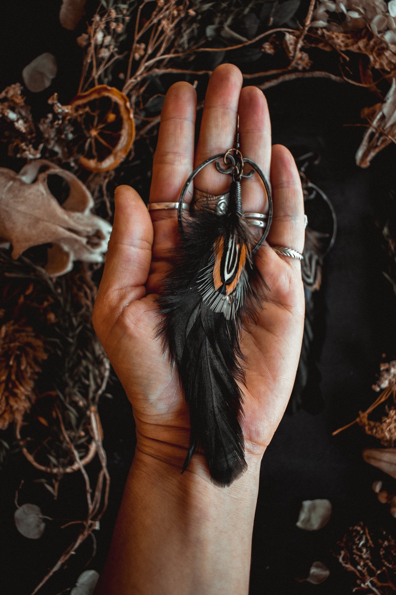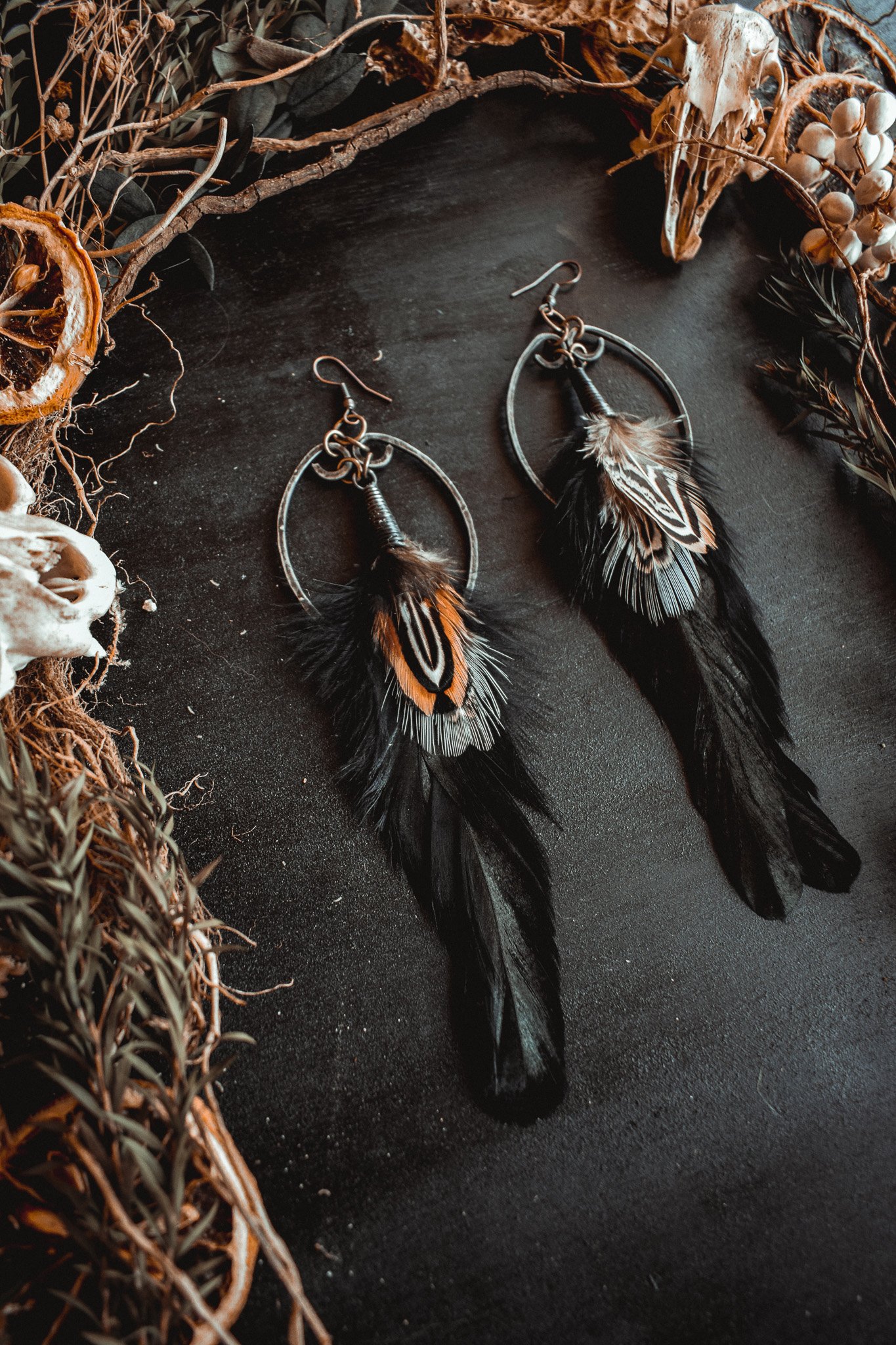 A pair of earrings created with hammered wire and salvaged feathers