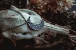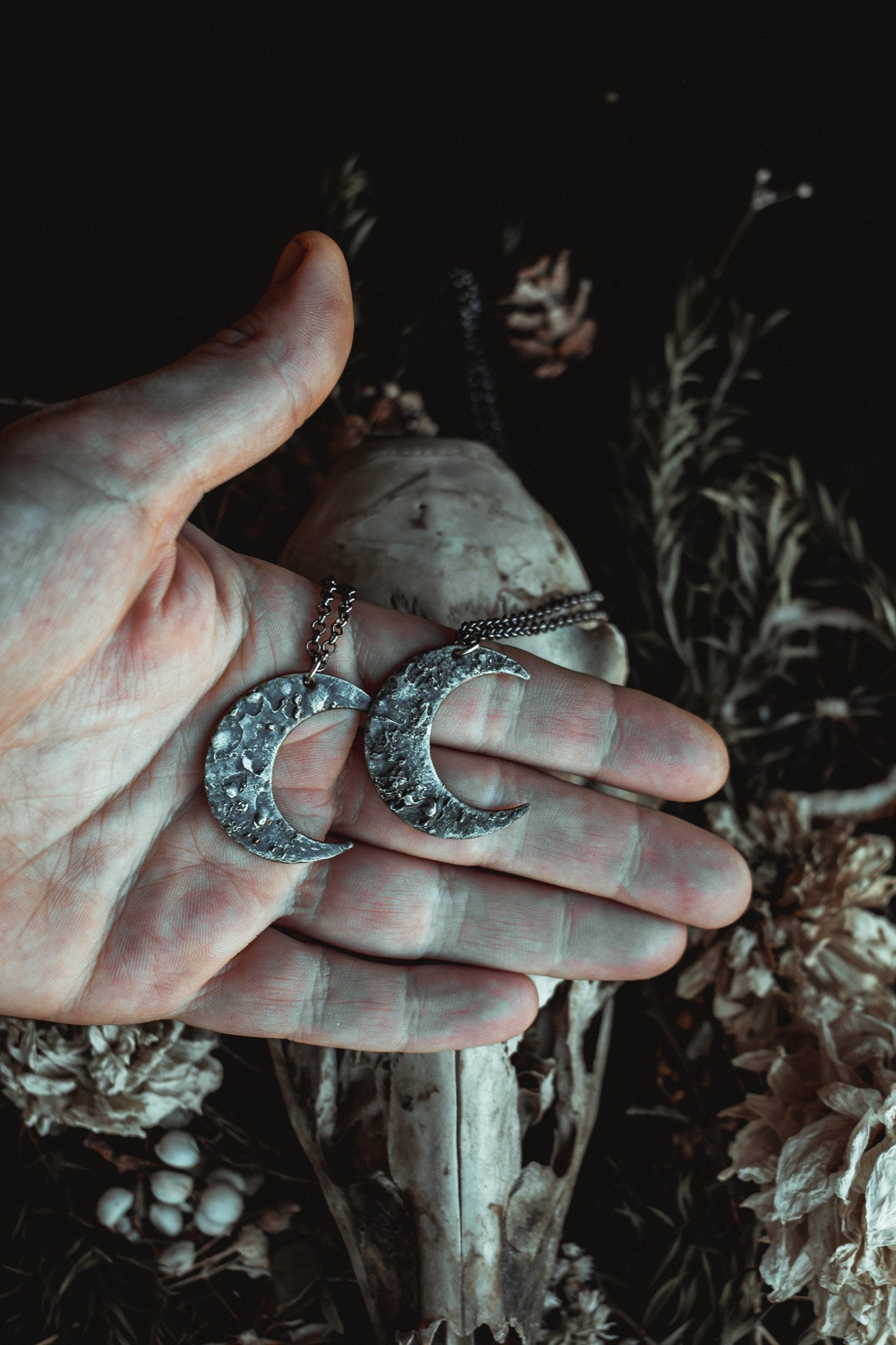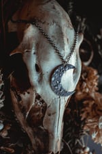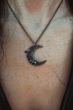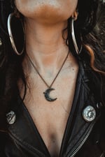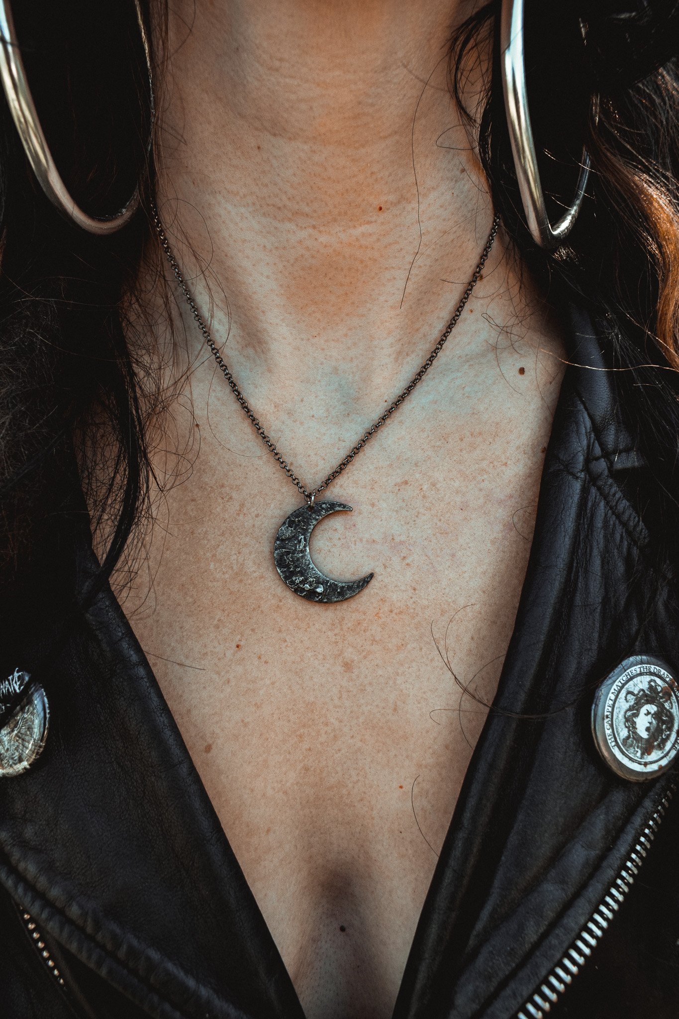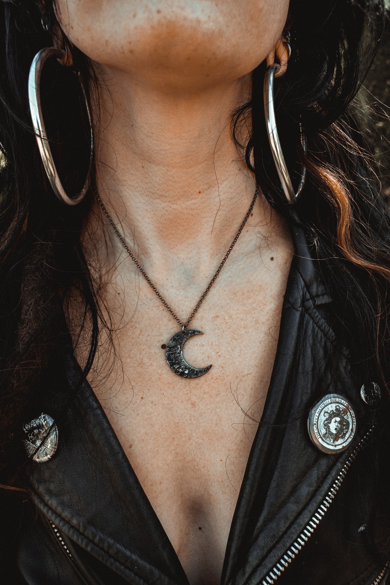 A simple necklace created with hand cut brass moon adorned in silver textures.