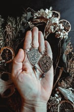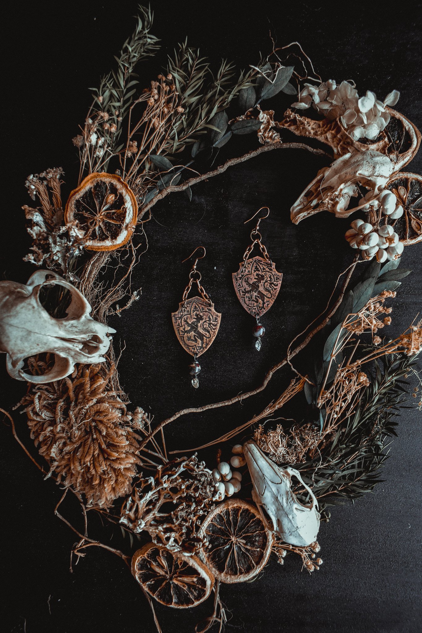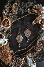 A pair of earrings made with hand sawed brass and stone bead accents.