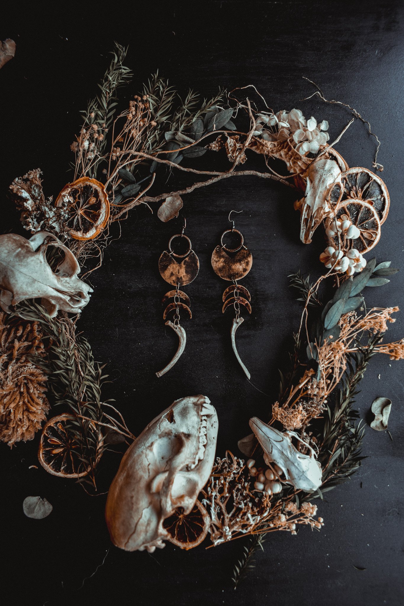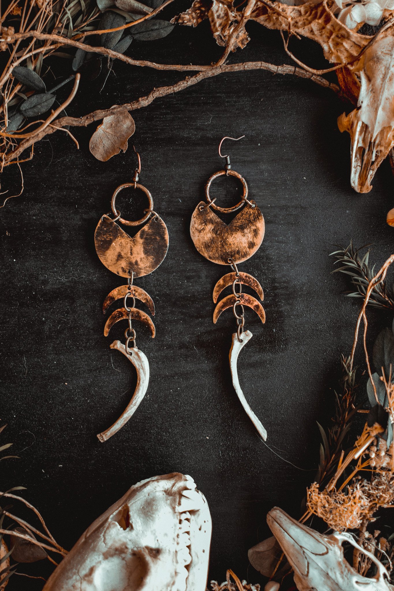 A pair of earrings created with rustic brass charms and salvaged rib bones