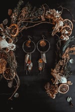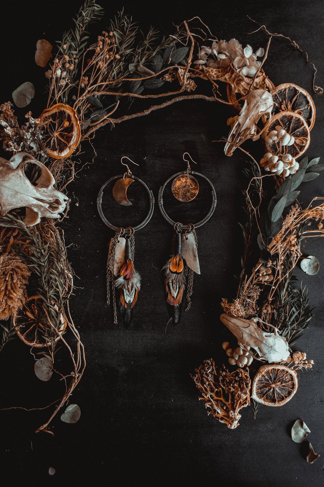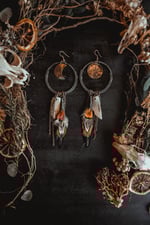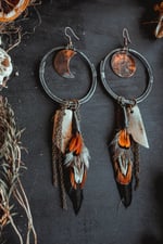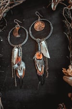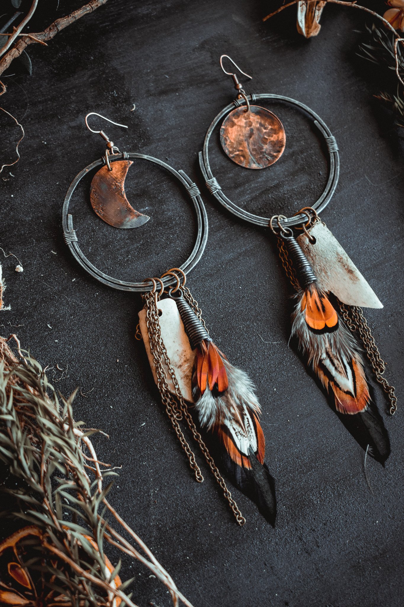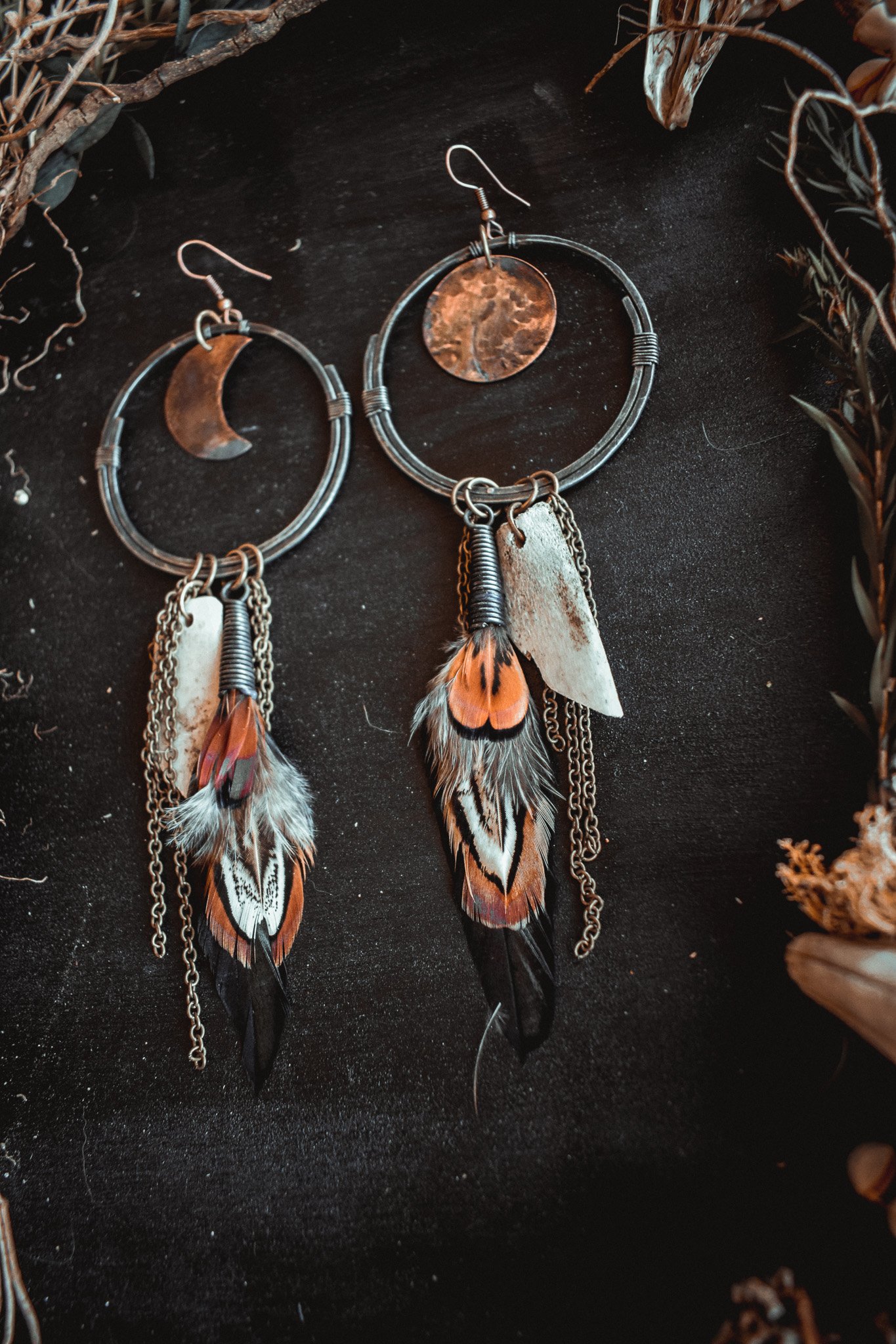 A pair of earrings created with hammered wire, handcrafted copper moons, salvaged deer rib fragments, feathers and chains