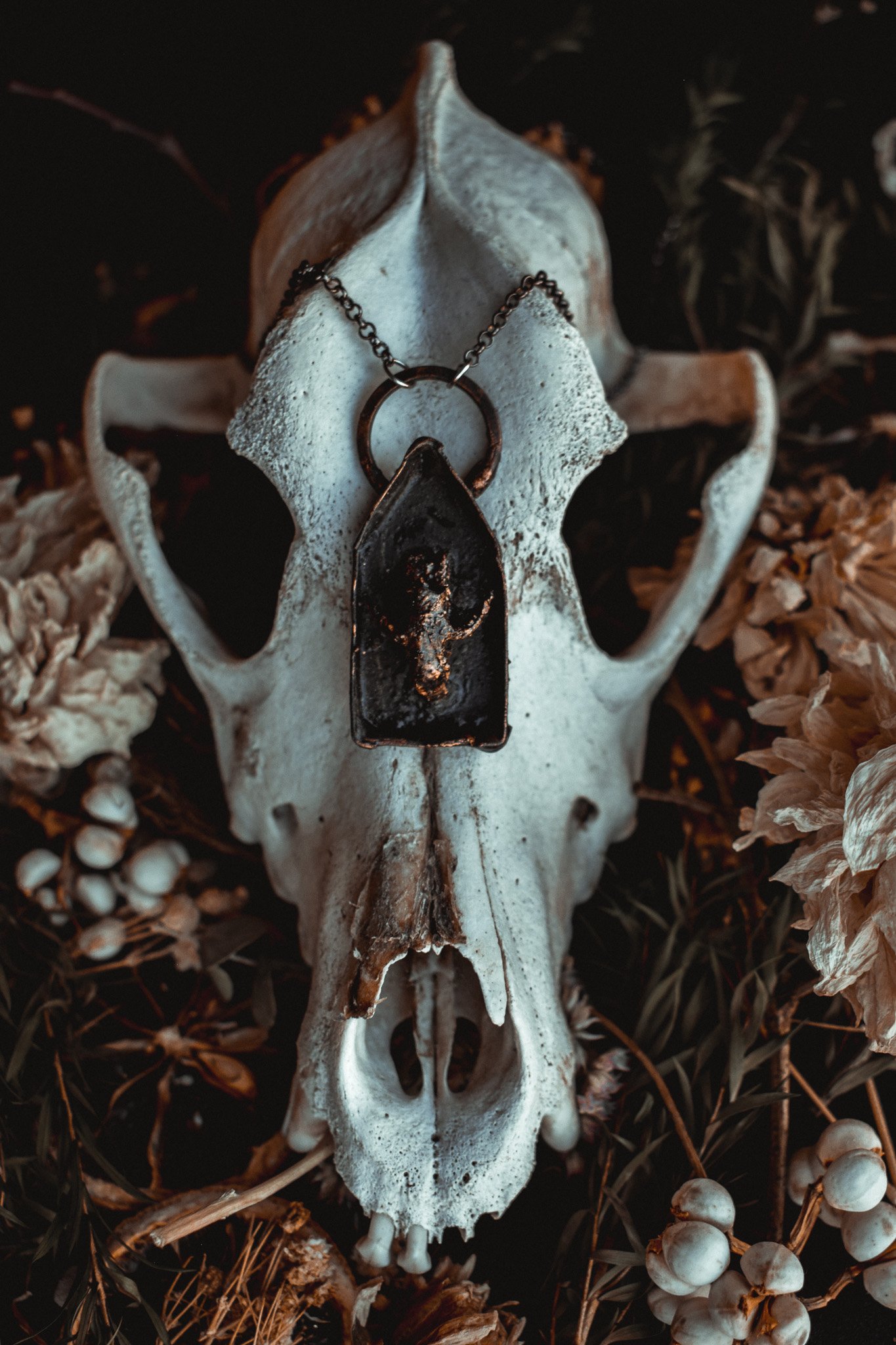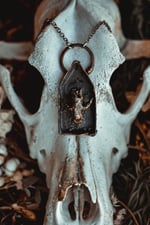 A necklace created with hand made shrine box and mouse skull that has been electroformed.