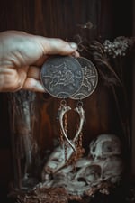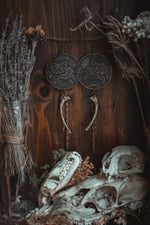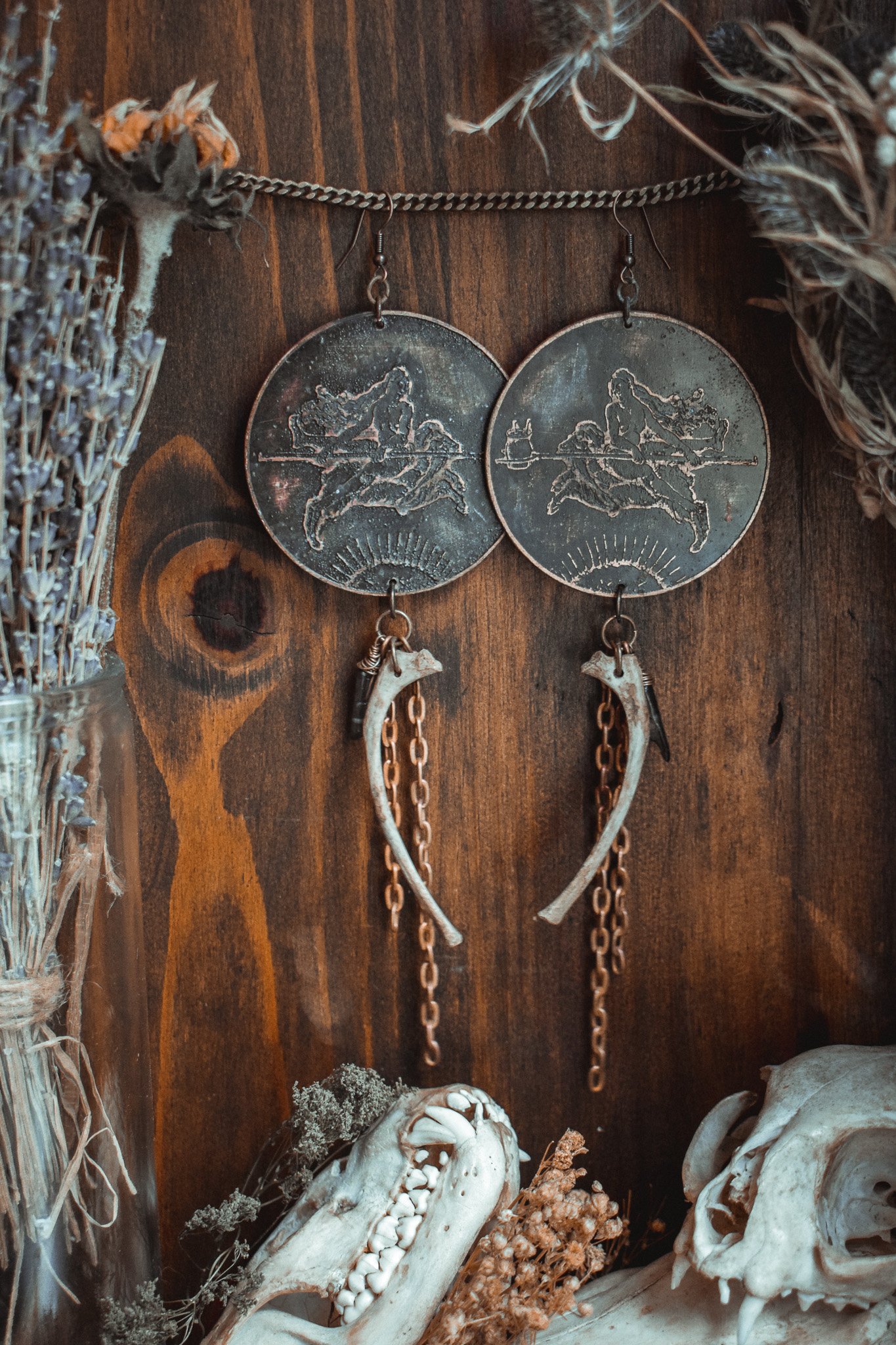 A large pair of handcrafted earrings created with a handmade etched brass charm adorned in copper chains, salvaged rib bones and crystal points.