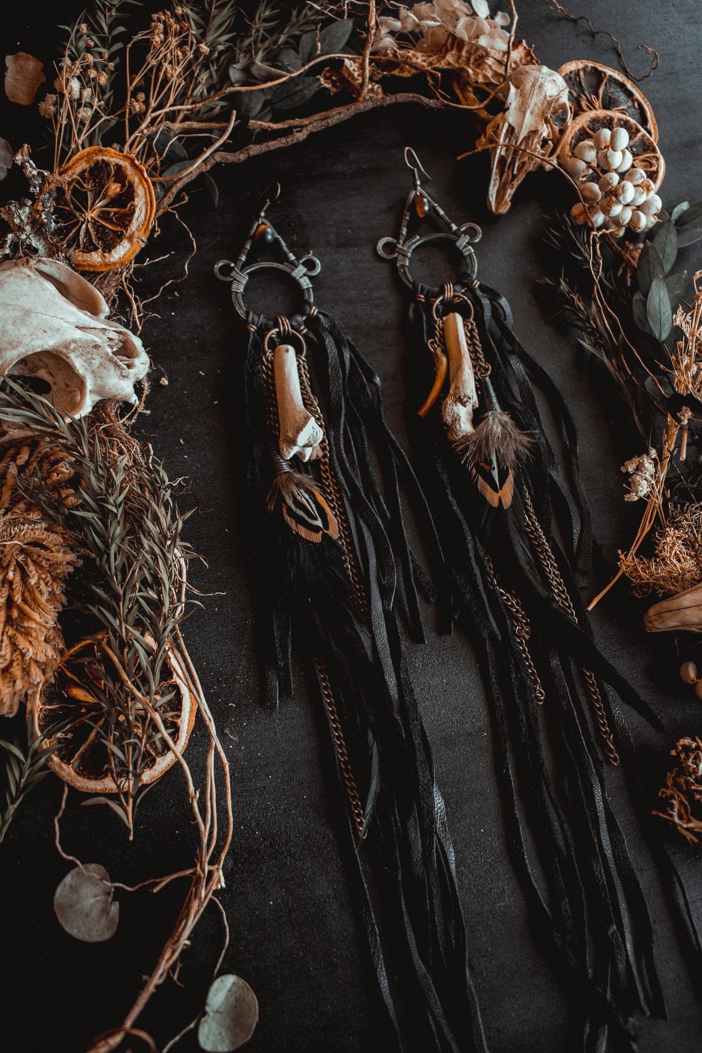 A pair of large bone earrings created with hammered wire, salvaged bones, salvaged feathers, leather fringe, chain and beads.