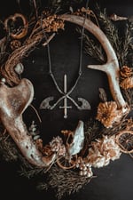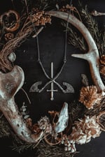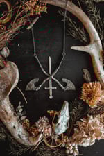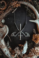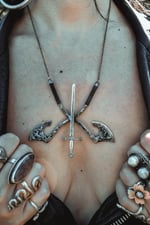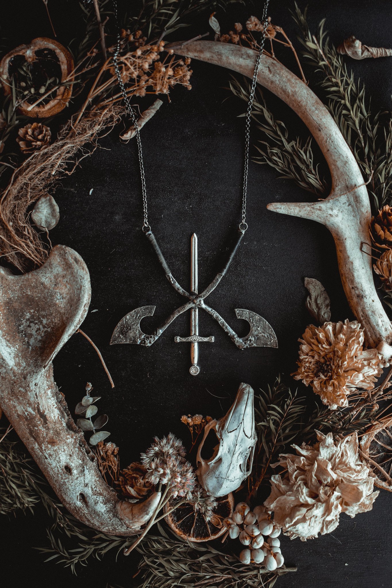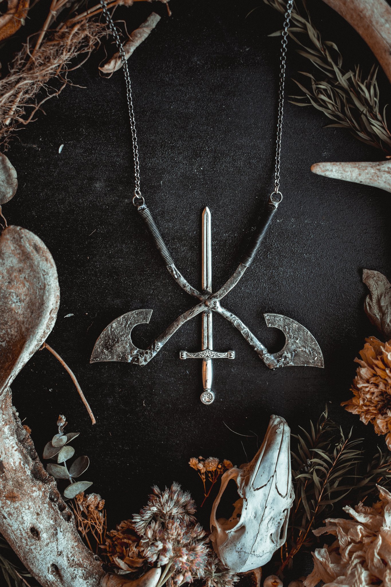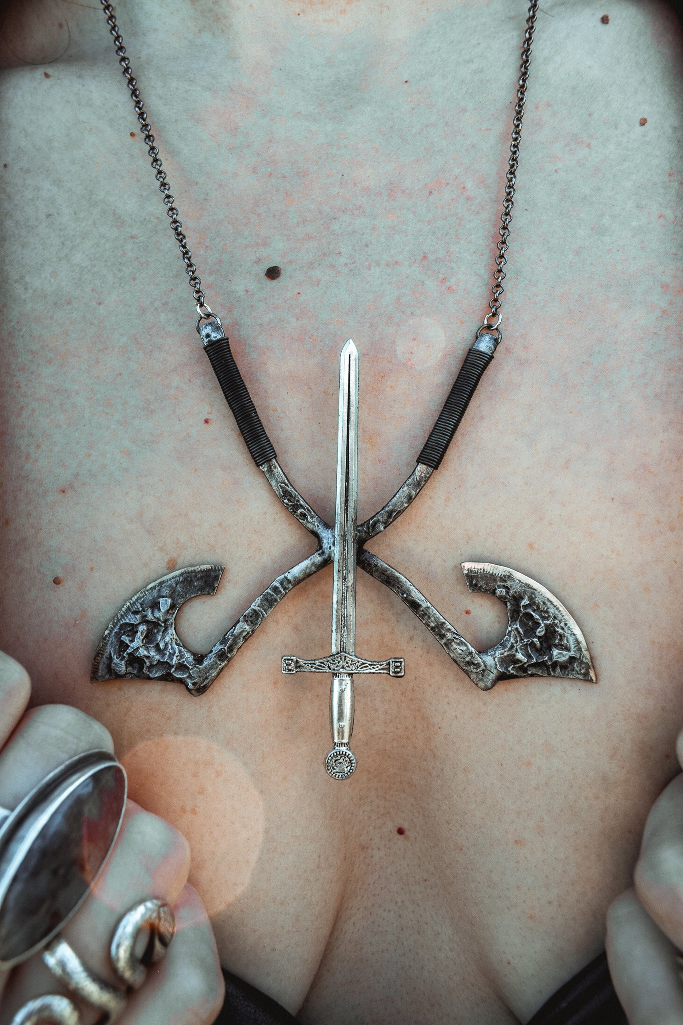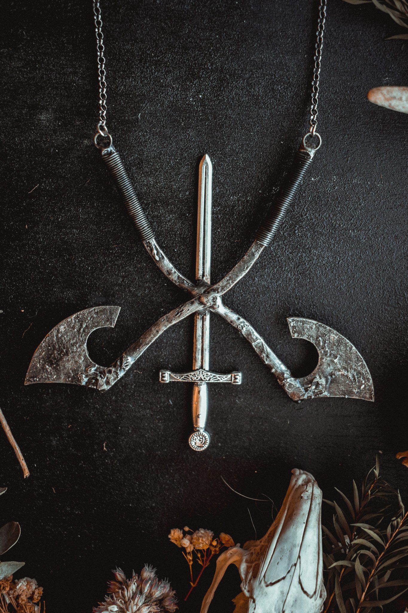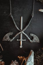 A necklace created with 2 handcrafted war axes crossed and adorned with an upside-down sword.