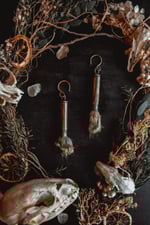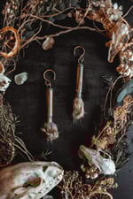 A pair of ear hangers created with salvaged rabbit fur and salvaged bullet shells. Made to wear through tunnels and stretched lobes.