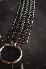 A necklace created with hand woven gunmetal chainmail and silver capped salvaged raccoon jaw bone.