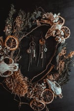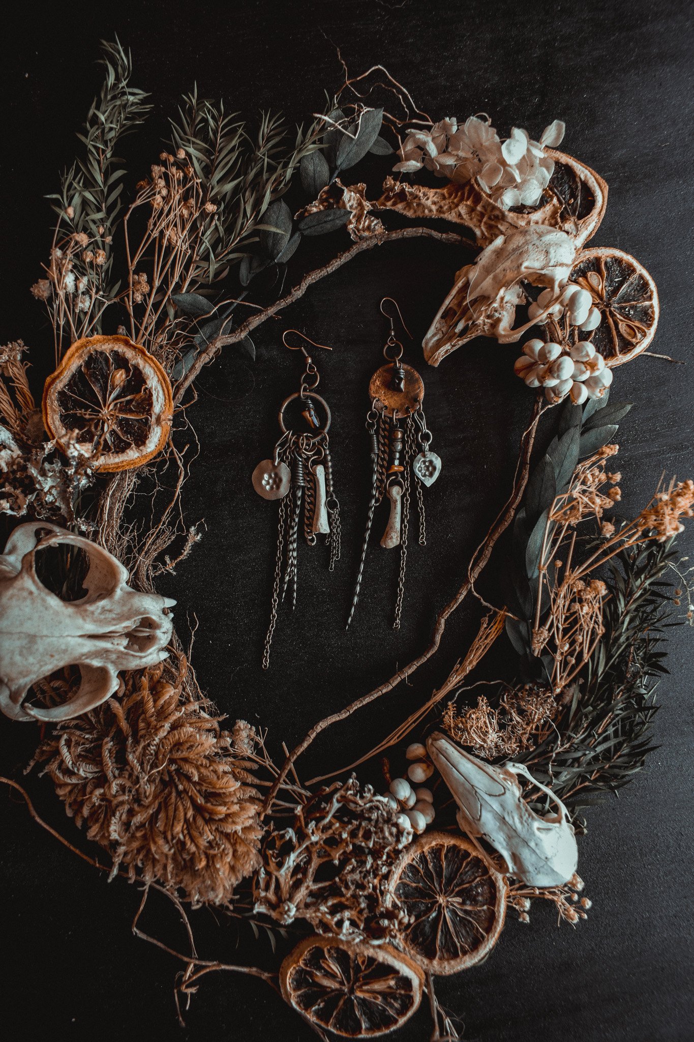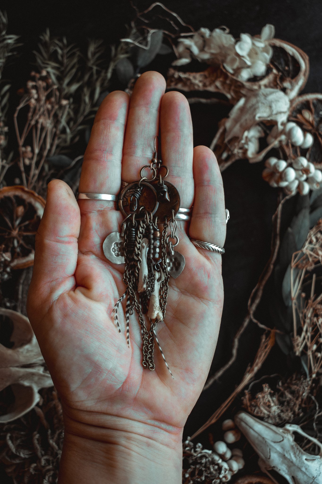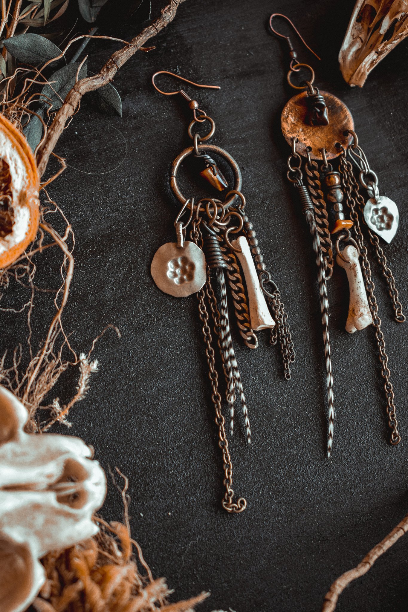 A pair of earrings created with copper, salvaged bones, grizzly feathers, vintage charms and chains.