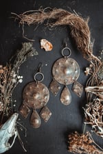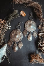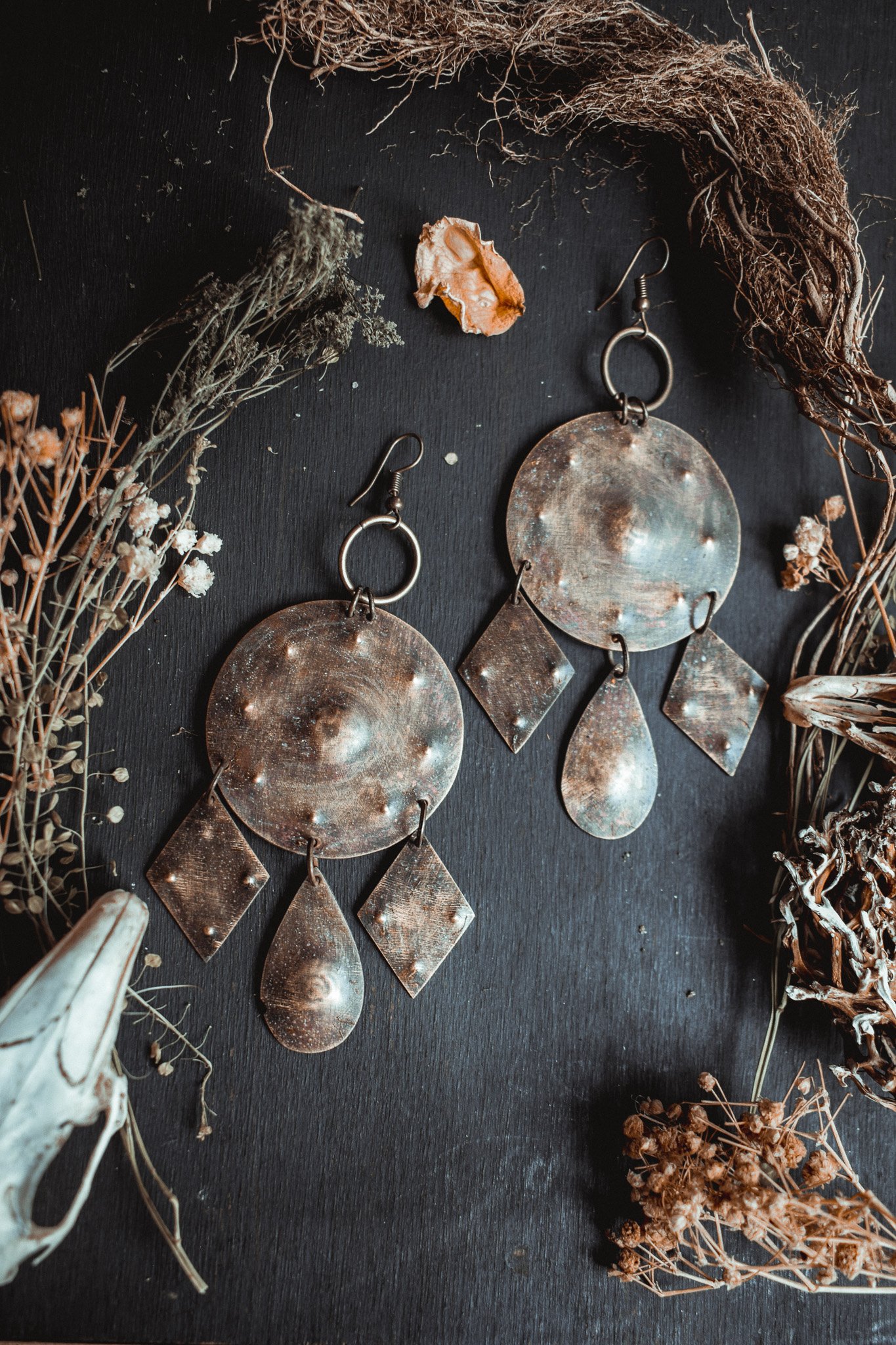 A pair of earrings made with hand cut brass that has been textured and given a rustic patina