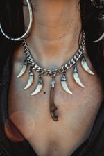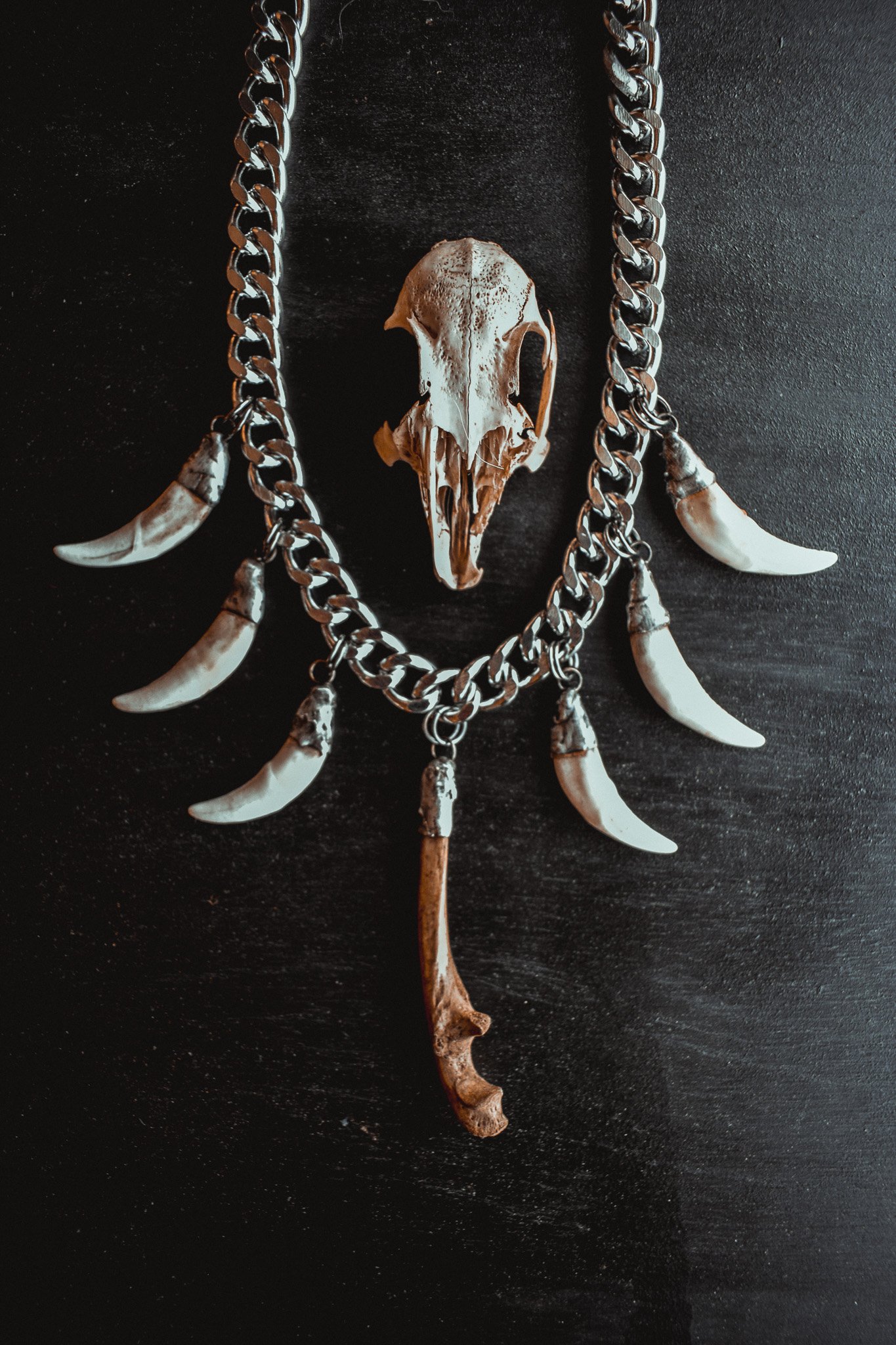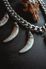 A large amulet created with steel curb chain adorned in silver capped teeth and bones.