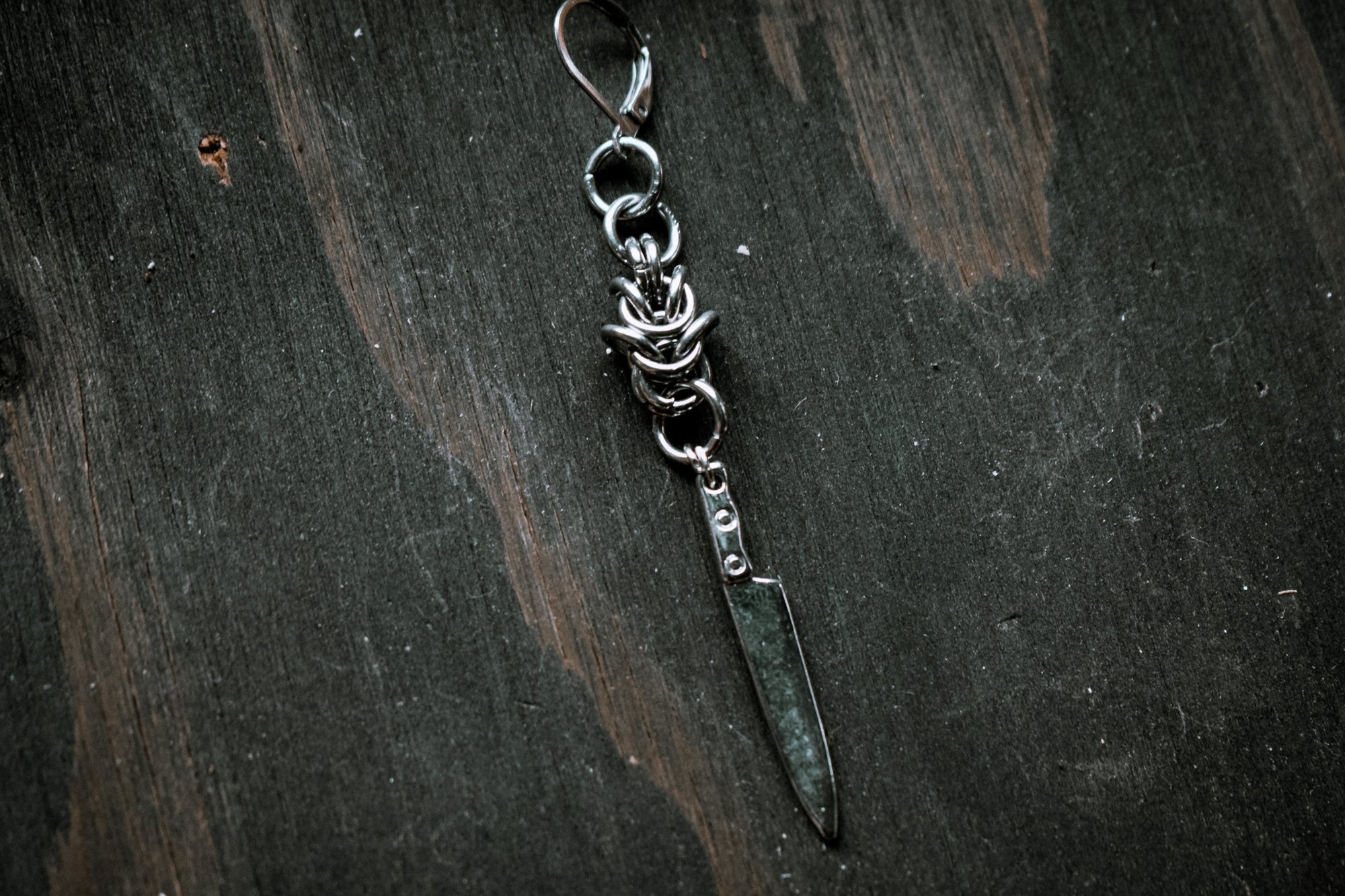 handmade single chainmail and knife charm earring