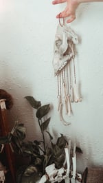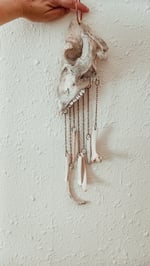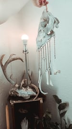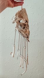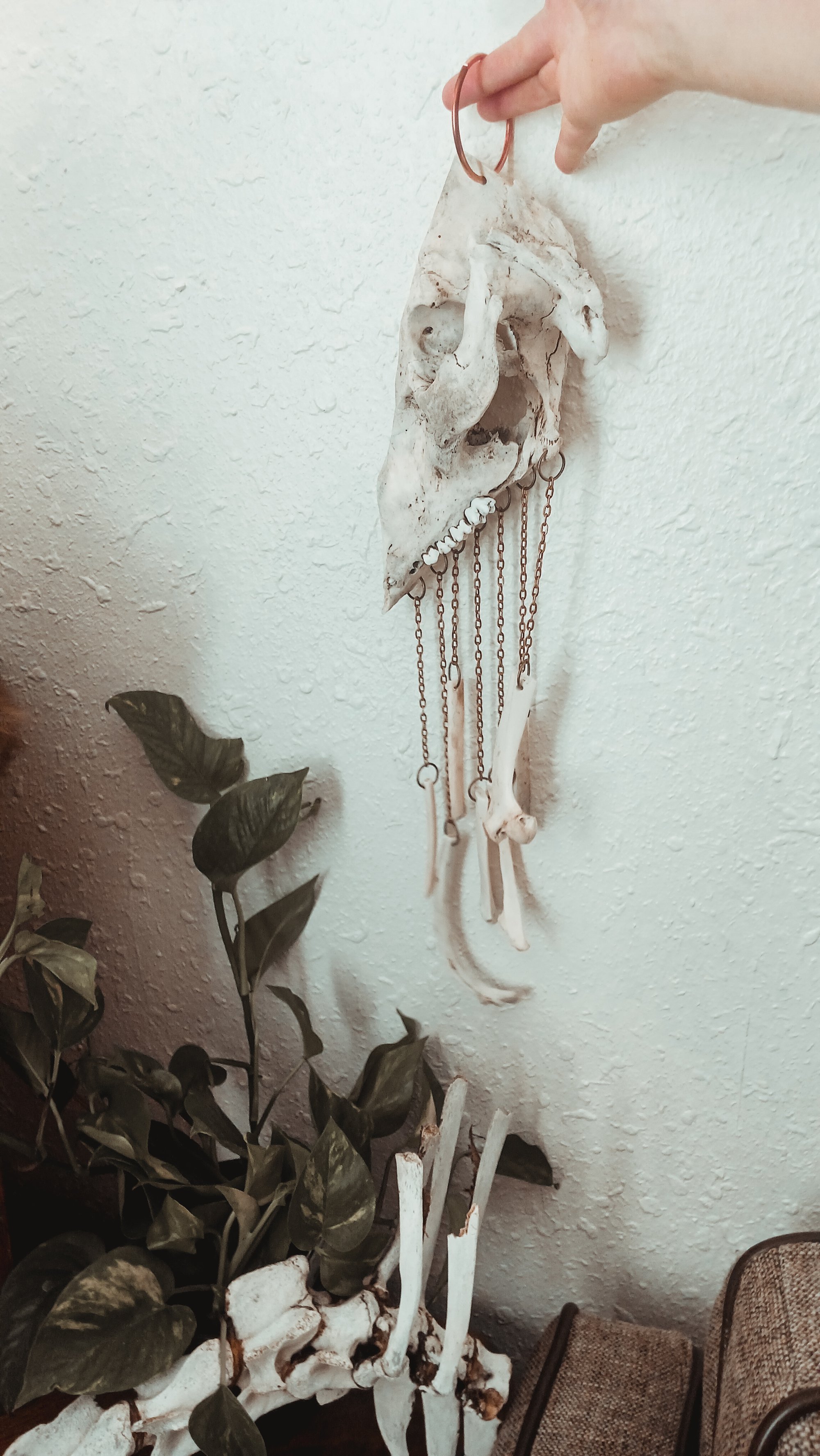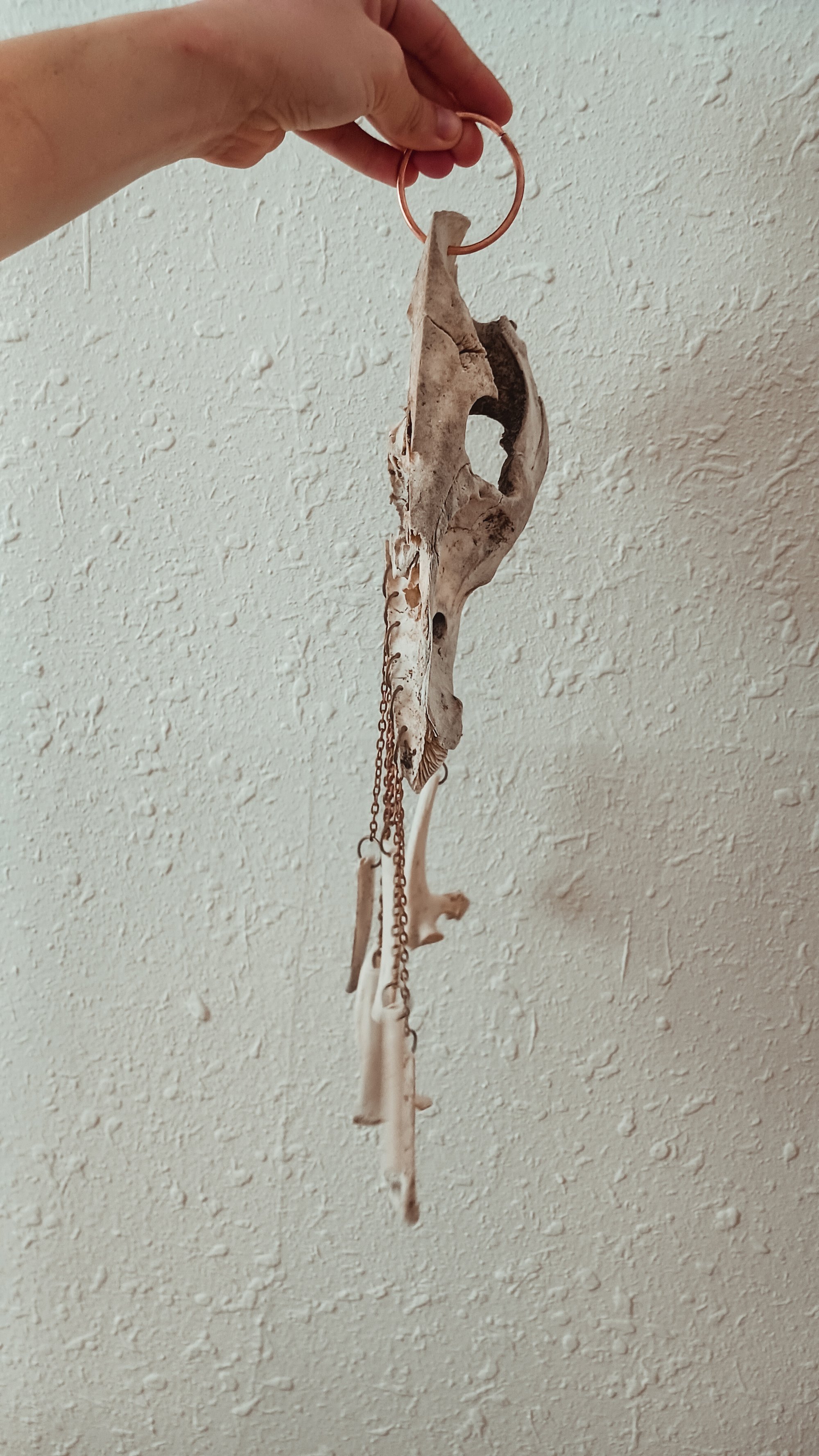 Bone chimes made with a salvaged sawed pig skull adorned in chains and rib fragments.