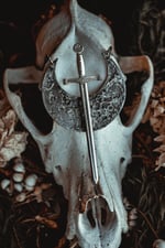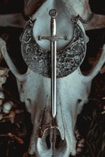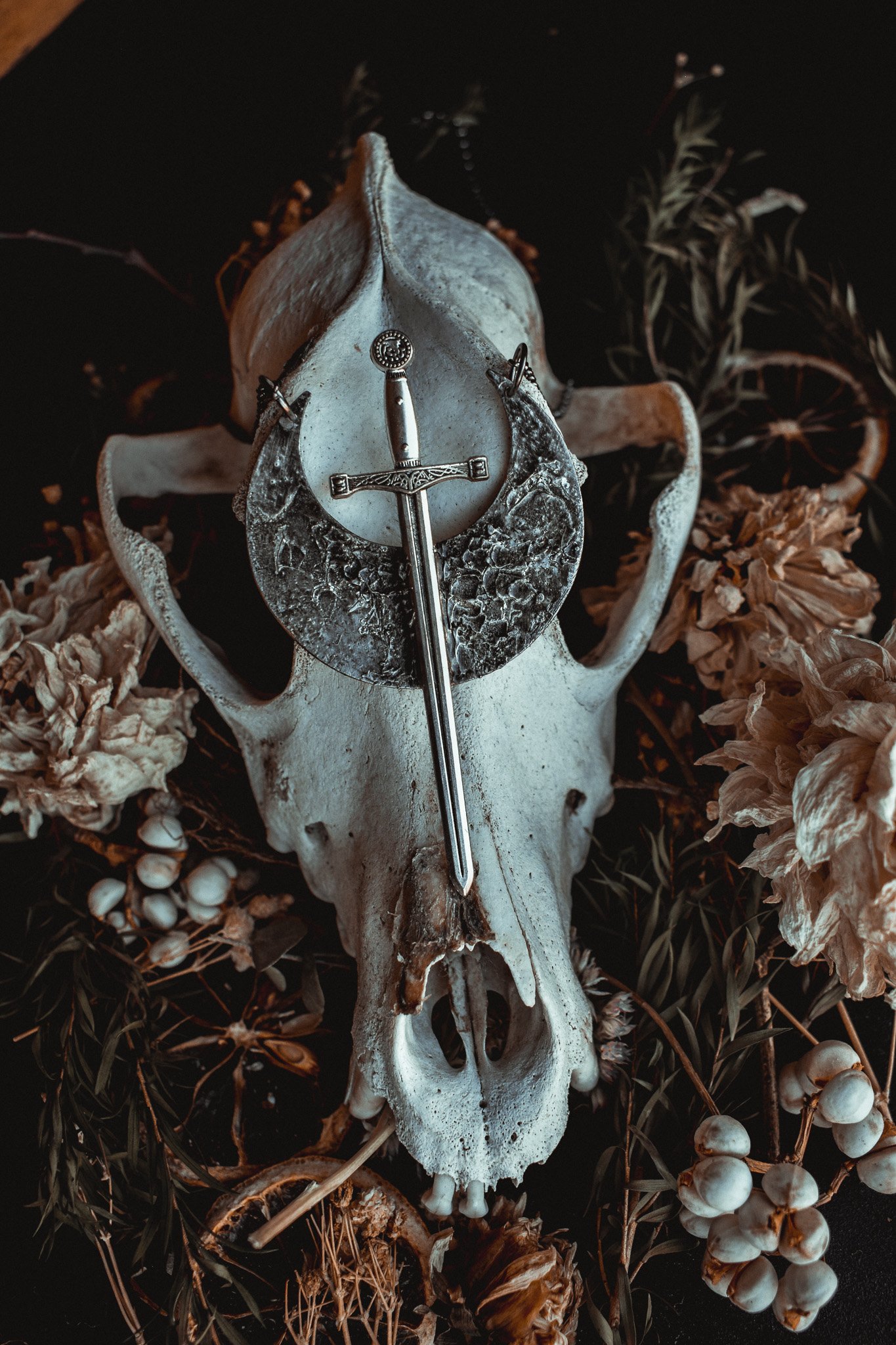 A necklace created with a hand cut brass moon adorned in silver and sword.