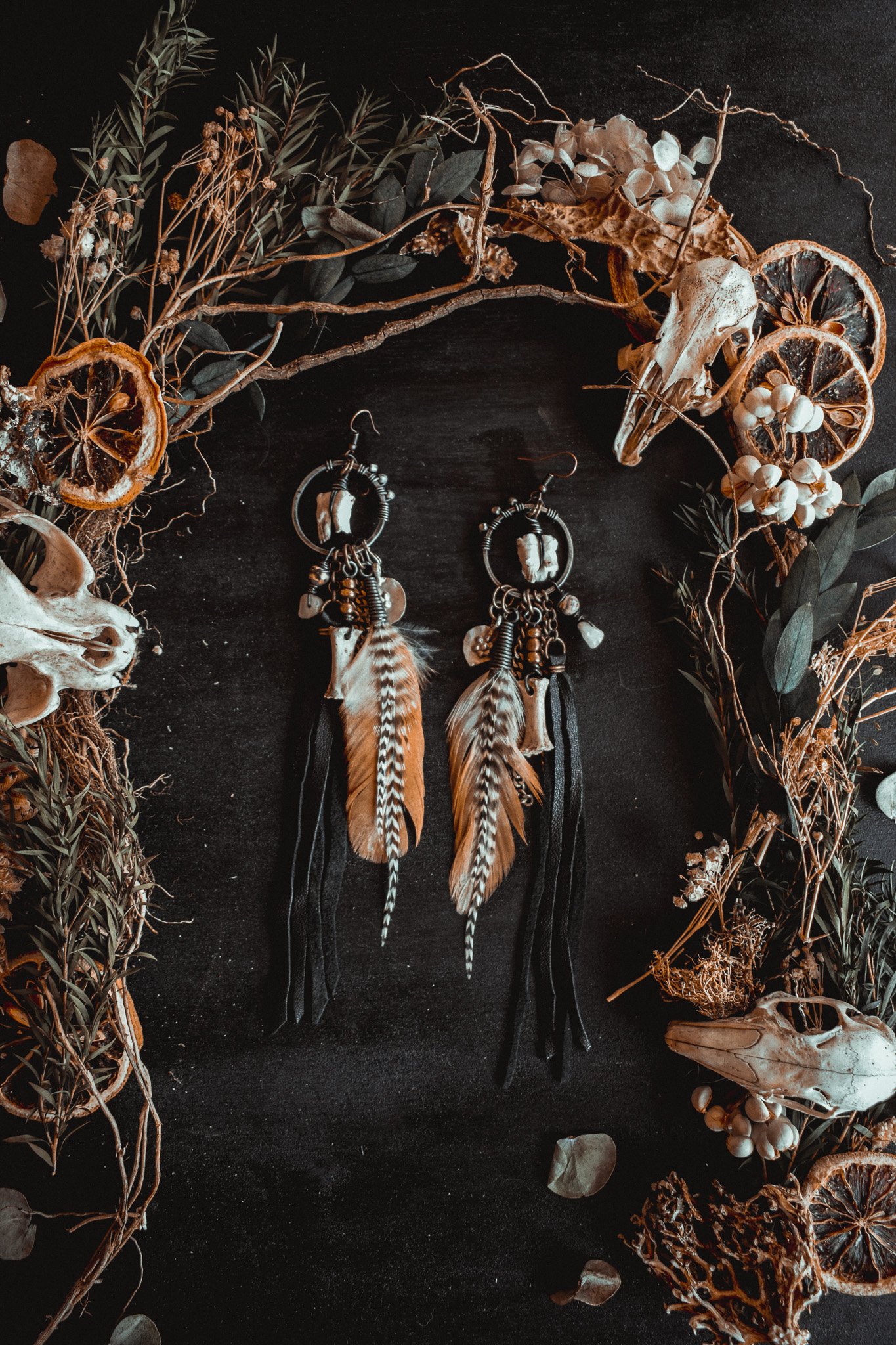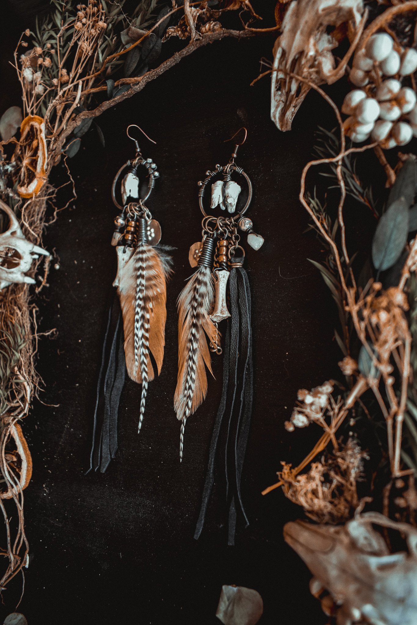 A pair of handcrafted earrings created with hammered wire, salvaged bones, secondhand feathers, leather, chain and various charms.