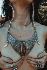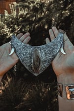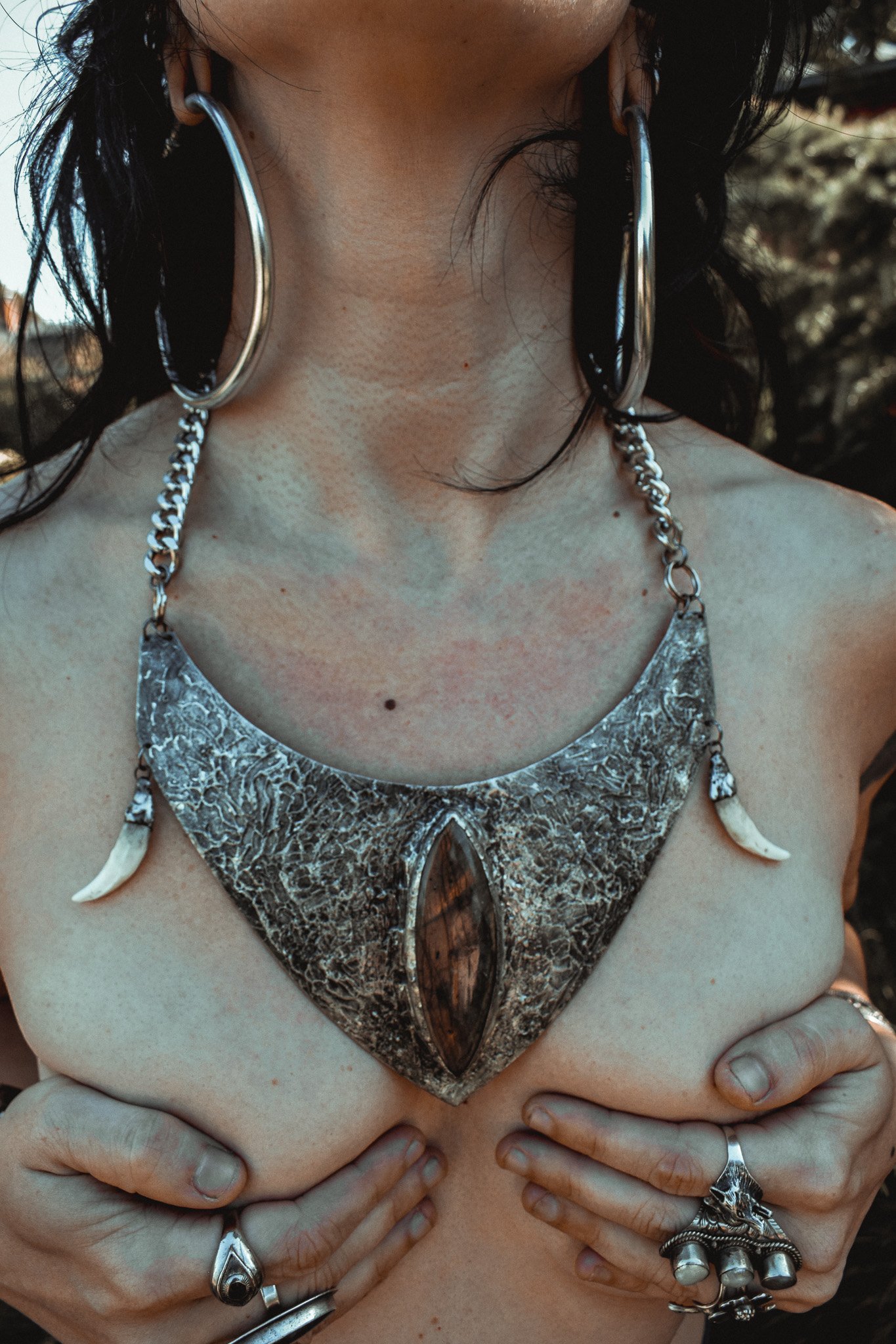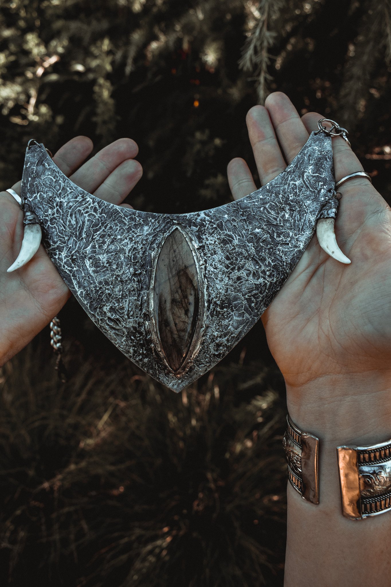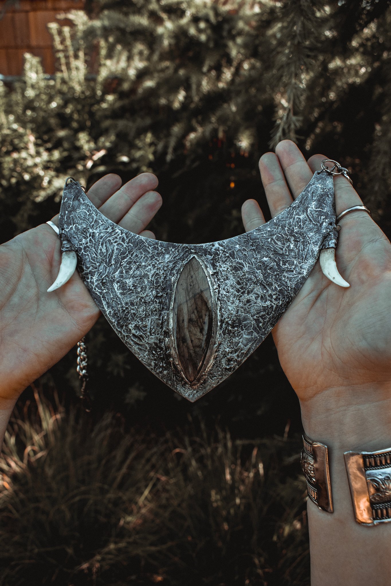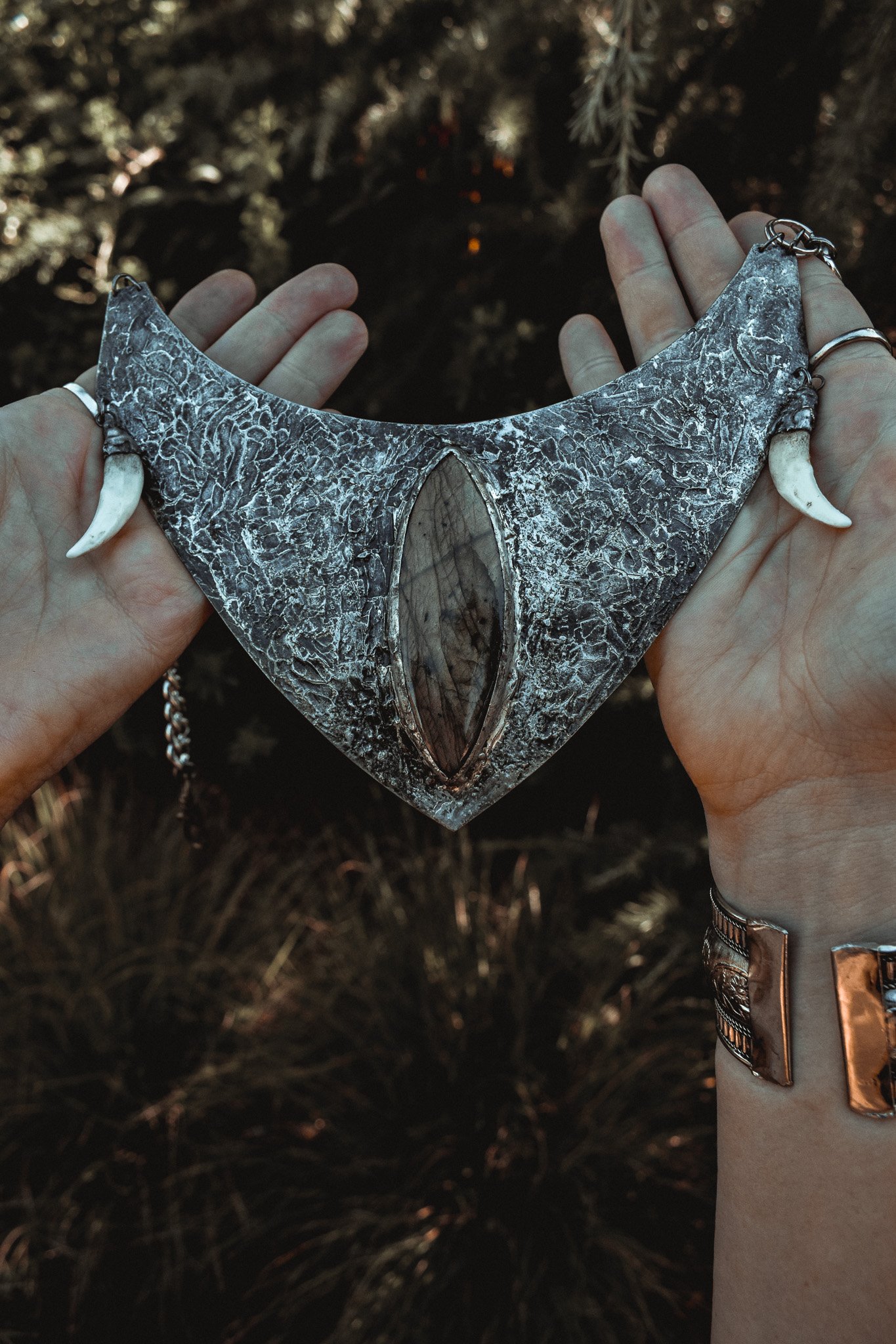 Large handcrafted gorget created with hand cut brass that has been covered in silver textures, large labradorite cabochon and silver capped fangs