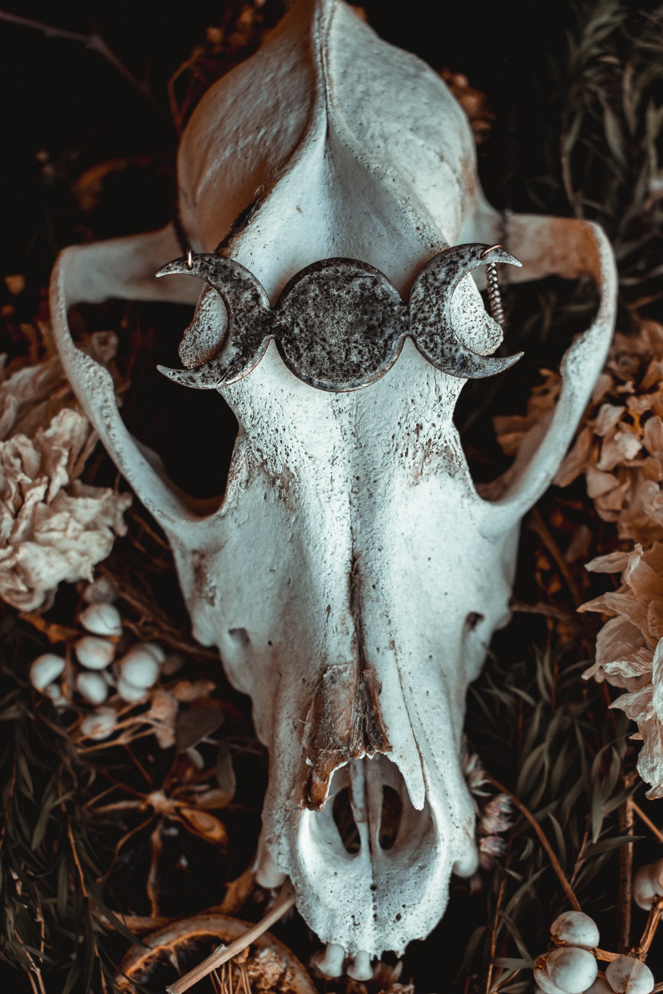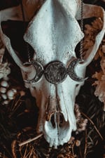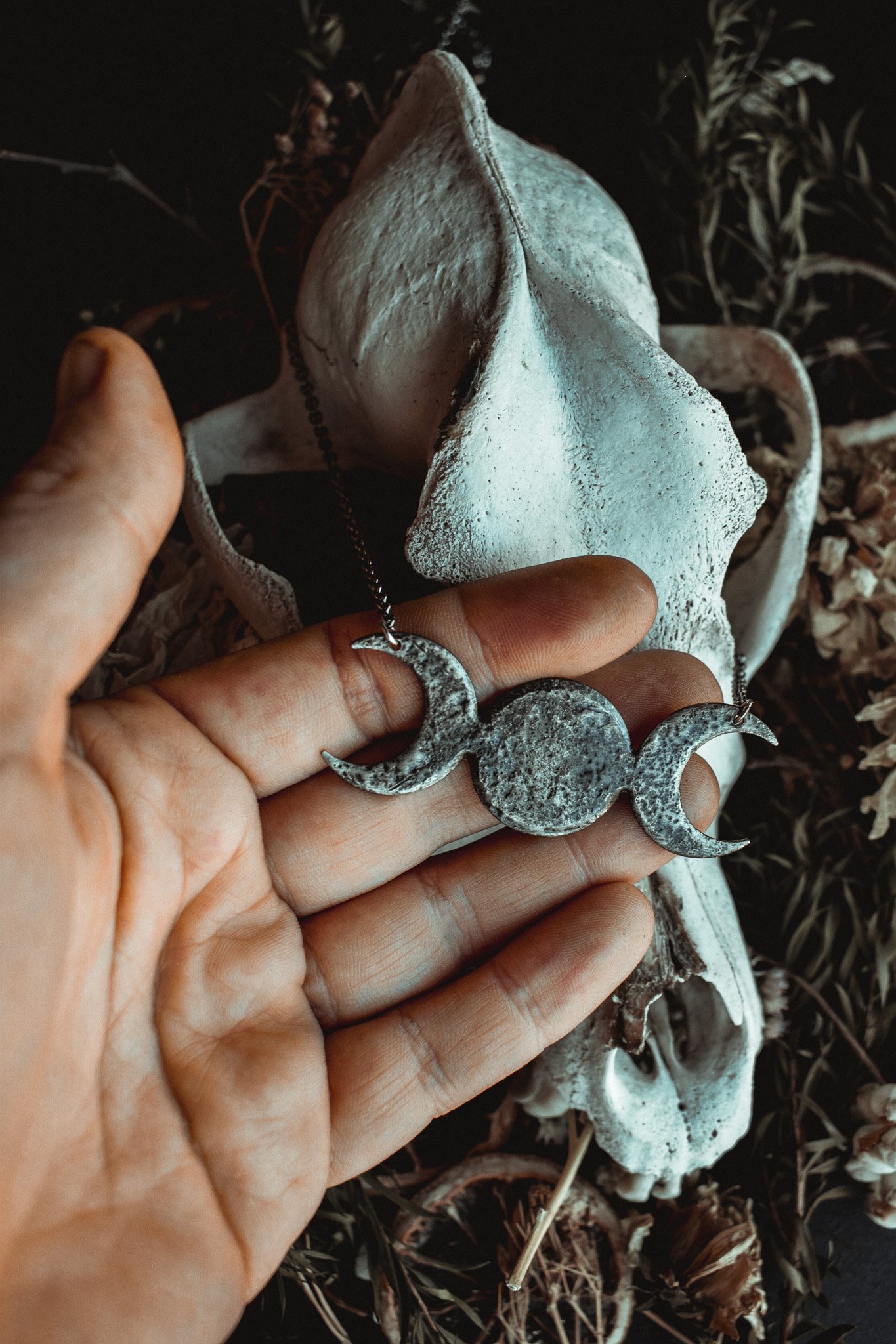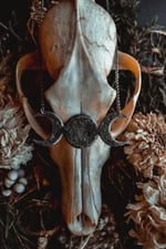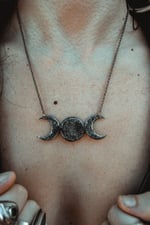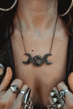 A necklace created with hand cut brass that has been adorned in silver textures.