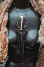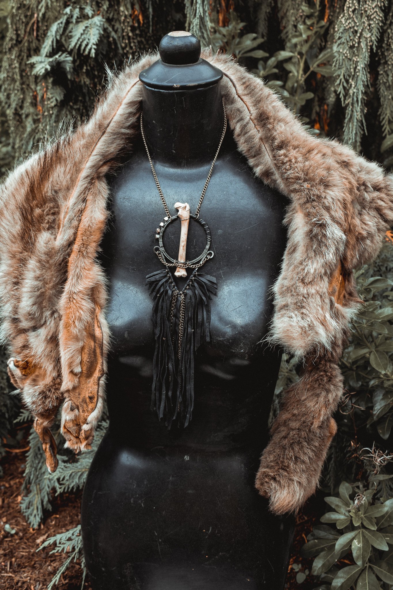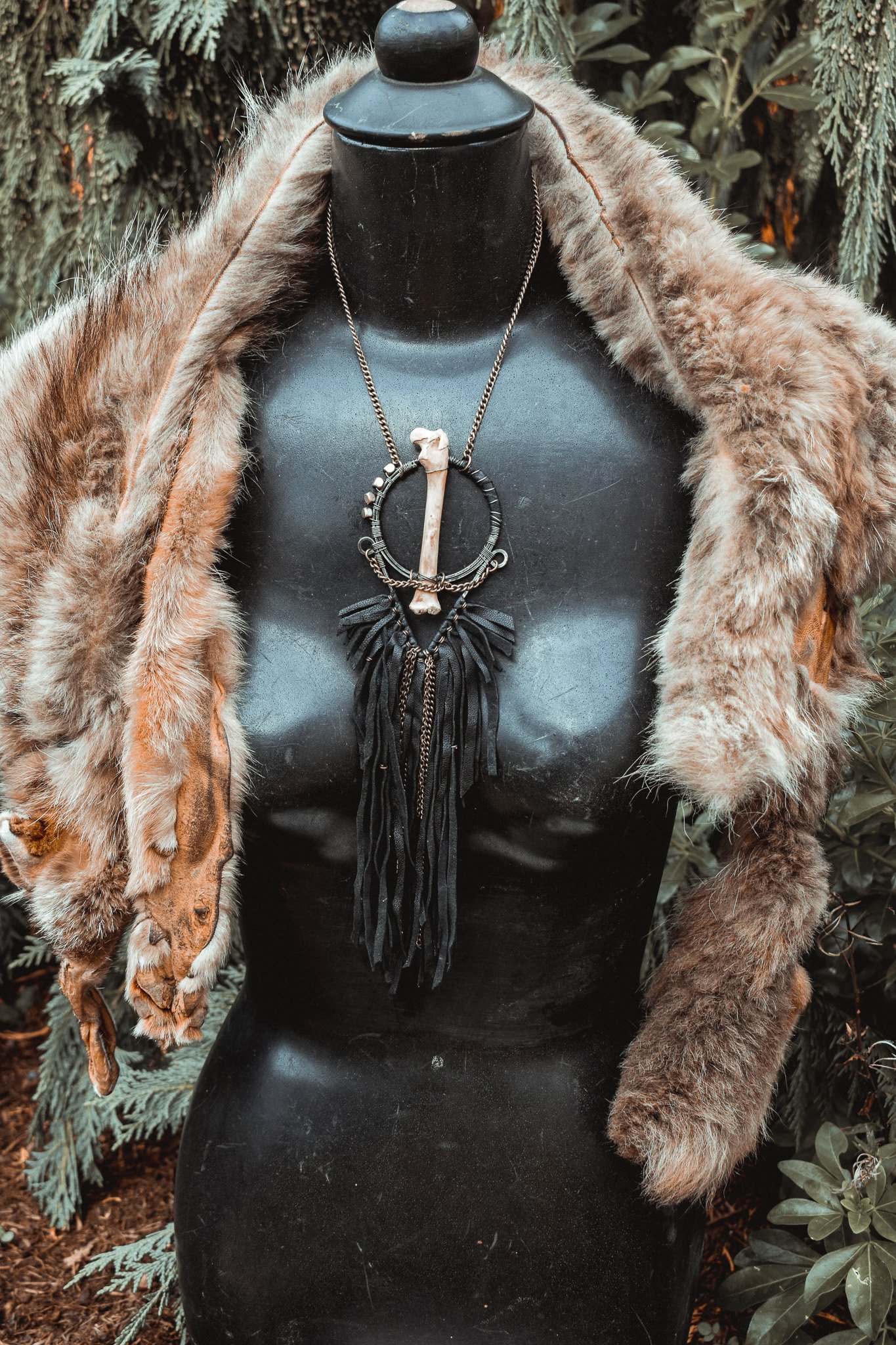 Necklace created with hammered wire, salvaged leather, salvaged bone and vintage metal beads