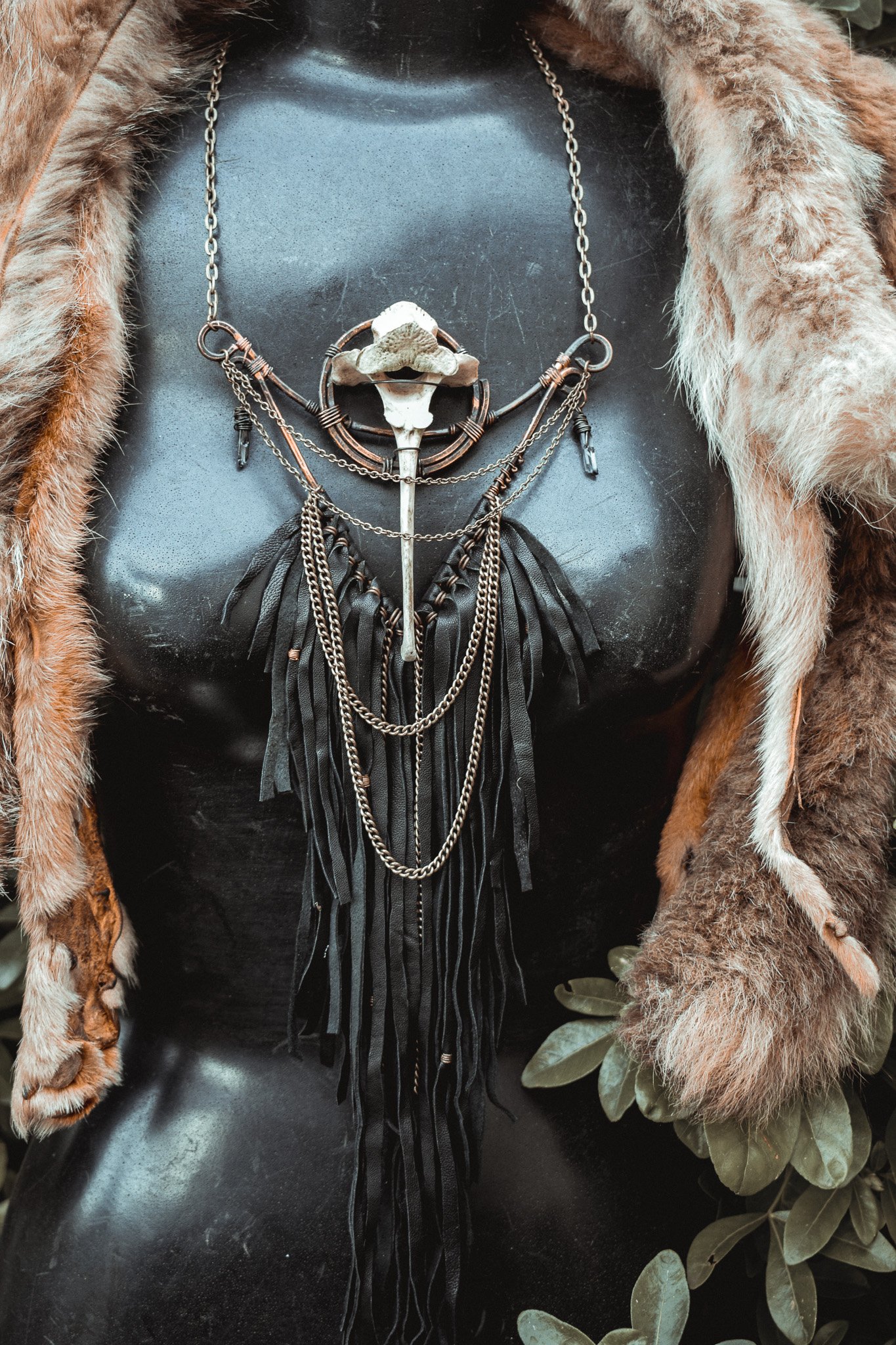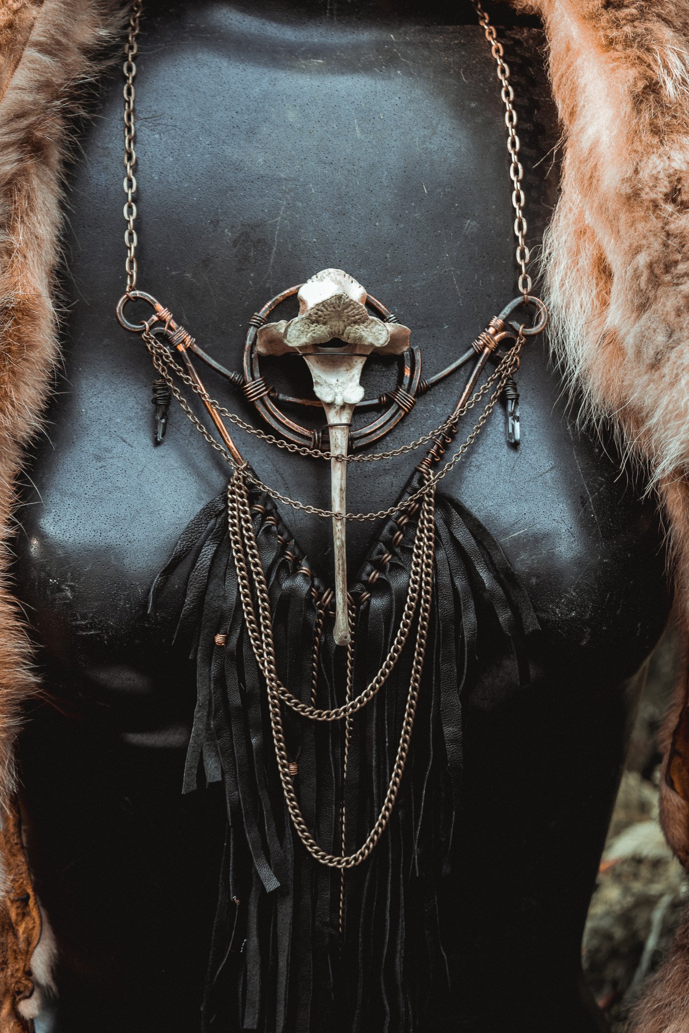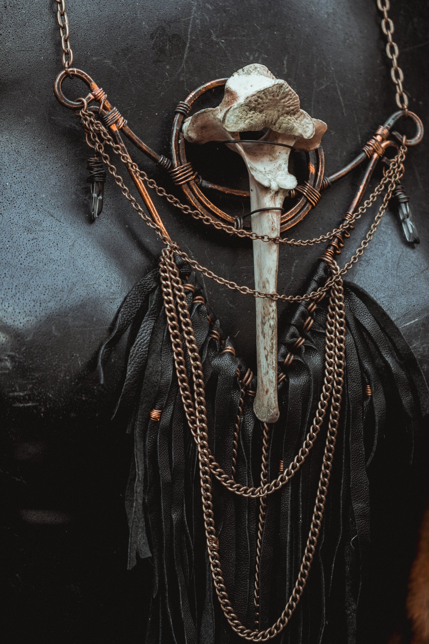 A large statement necklace created with hammered copper wire, secondhand leather, brass chains and salvaged deer vertebra