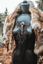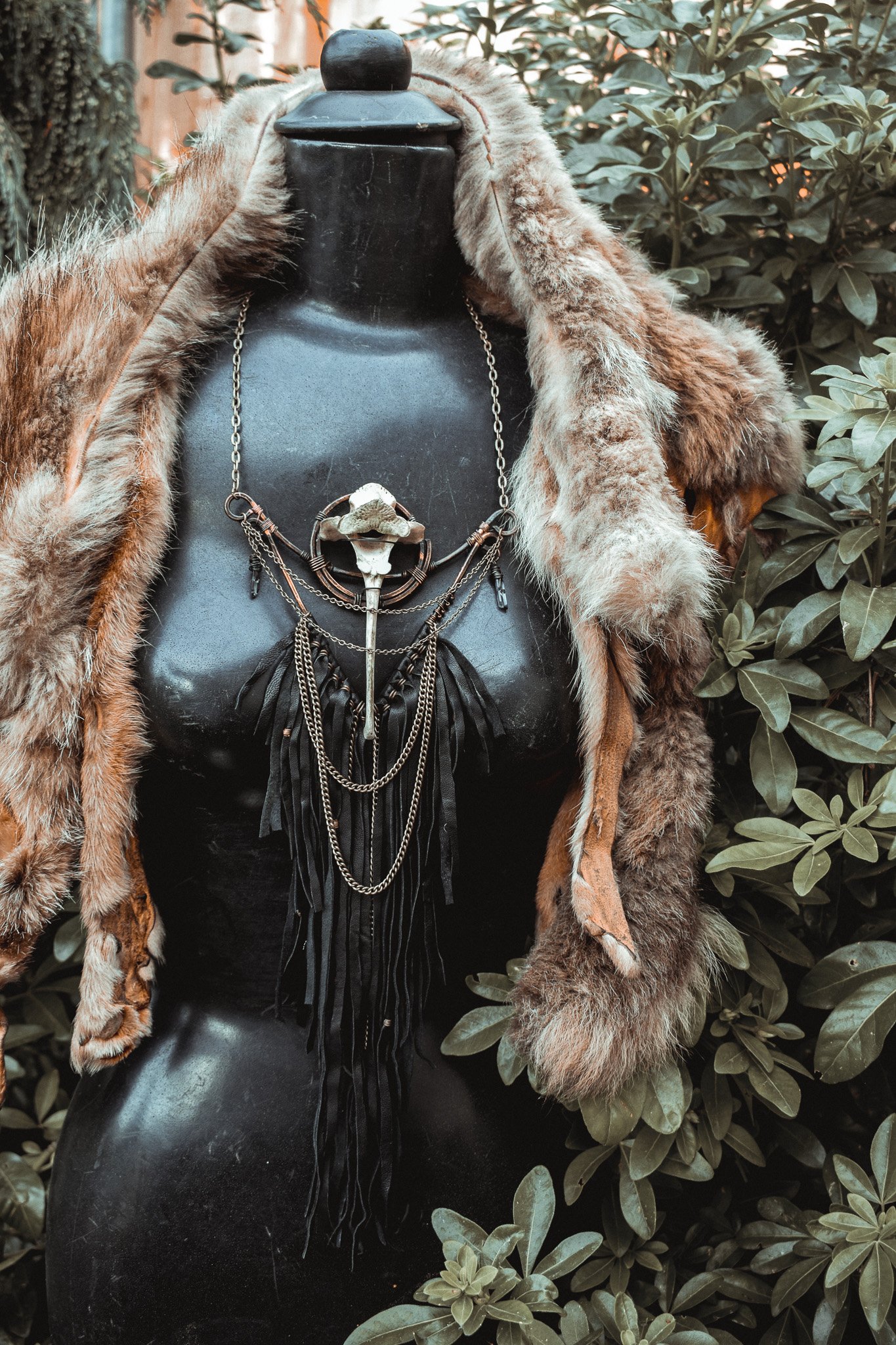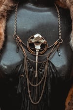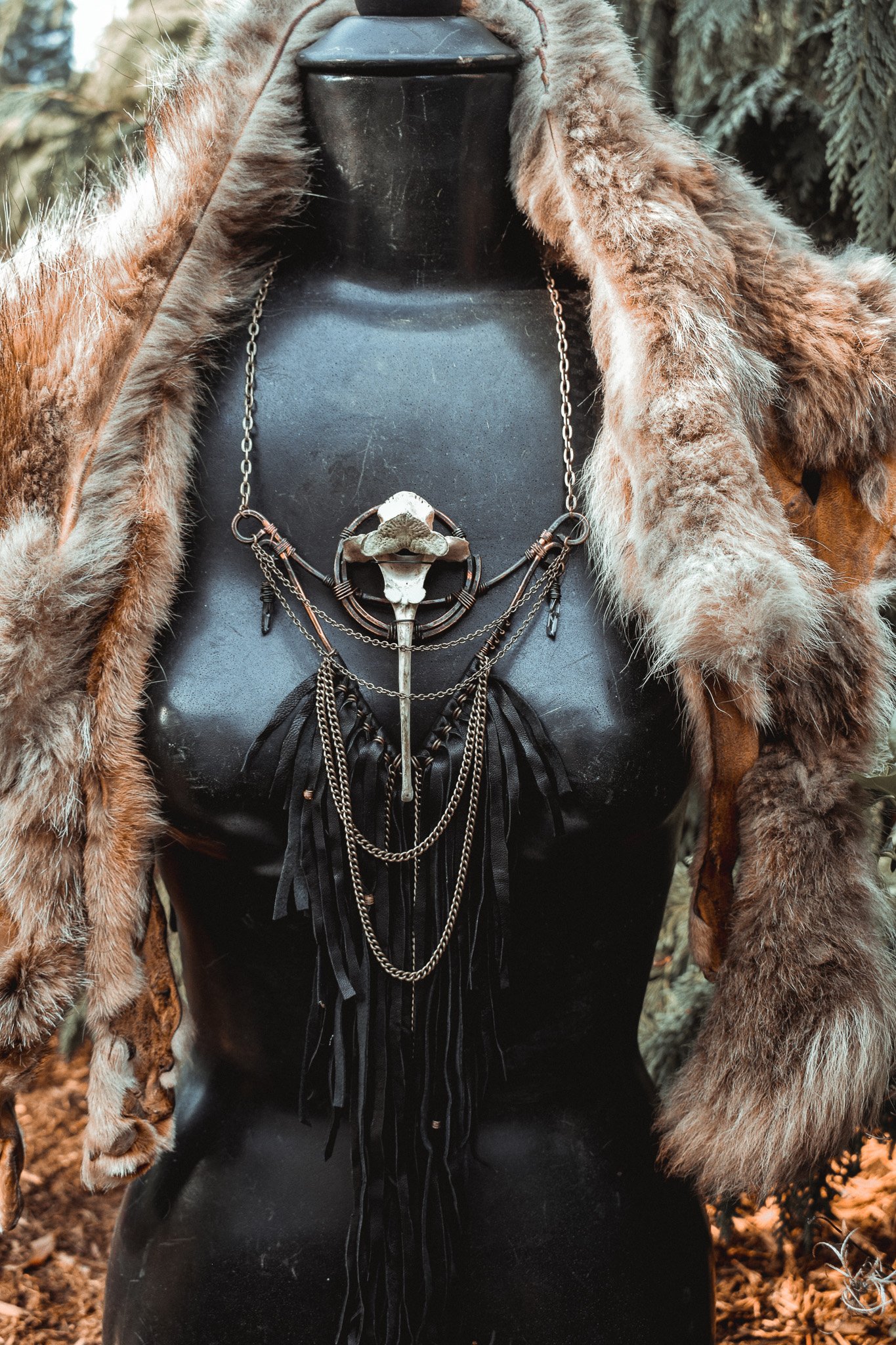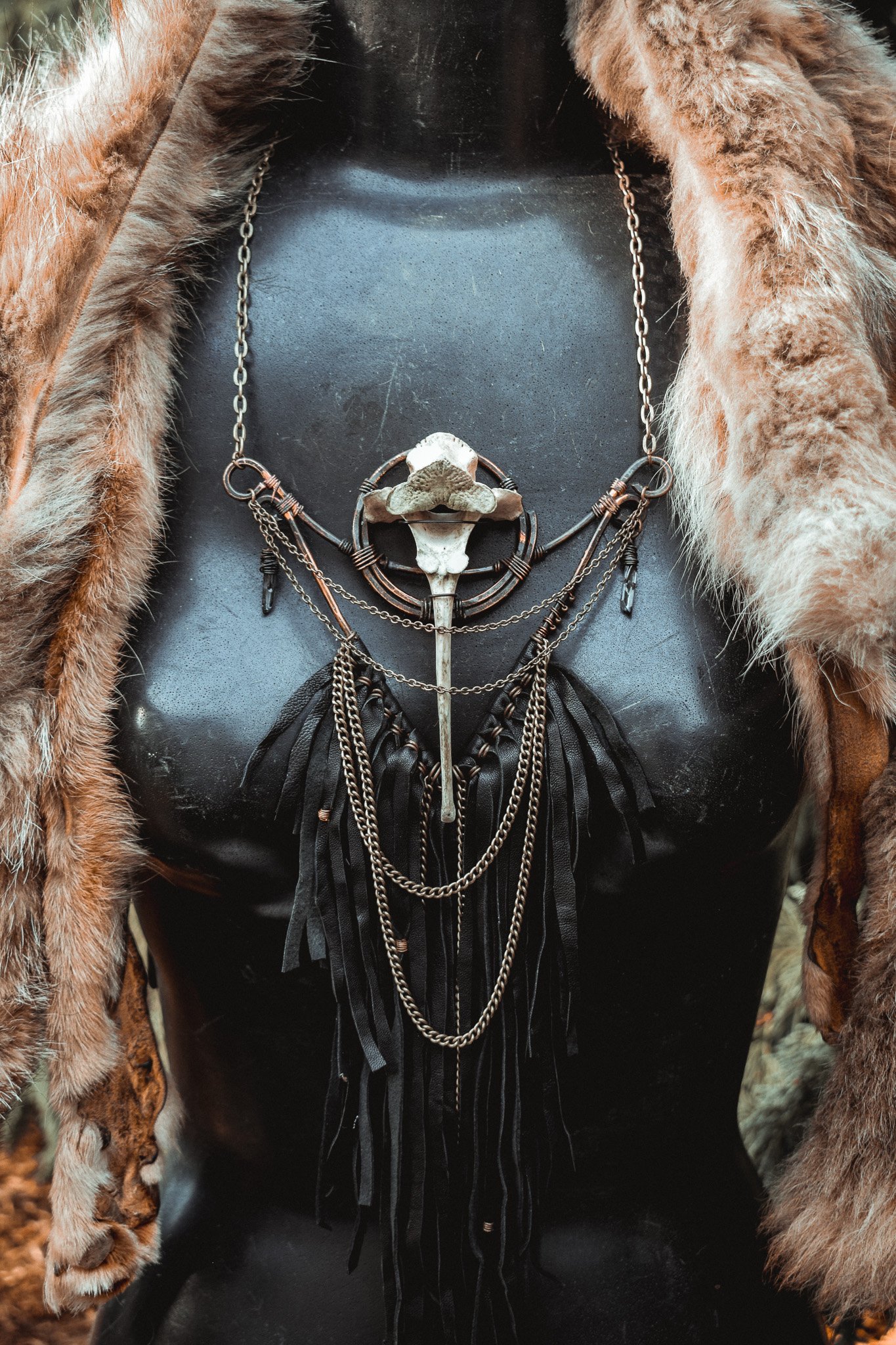 A large statement necklace created with hammered copper wire, secondhand leather, brass chains and salvaged deer vertebra