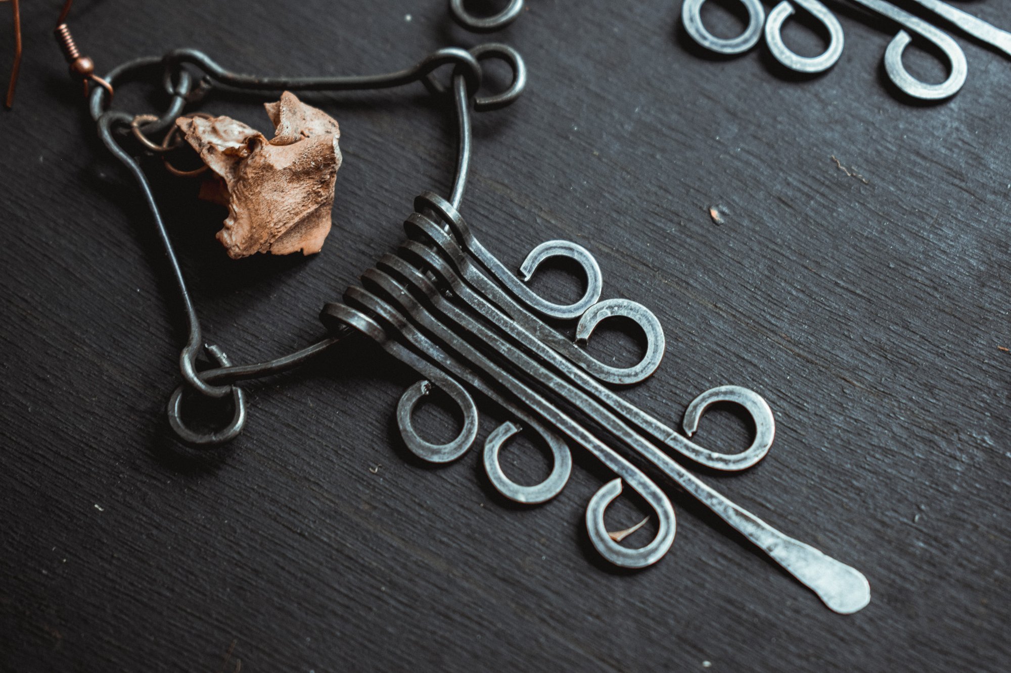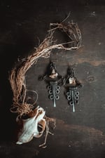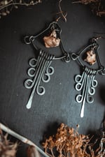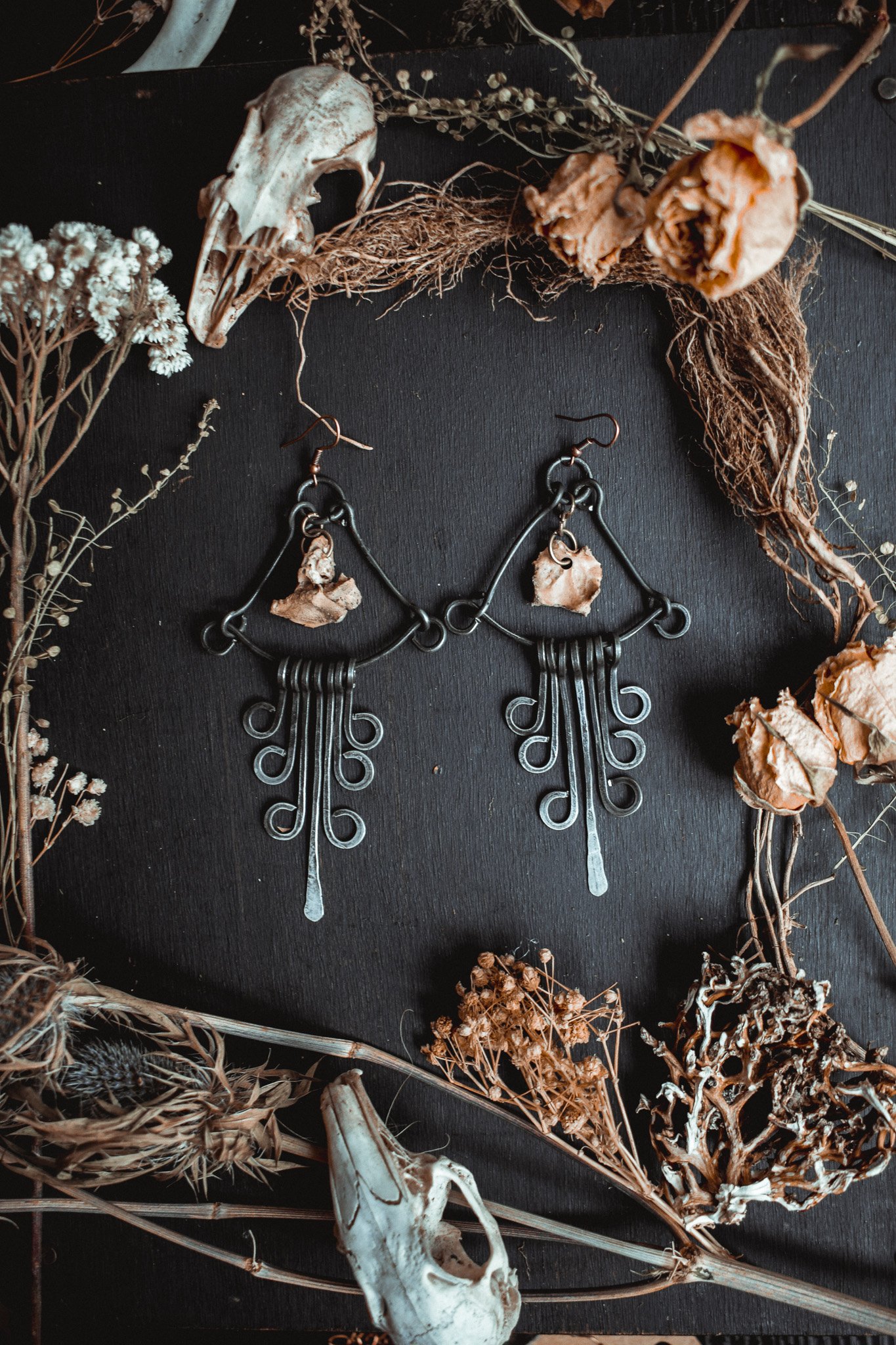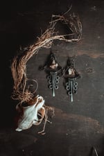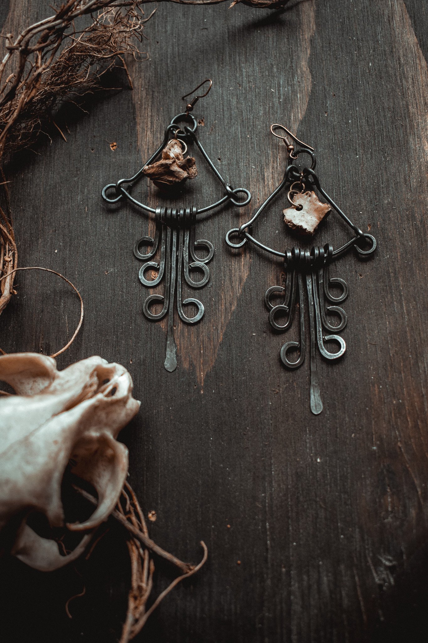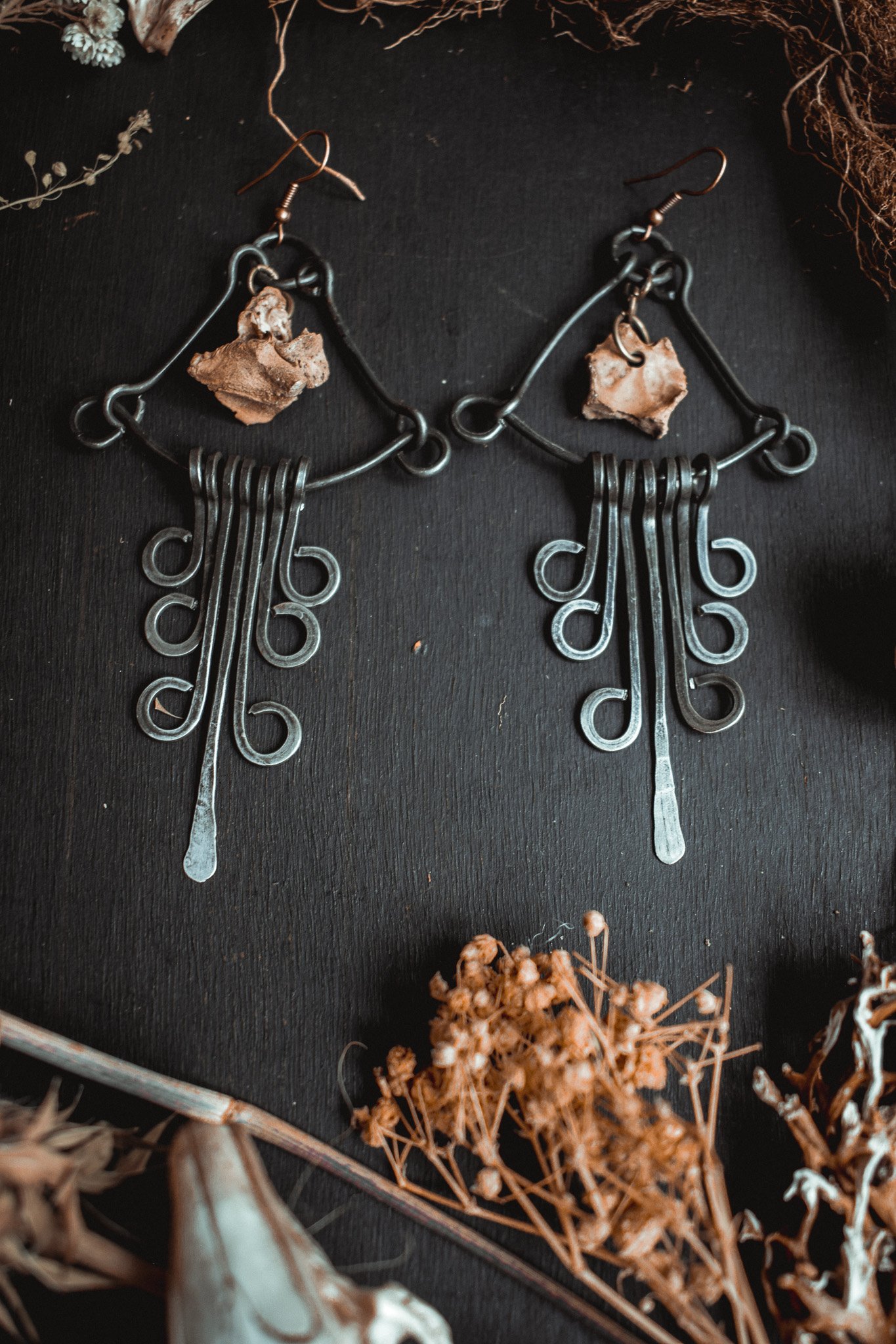 A pair of bone earrings created with salvaged bone and hammered wire.